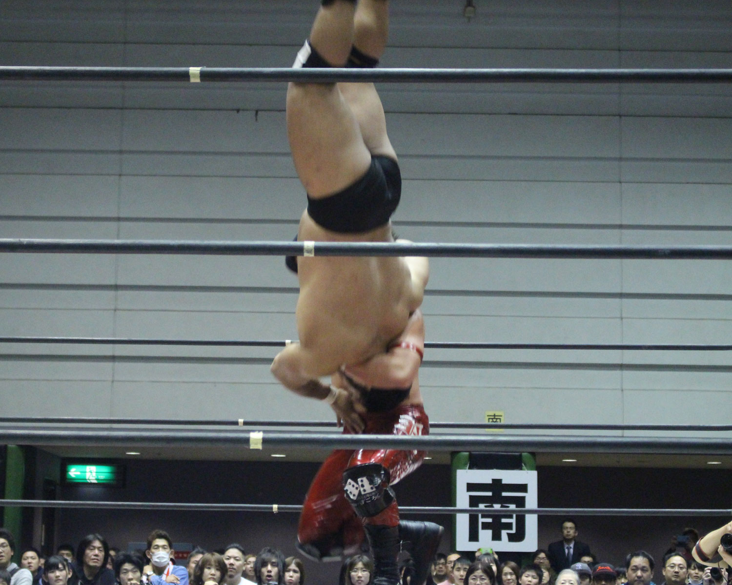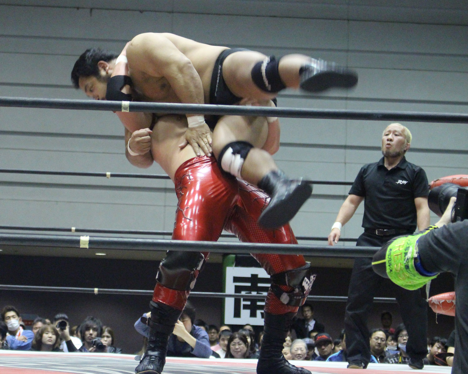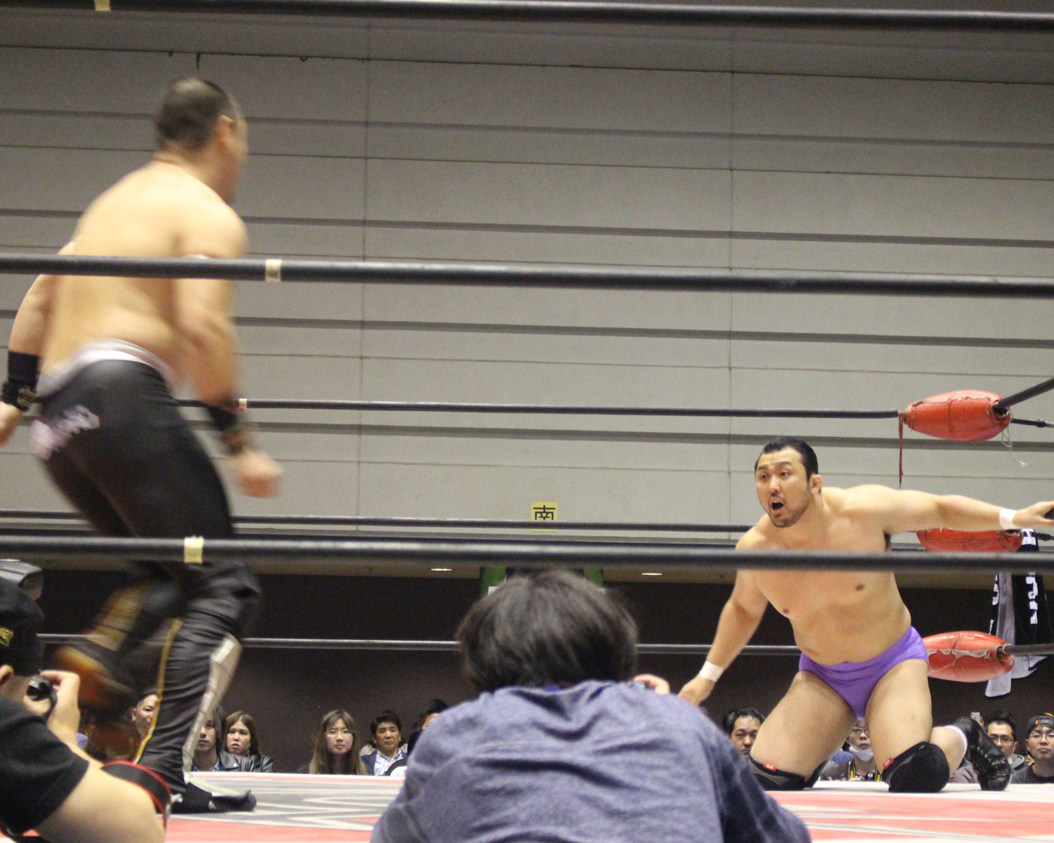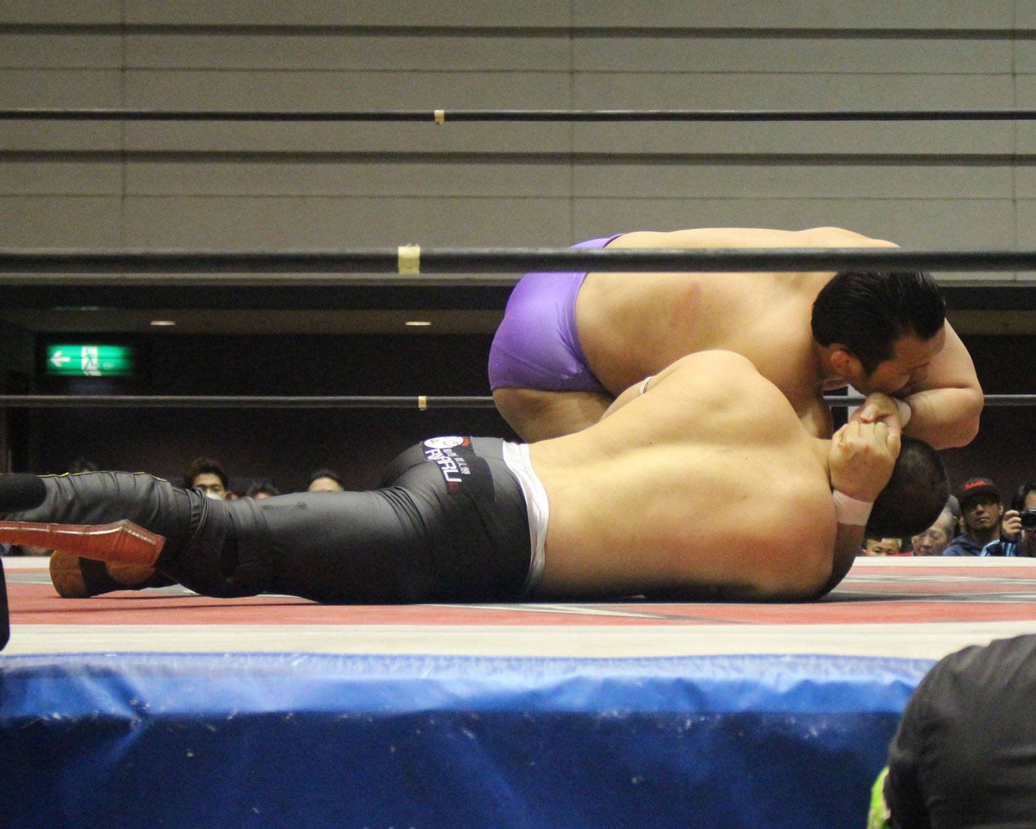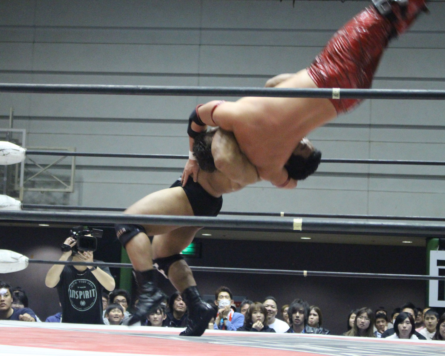 しかし河上のエルボーに対して、関本はラリアットで応戦すると、ボディースラムを連発してから逆エビ固めで捕獲、逆水平合戦も関本のサイドスープレックス狙いを河上がリバース、天龍コンポからのエクスプロイダー、羽折り固めと関本を絞めあげるも、関本はシュミット流バックブリーカーを決めると、フィニッシュとして使っているWXロックで捕獲して河上を追い詰める。