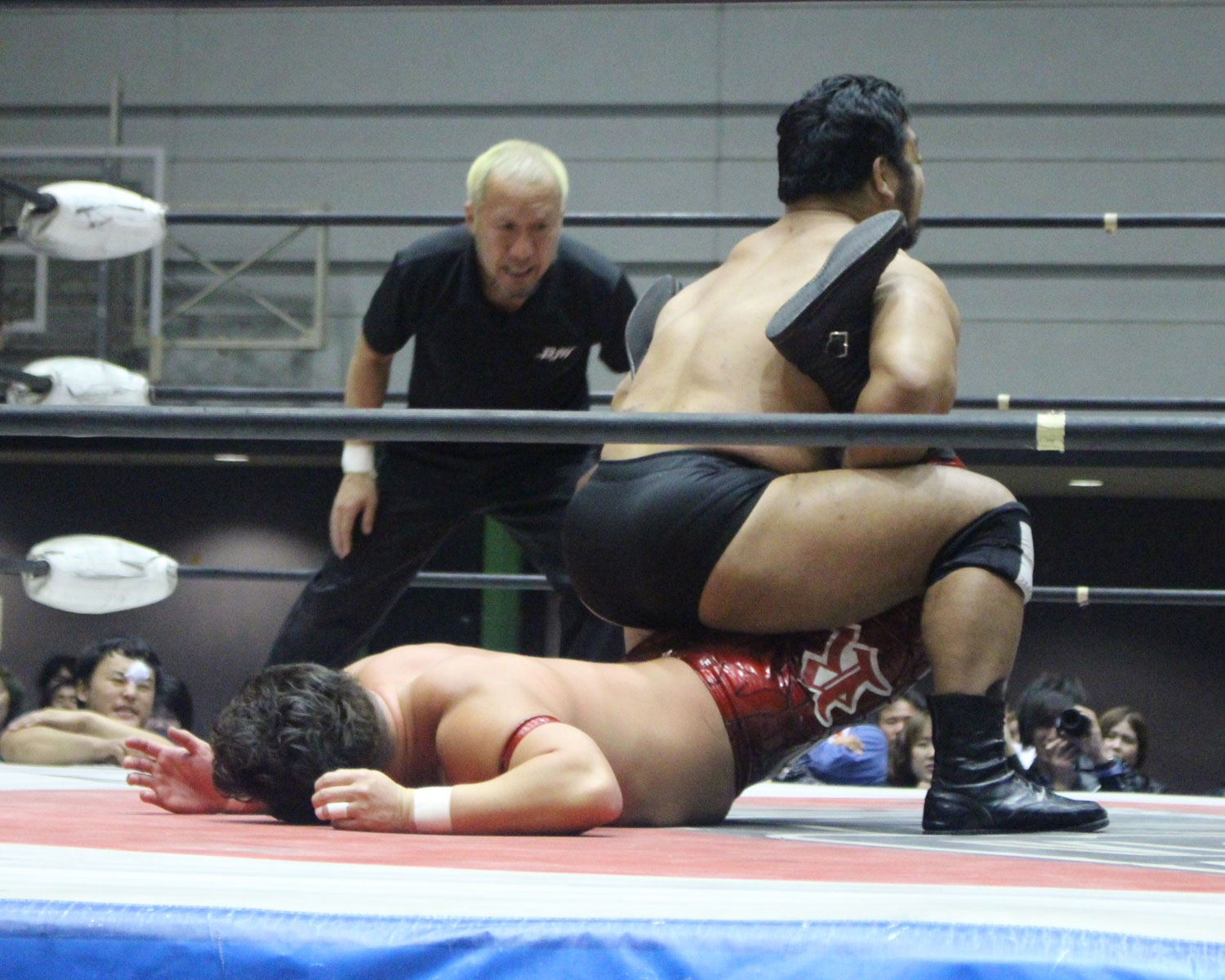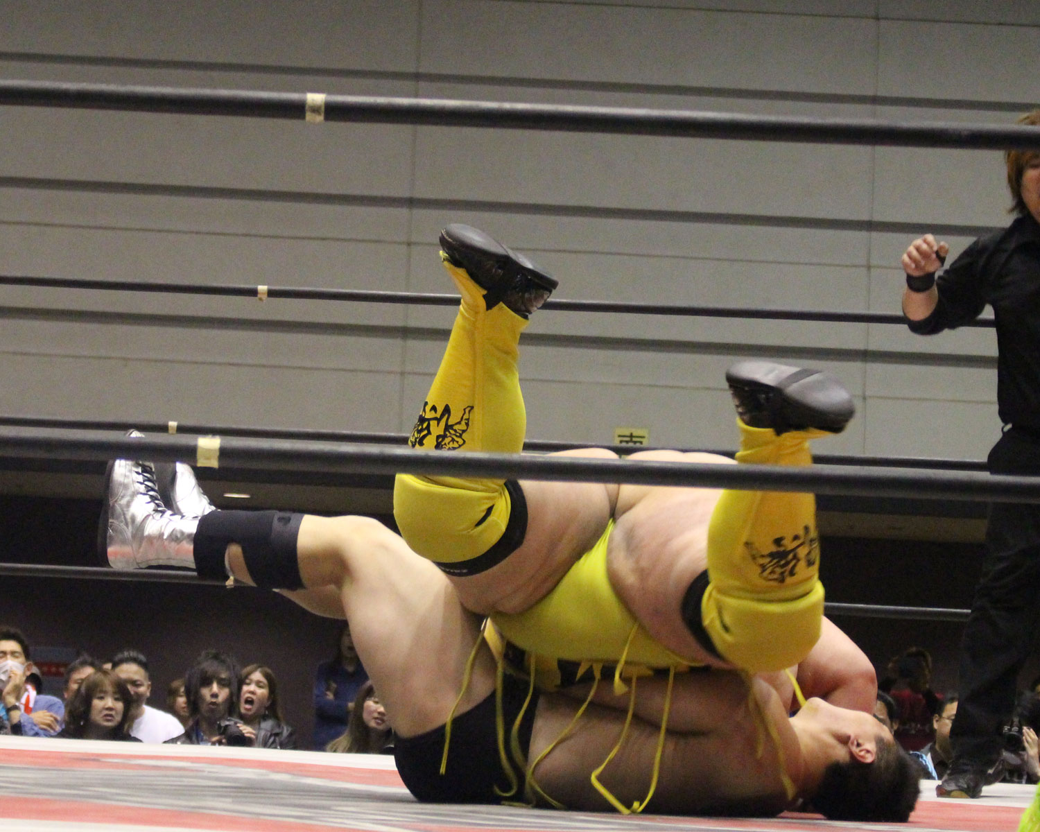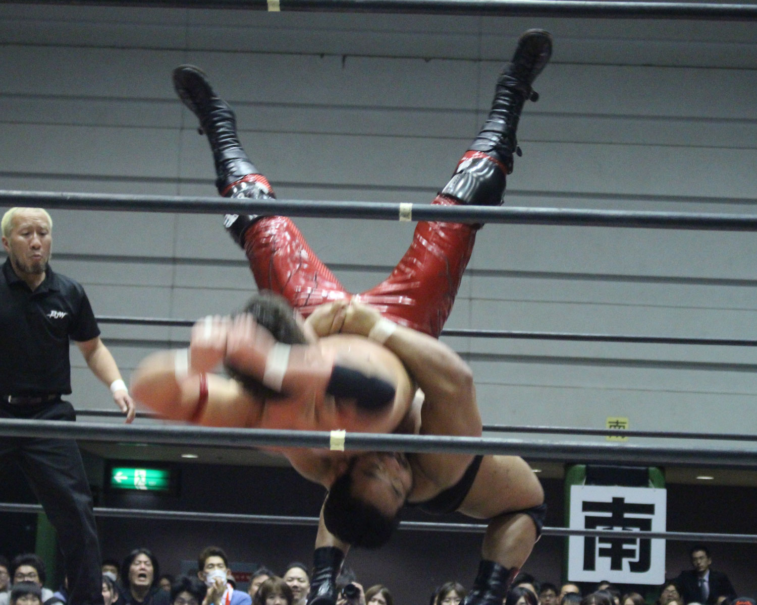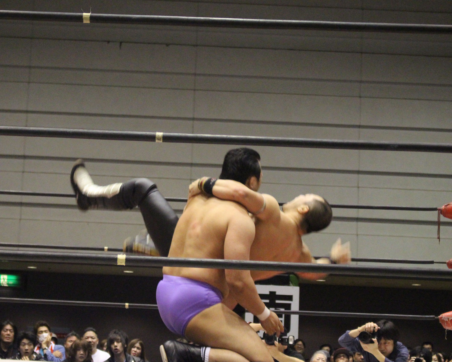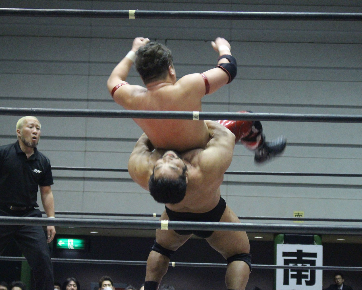 しかし河上のエルボーに対して、関本はラリアットで応戦すると、ボディースラムを連発してから逆エビ固めで捕獲、逆水平合戦も関本のサイドスープレックス狙いを河上がリバース、天龍コンポからのエクスプロイダー、羽折り固めと関本を絞めあげるも、関本はシュミット流バックブリーカーを決めると、フィニッシュとして使っているWXロックで捕獲して河上を追い詰める。