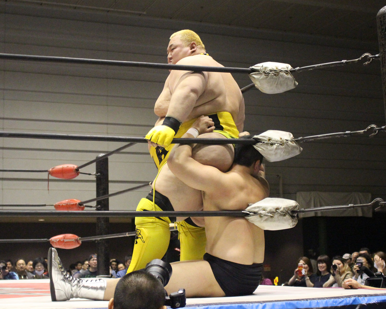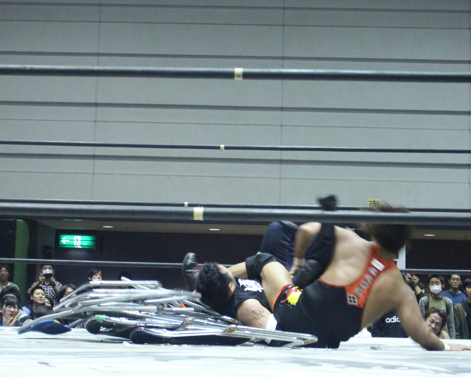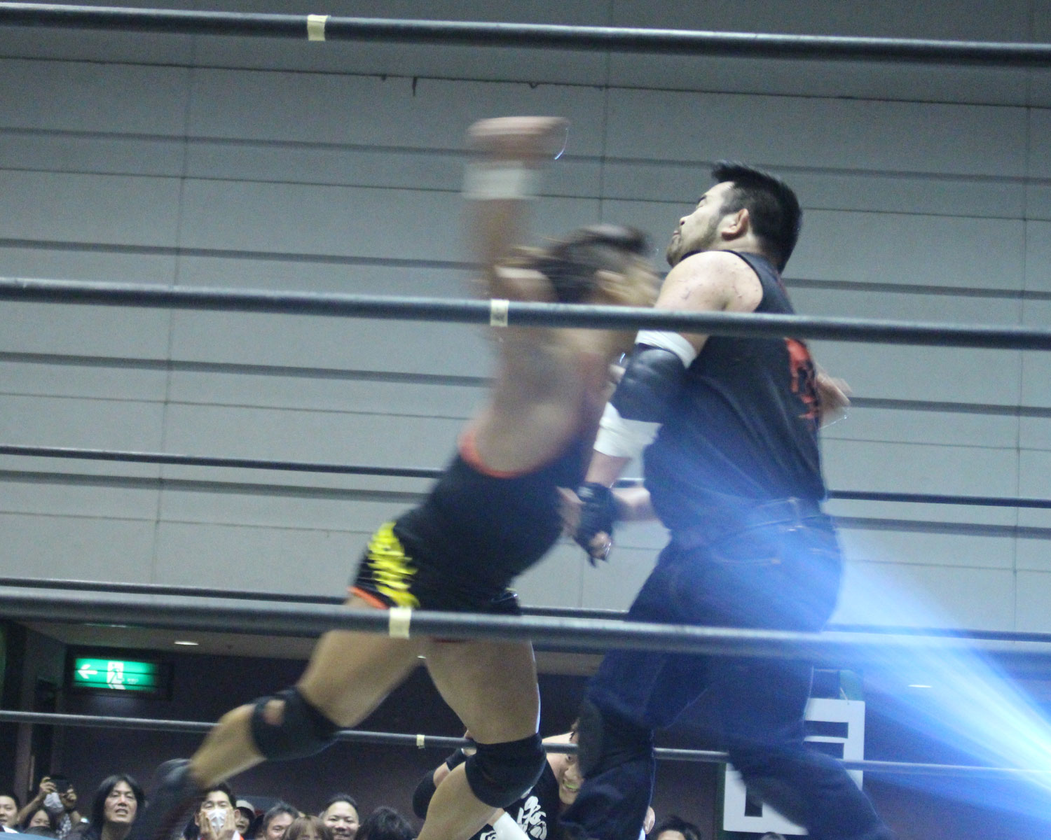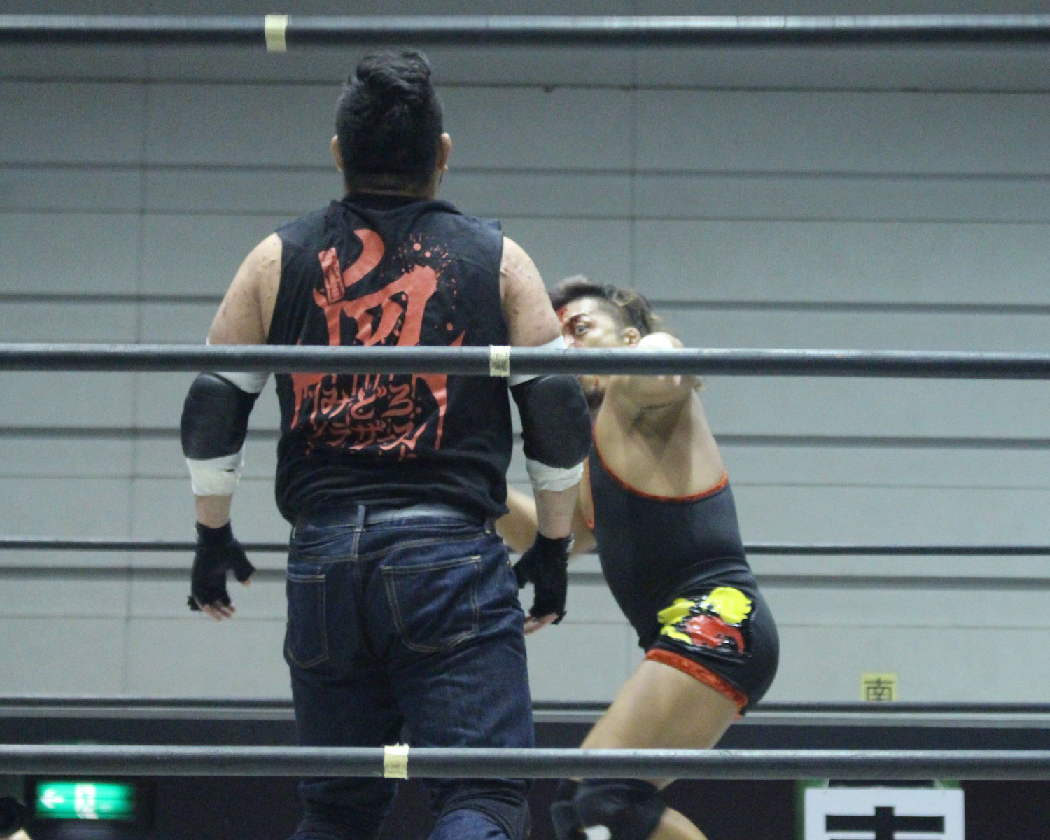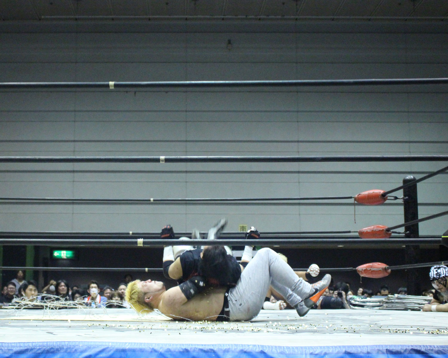 関本は投げ放しジャーマンも、起き上がった河上はランニングエルボーで応戦、両者ダウンの後で河上がハリケーンドライバーを狙うも、阻止した関本はサイドスープレックスからスピアーを連発する。