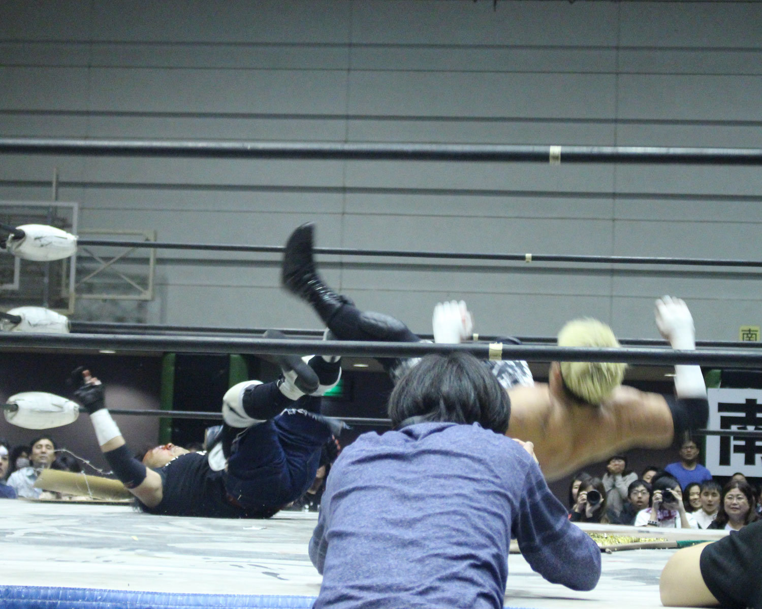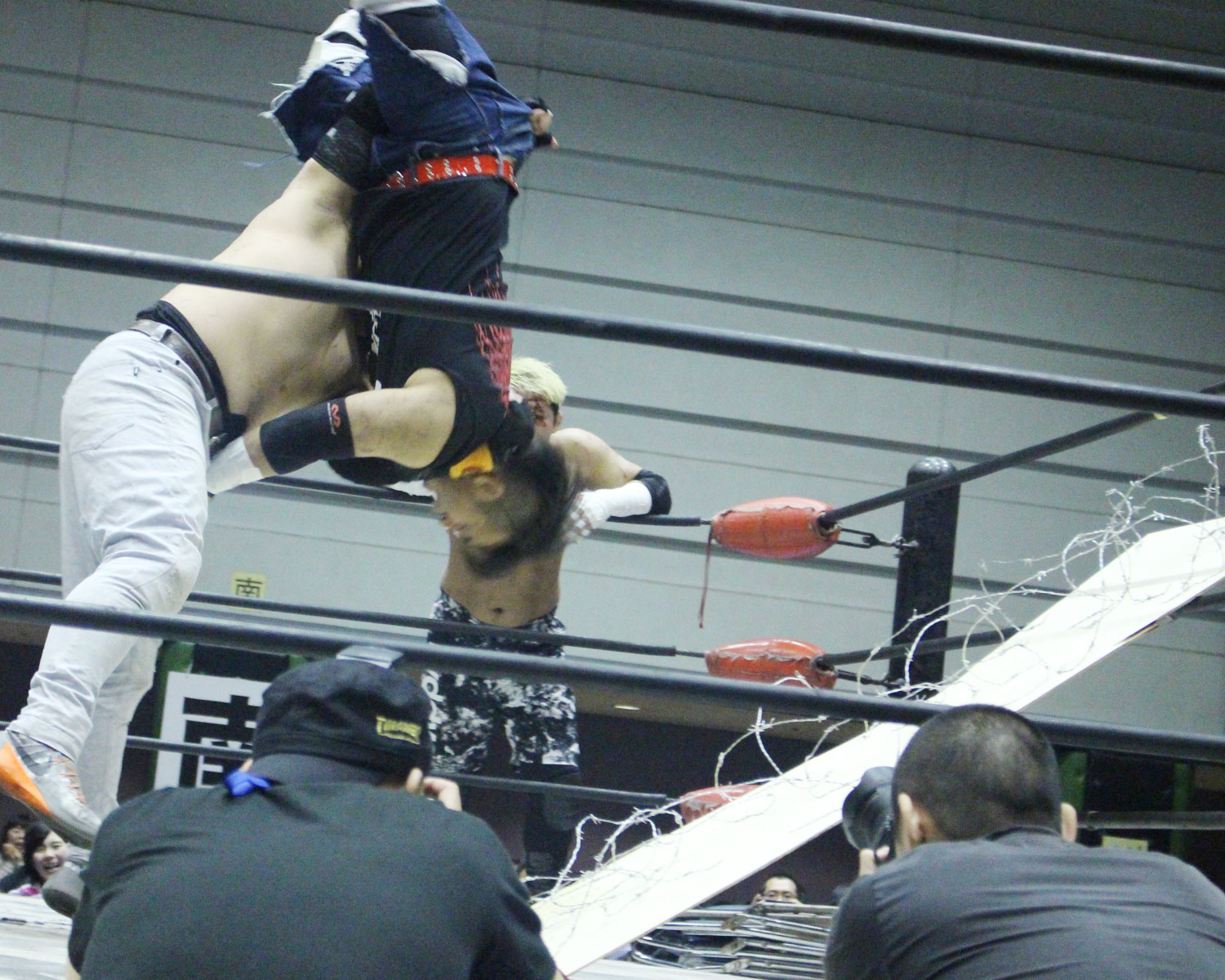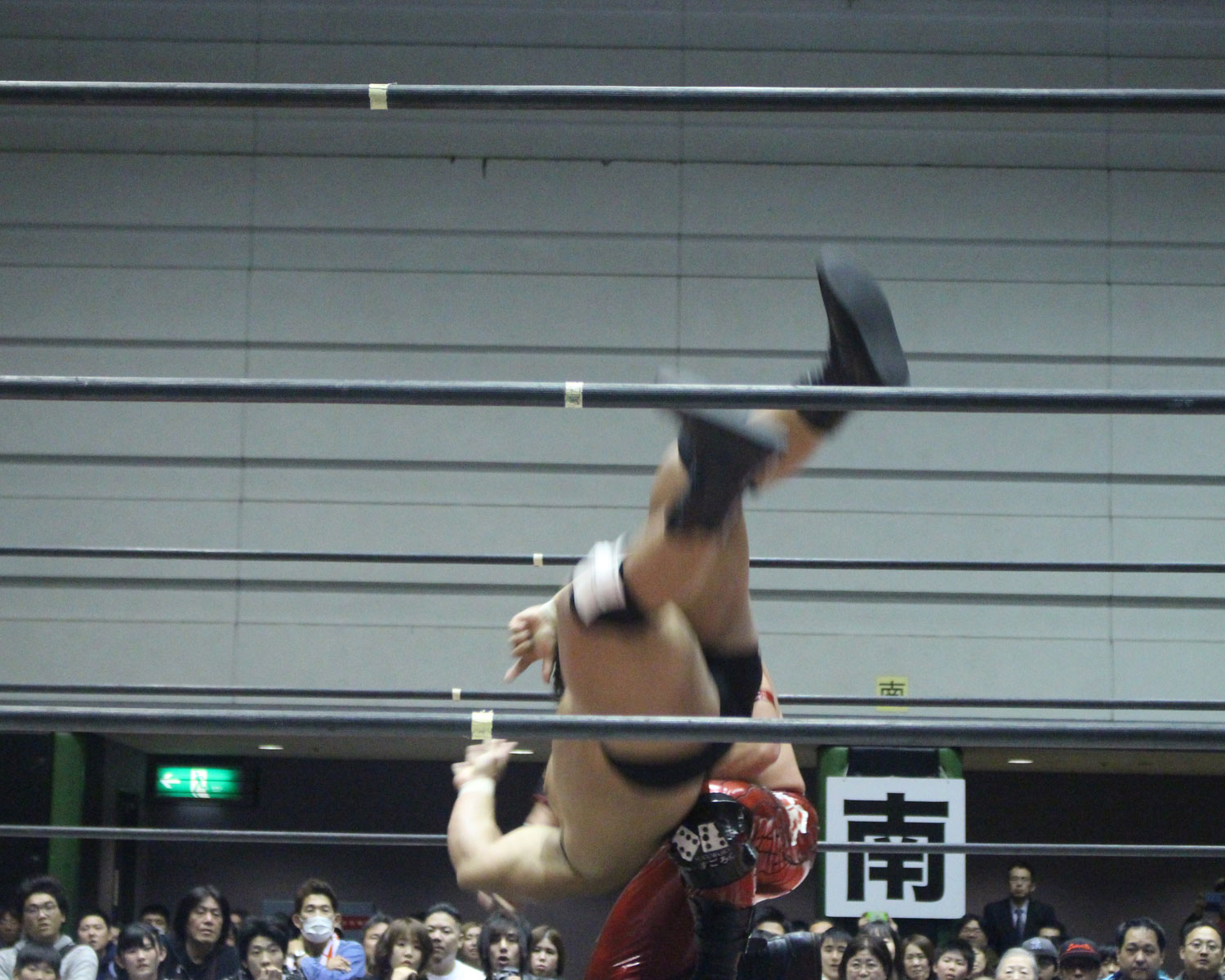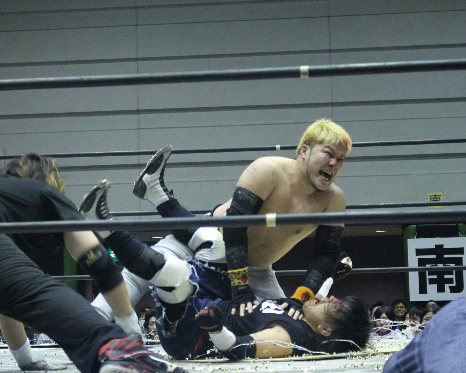 関本は投げ放しジャーマンも、起き上がった河上はランニングエルボーで応戦、両者ダウンの後で河上がハリケーンドライバーを狙うも、阻止した関本はサイドスープレックスからスピアーを連発する。