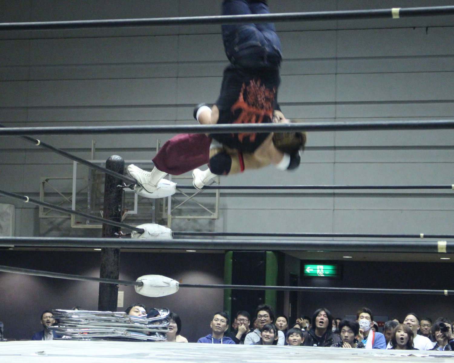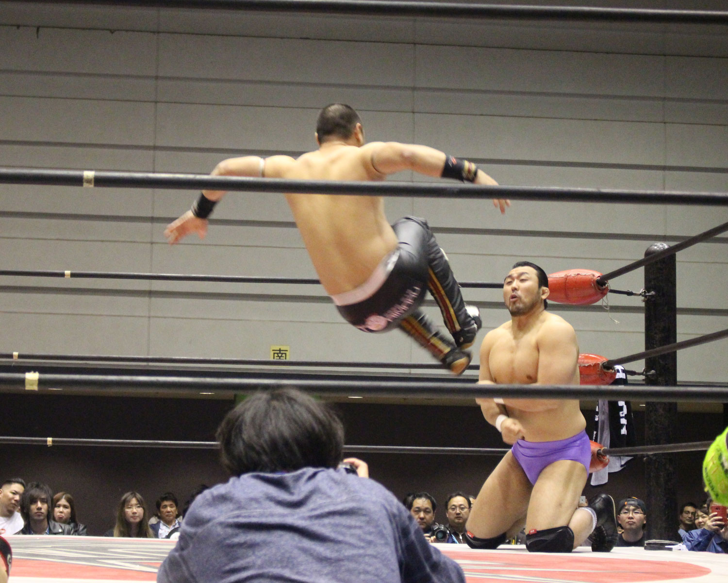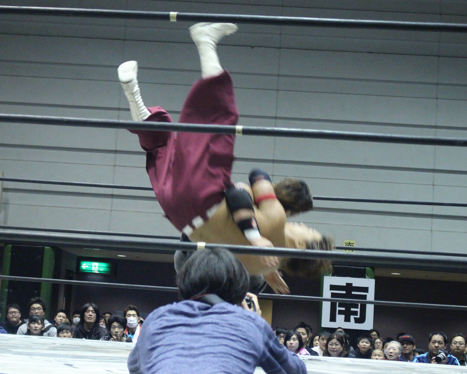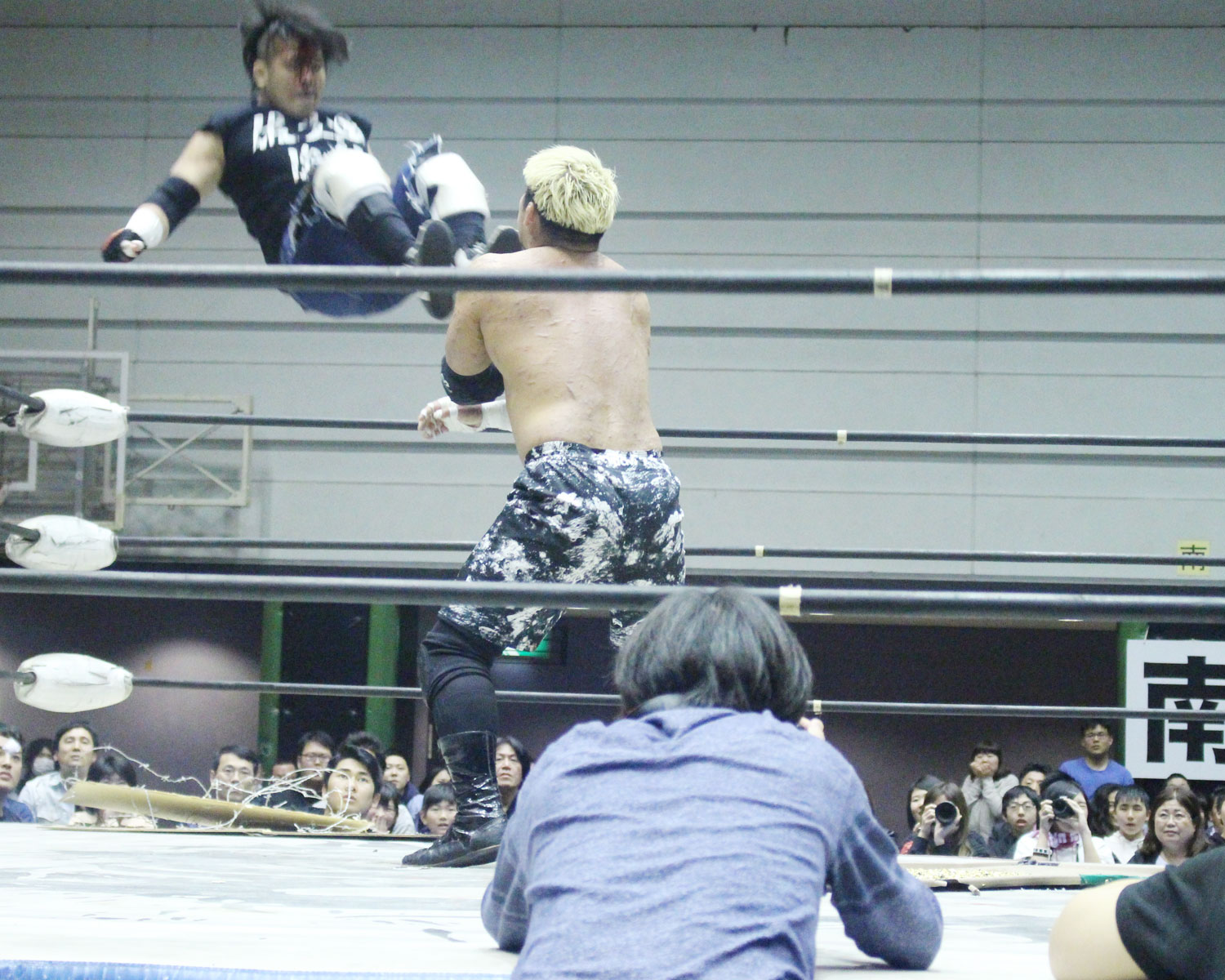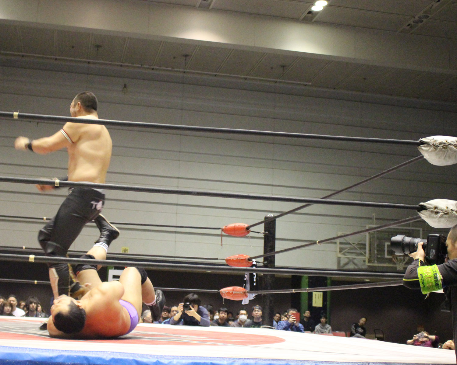 関本は投げ放しジャーマンも、起き上がった河上はランニングエルボーで応戦、両者ダウンの後で河上がハリケーンドライバーを狙うも、阻止した関本はサイドスープレックスからスピアーを連発する。