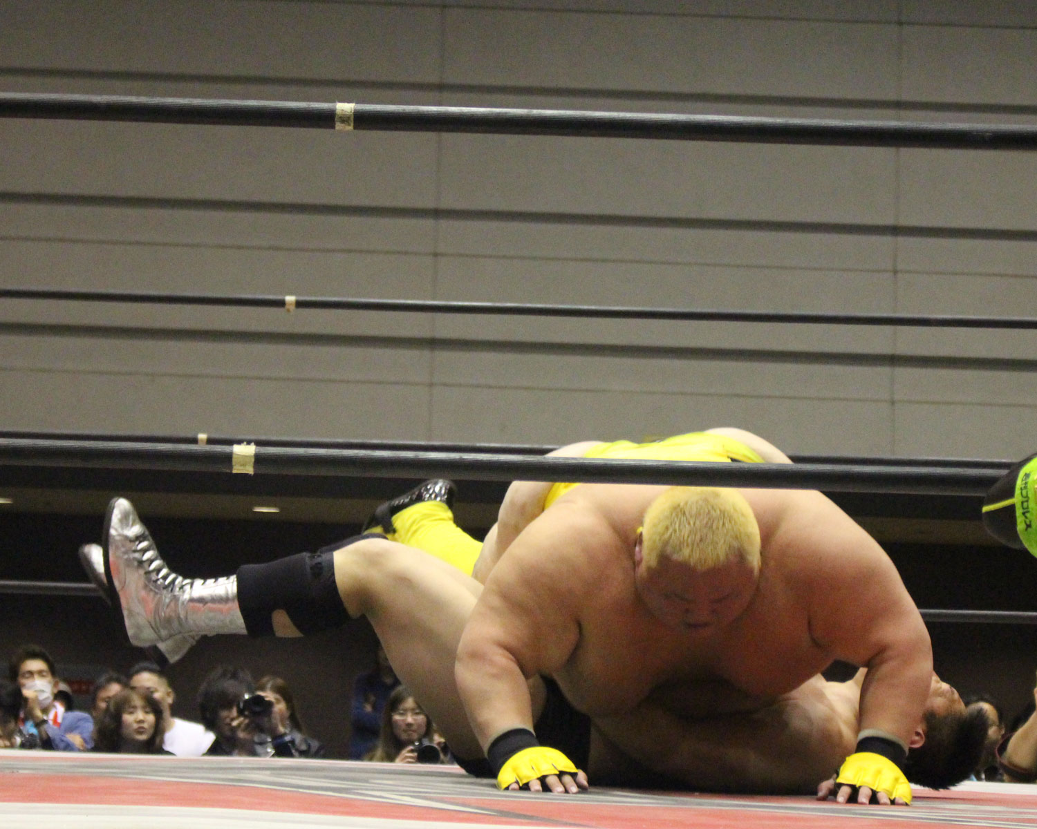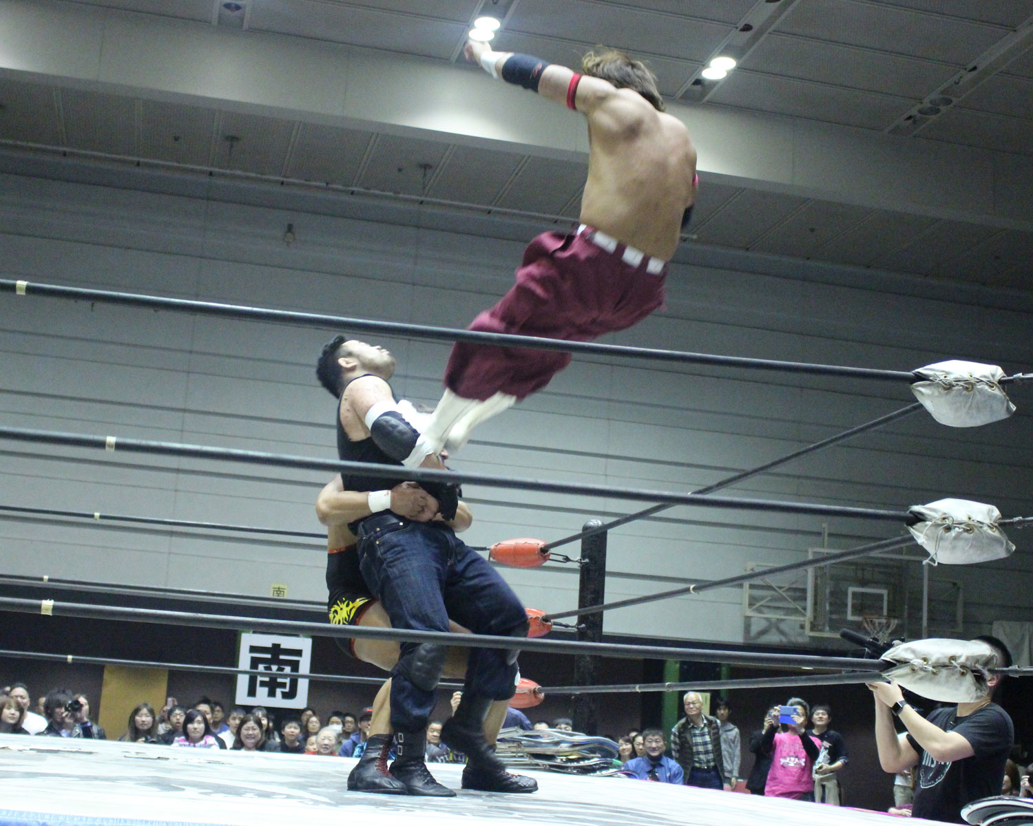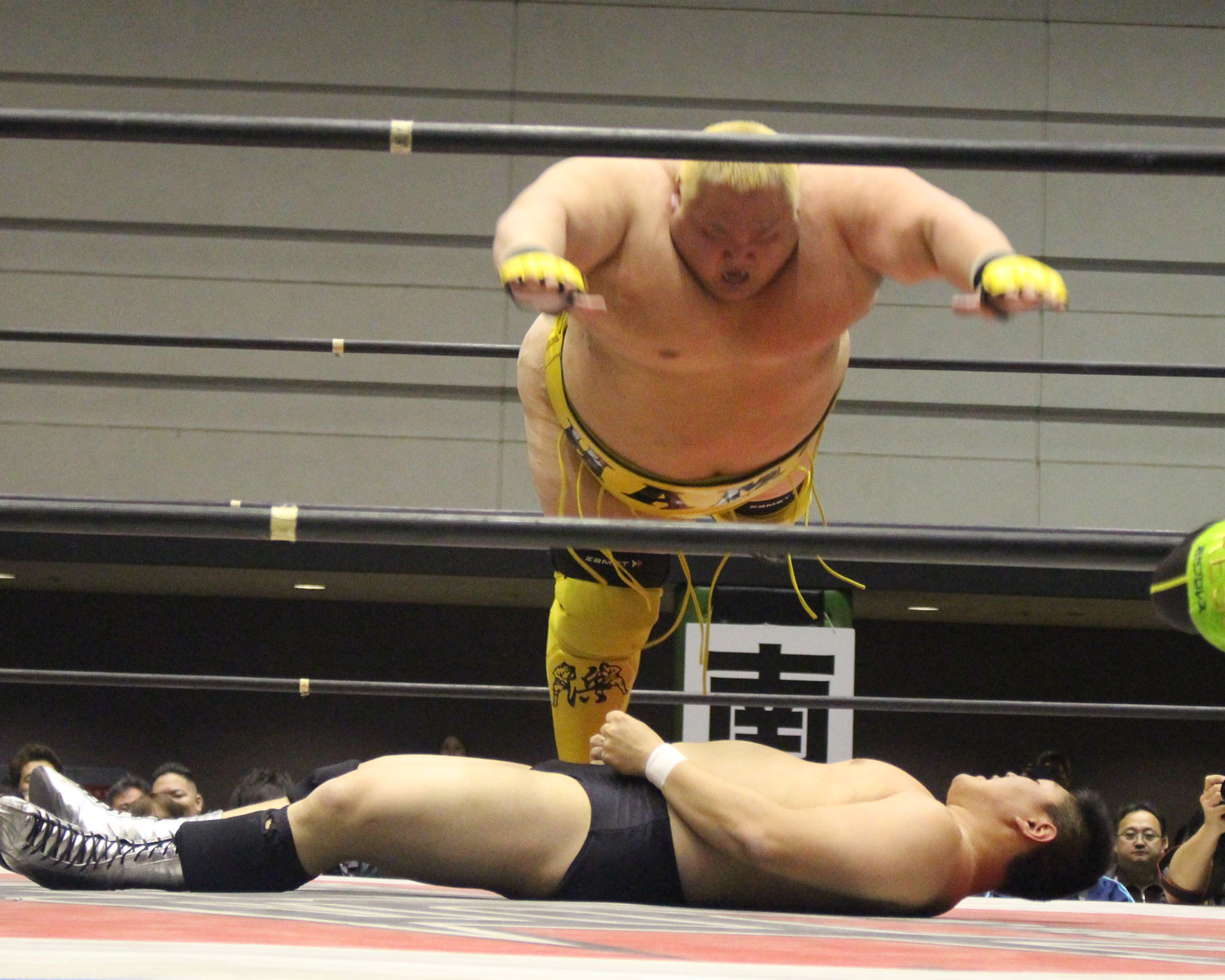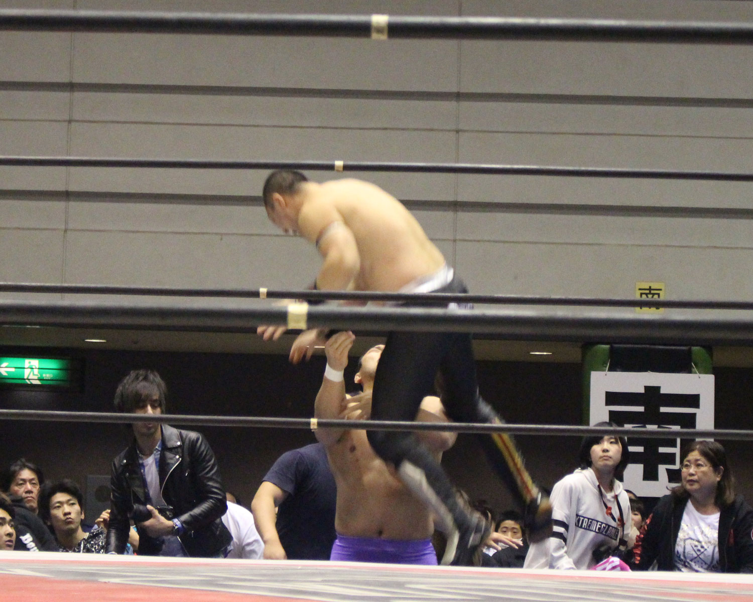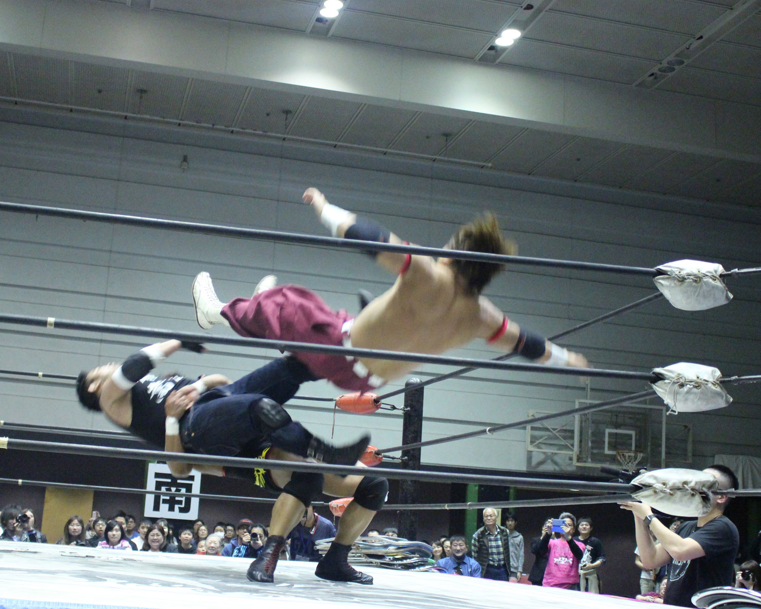 関本は投げ放しジャーマンも、起き上がった河上はランニングエルボーで応戦、両者ダウンの後で河上がハリケーンドライバーを狙うも、阻止した関本はサイドスープレックスからスピアーを連発する。