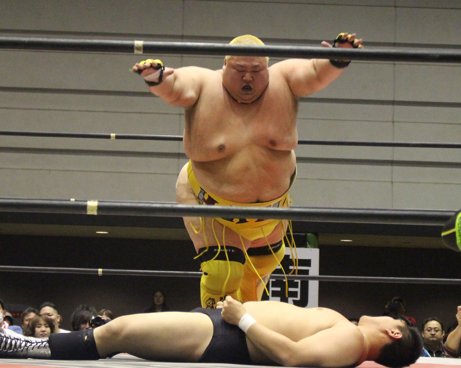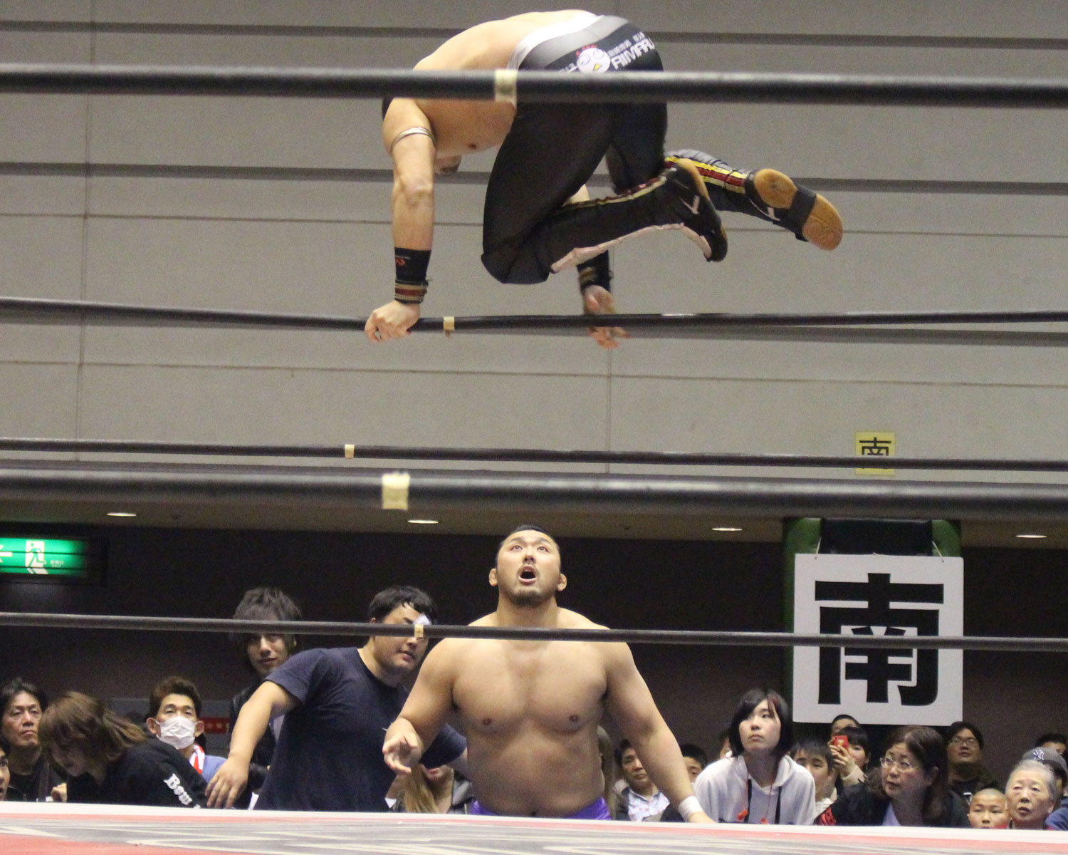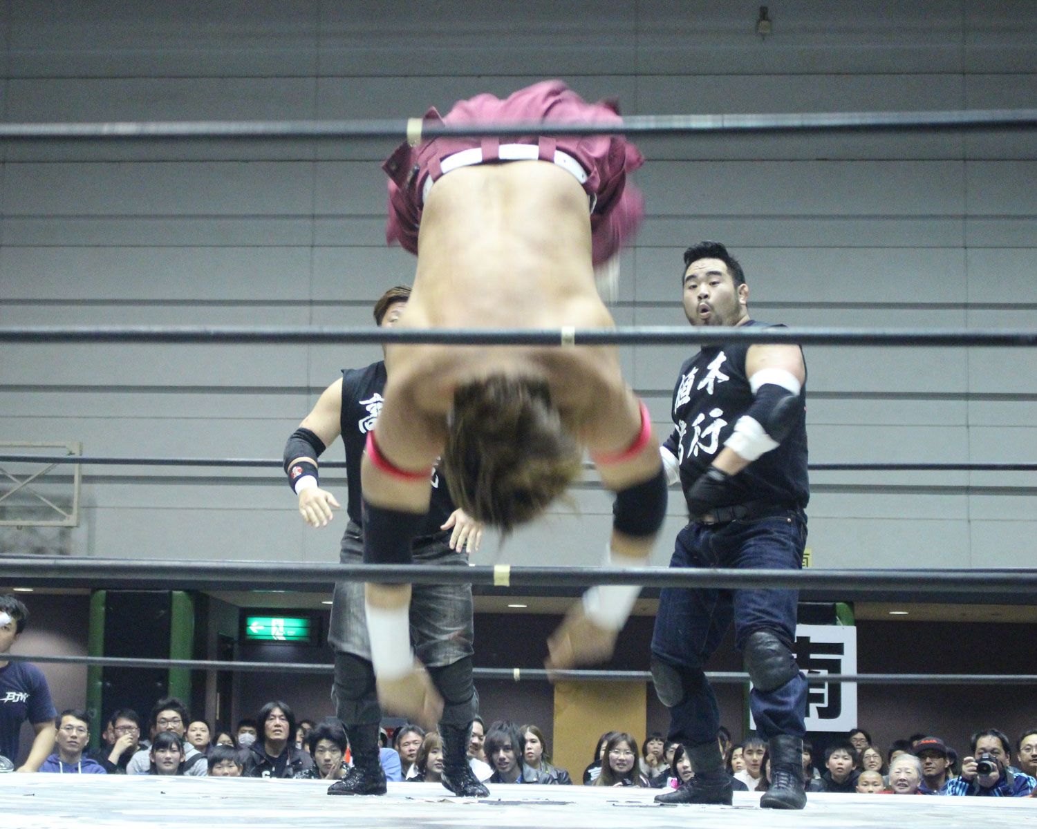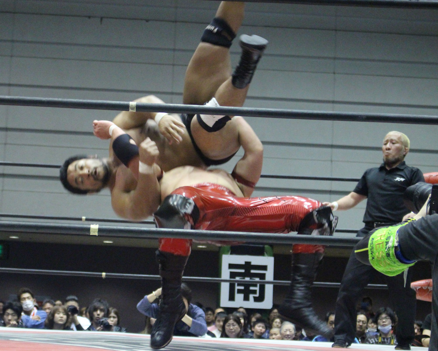 関本は投げ放しジャーマンも、起き上がった河上はランニングエルボーで応戦、両者ダウンの後で河上がハリケーンドライバーを狙うも、阻止した関本はサイドスープレックスからスピアーを連発する。