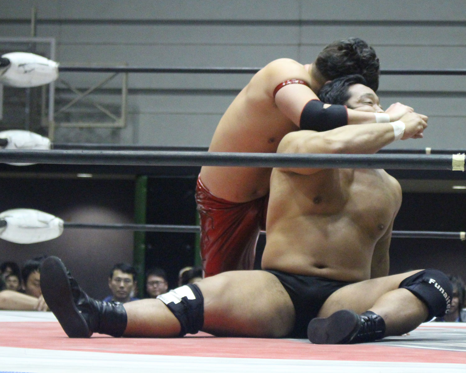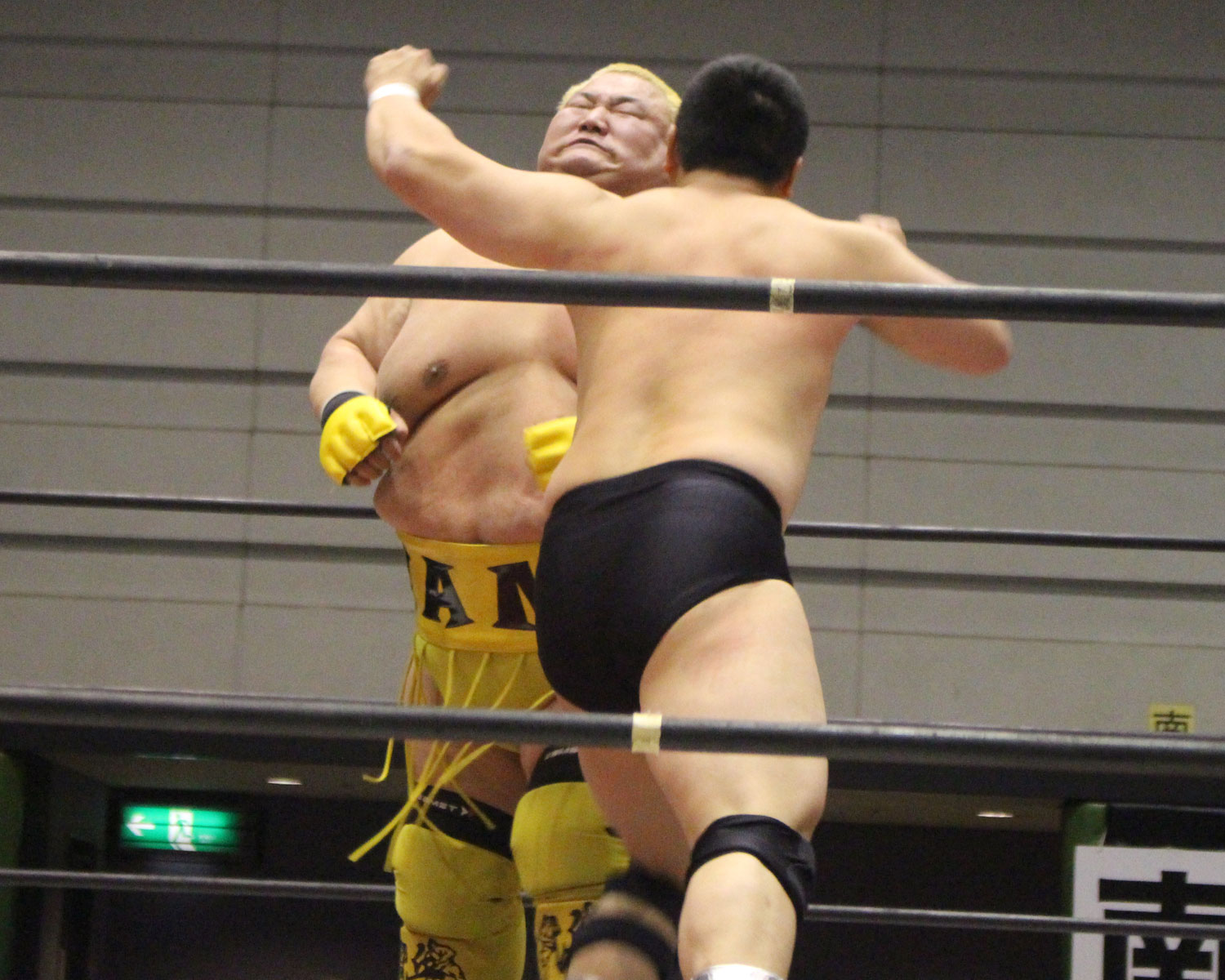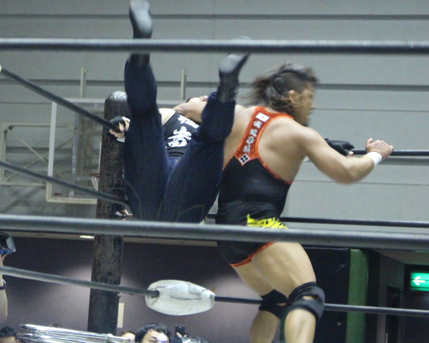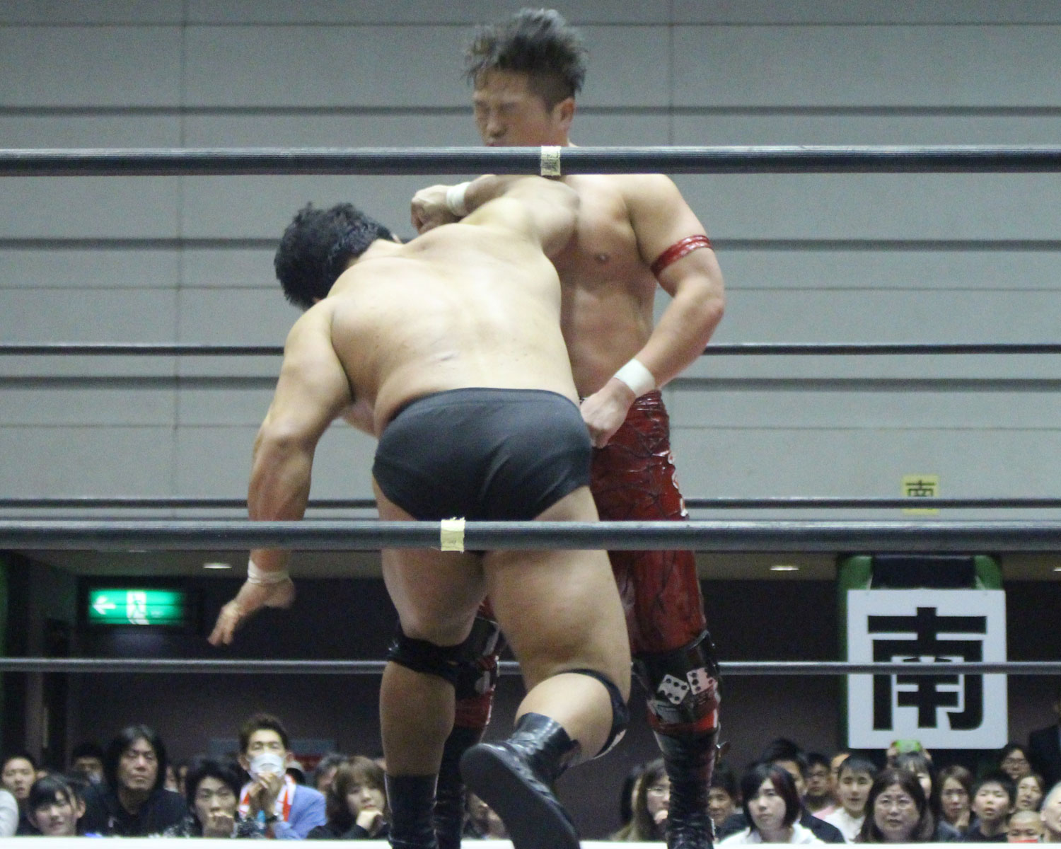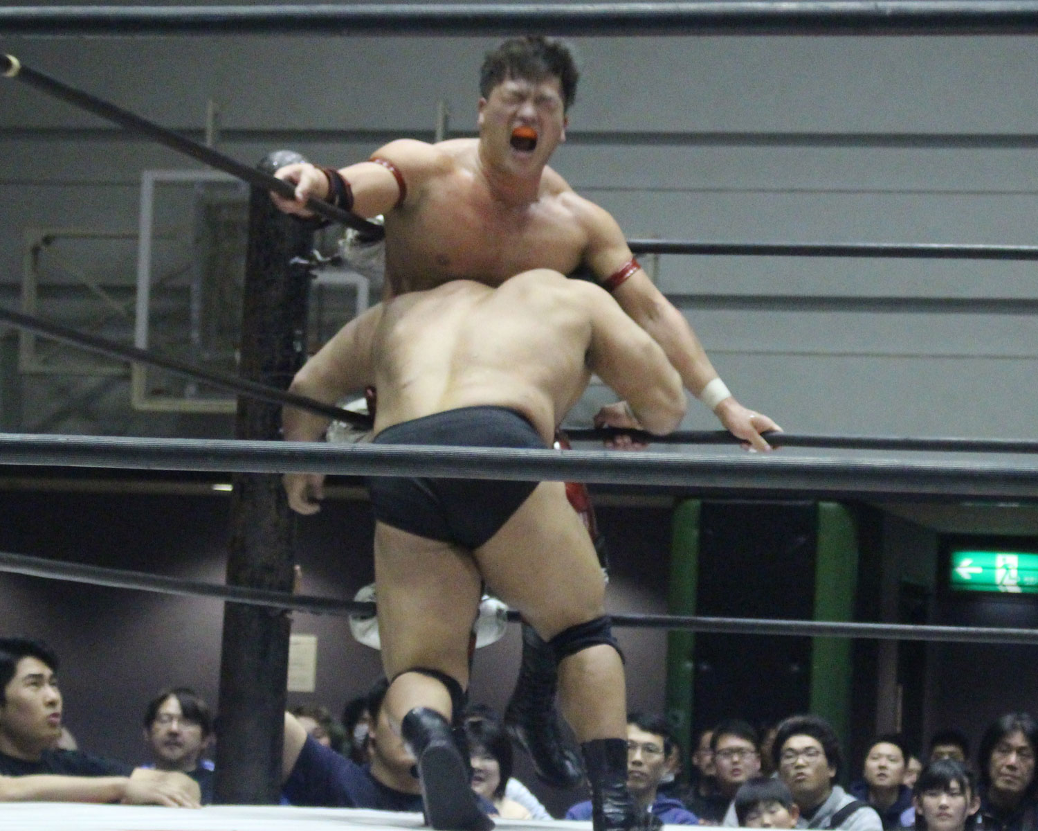 同じBブロック公式戦の関本vs河上は、グラウンドの攻防でリードを奪おうとする関本に、河上が捻りを加えたバックドロップで投げると、関本は場外でダウンも、追いかけた河上は逆水平からフェースロックと捻じ切り、ヘッドロックで捕らえるも、関本はボディーブローで脱出、だが河上も再度捕らえて、関本もボディーブローで脱出するなど同じ攻防を繰り返す。