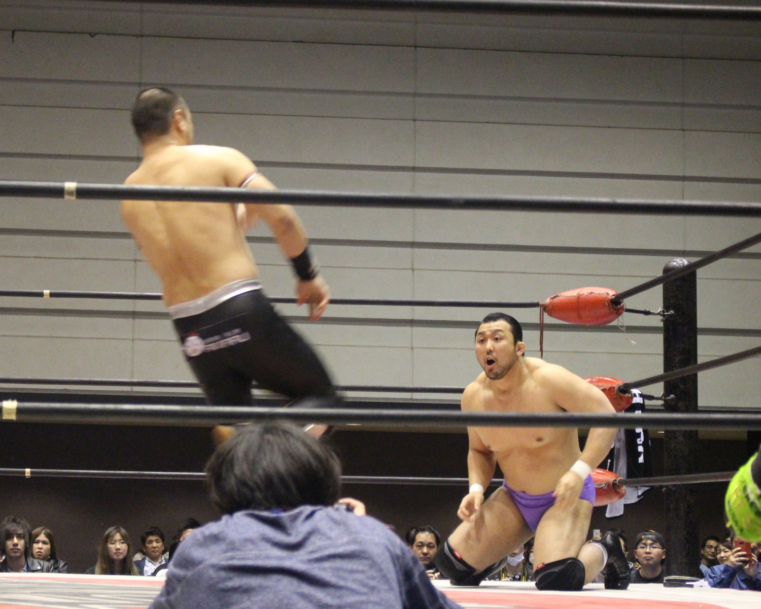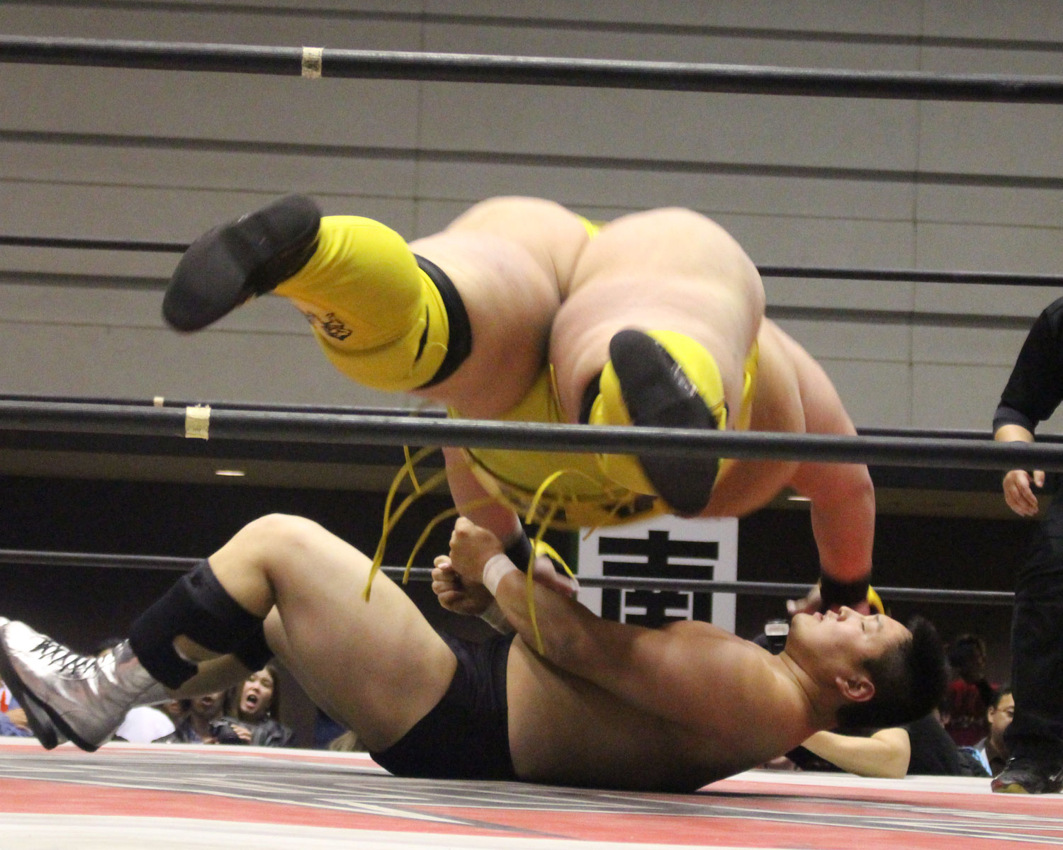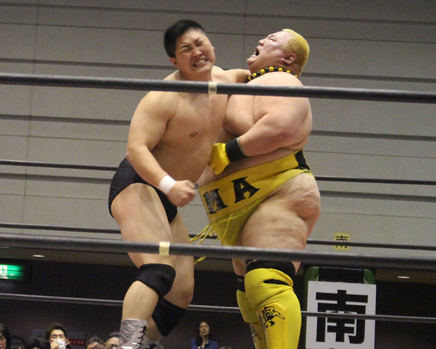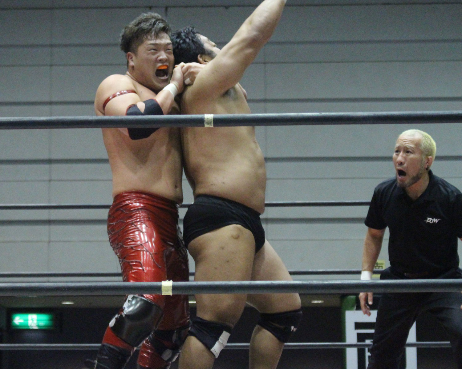 同じBブロック公式戦の関本vs河上は、グラウンドの攻防でリードを奪おうとする関本に、河上が捻りを加えたバックドロップで投げると、関本は場外でダウンも、追いかけた河上は逆水平からフェースロックと捻じ切り、ヘッドロックで捕らえるも、関本はボディーブローで脱出、だが河上も再度捕らえて、関本もボディーブローで脱出するなど同じ攻防を繰り返す。
