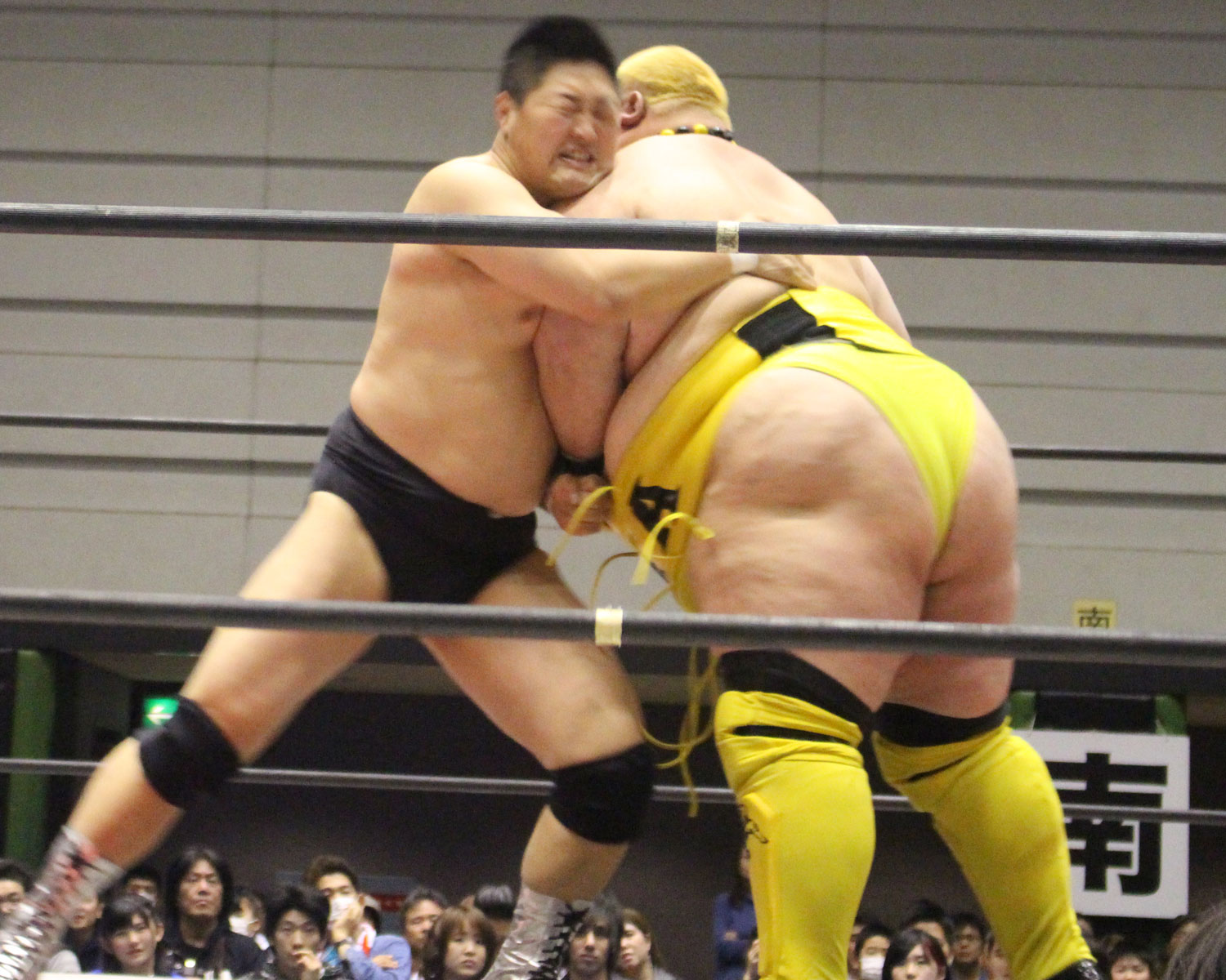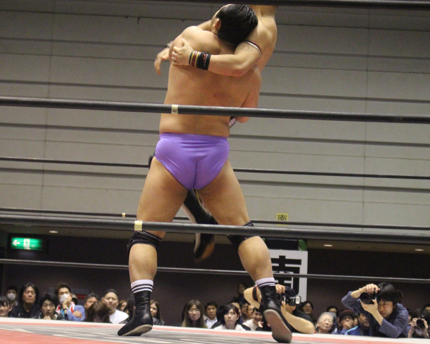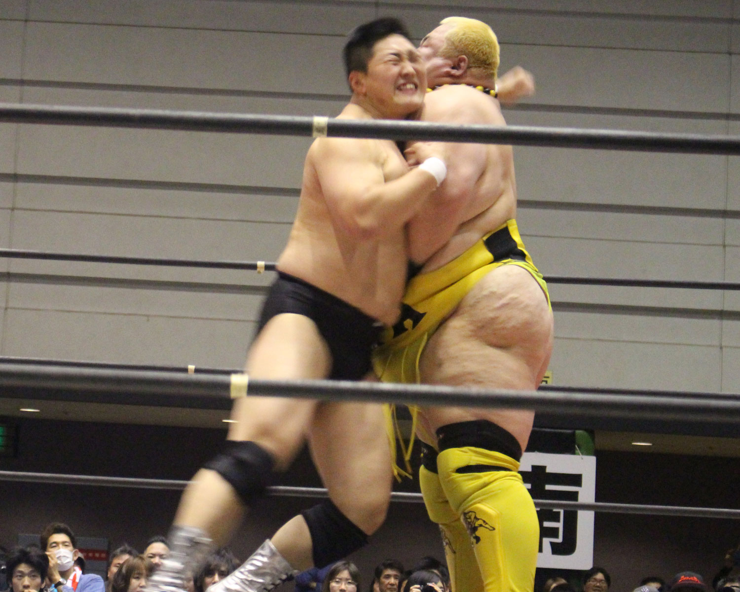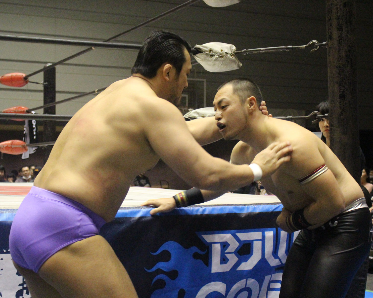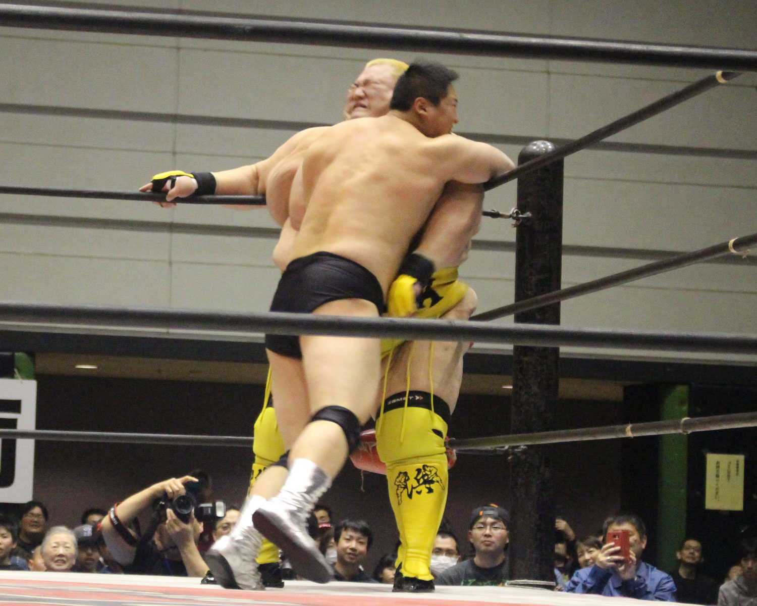 同じBブロック公式戦の関本vs河上は、グラウンドの攻防でリードを奪おうとする関本に、河上が捻りを加えたバックドロップで投げると、関本は場外でダウンも、追いかけた河上は逆水平からフェースロックと捻じ切り、ヘッドロックで捕らえるも、関本はボディーブローで脱出、だが河上も再度捕らえて、関本もボディーブローで脱出するなど同じ攻防を繰り返す。