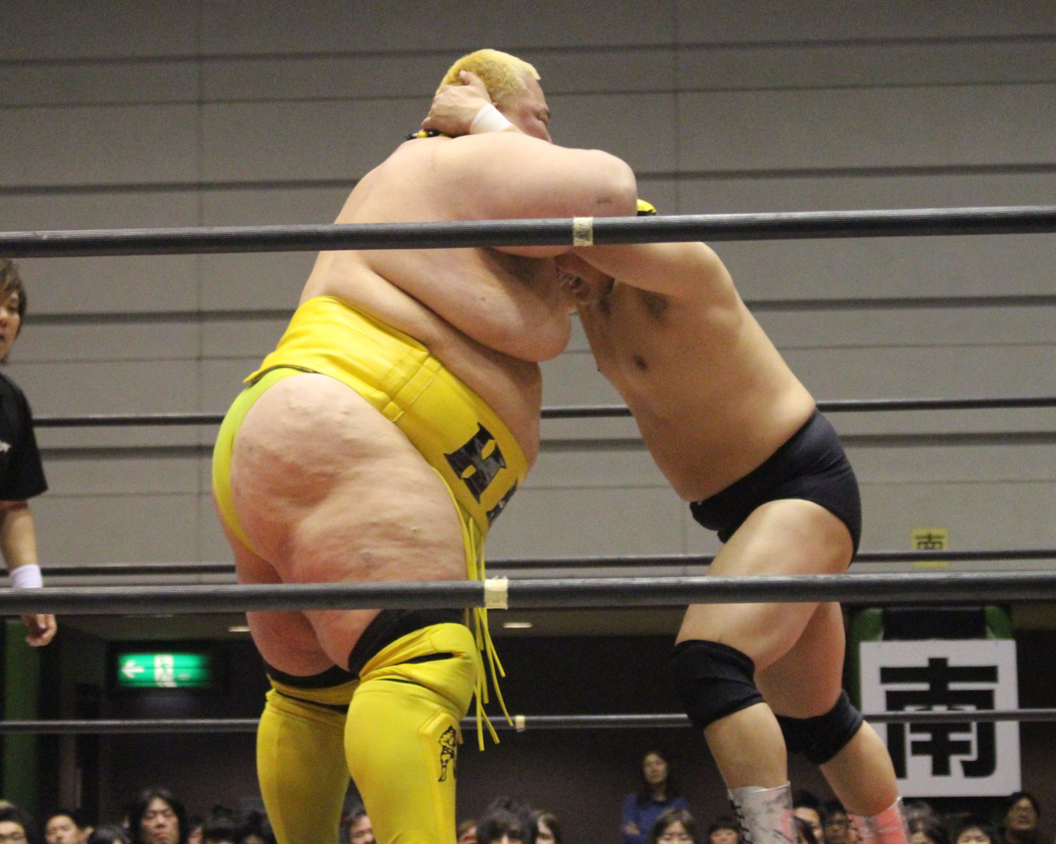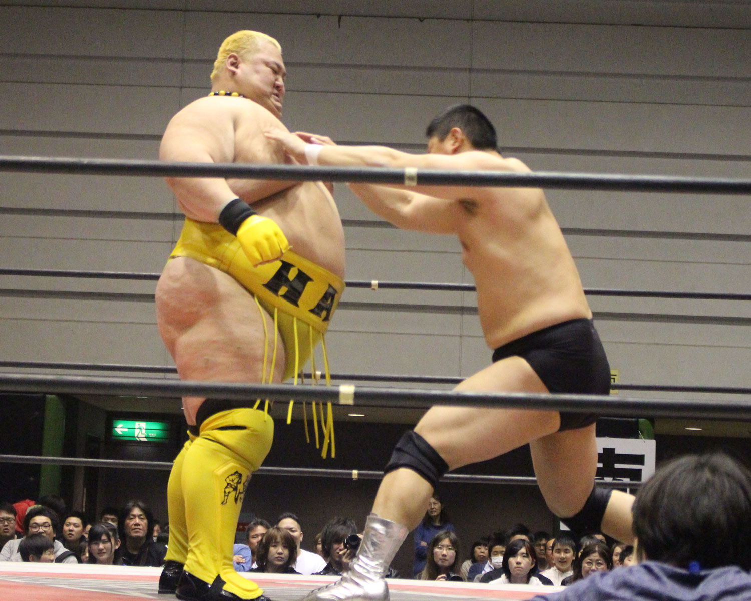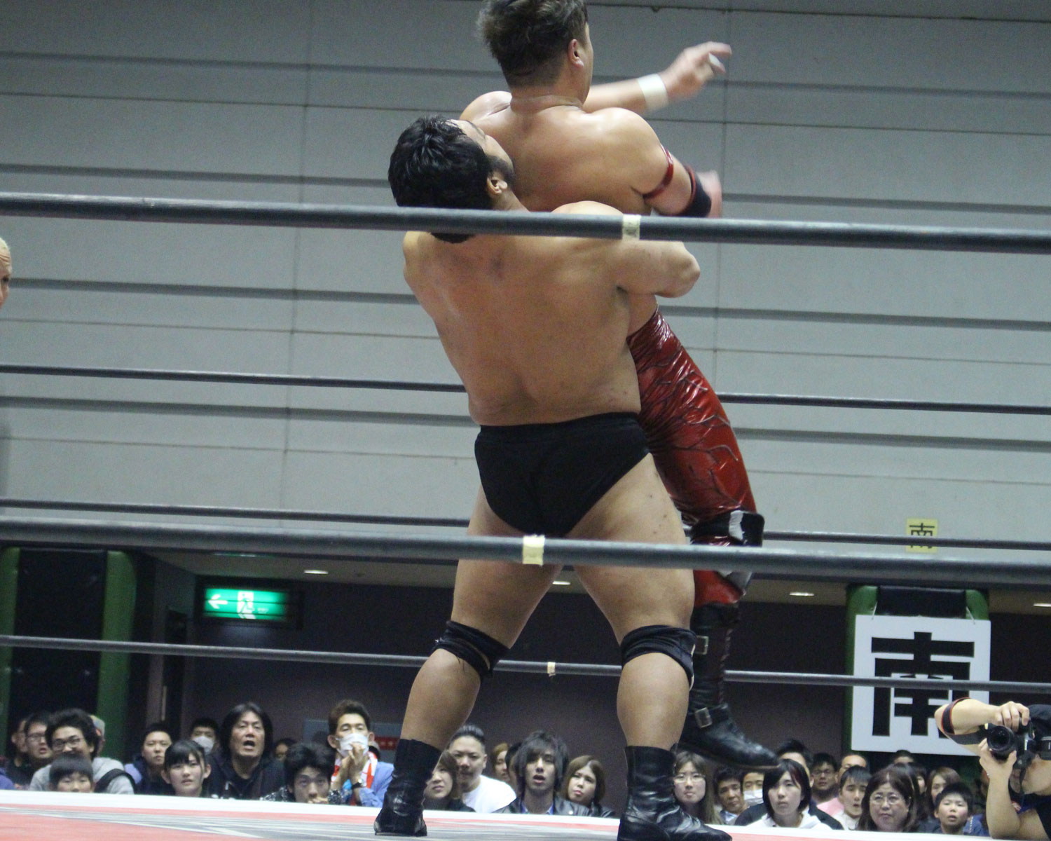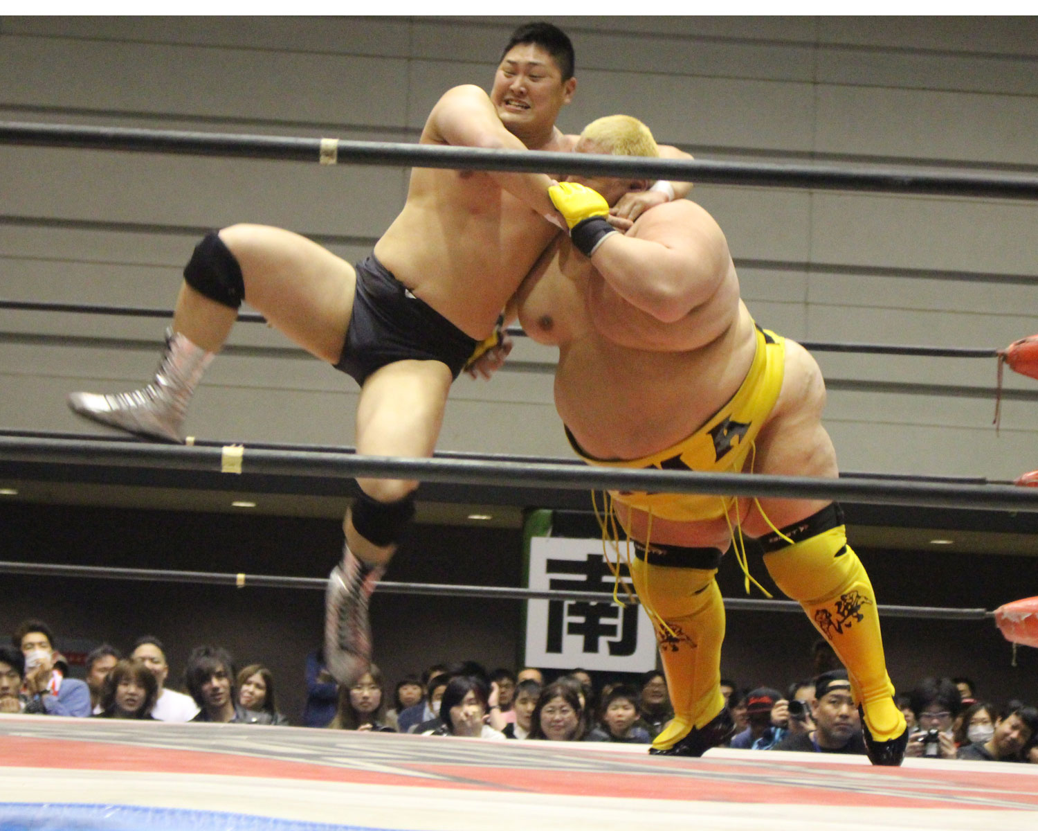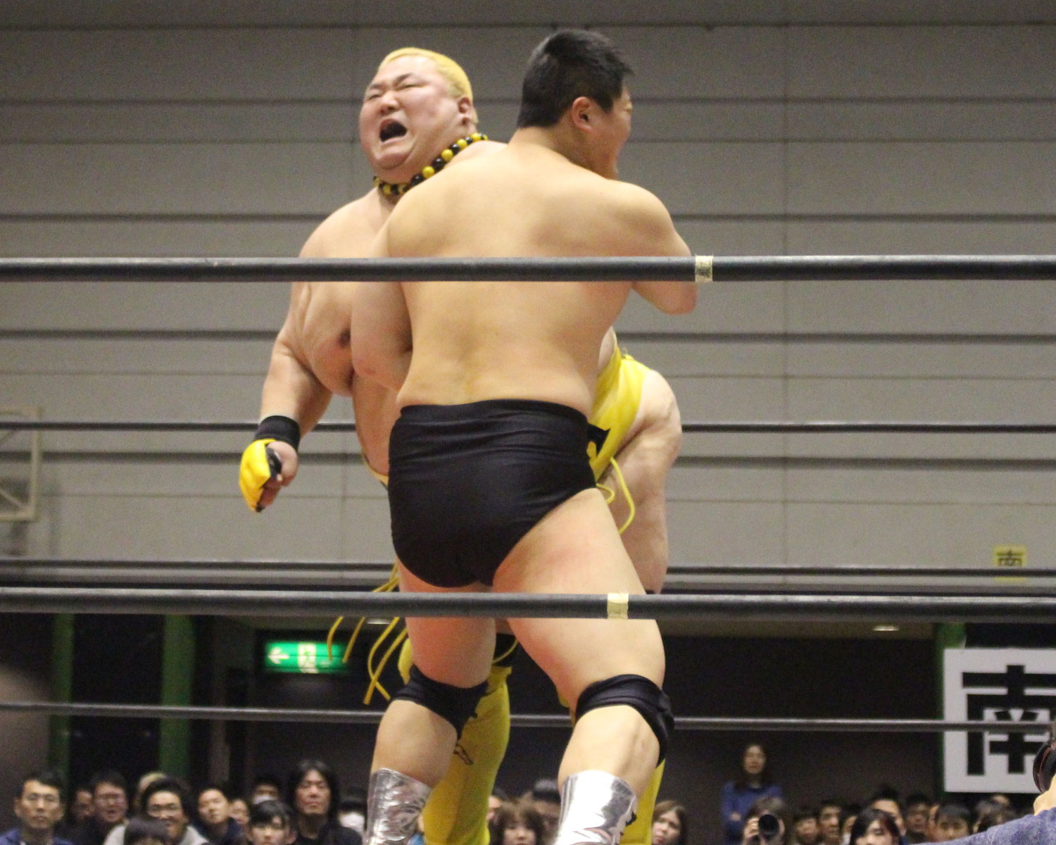 同じBブロック公式戦の関本vs河上は、グラウンドの攻防でリードを奪おうとする関本に、河上が捻りを加えたバックドロップで投げると、関本は場外でダウンも、追いかけた河上は逆水平からフェースロックと捻じ切り、ヘッドロックで捕らえるも、関本はボディーブローで脱出、だが河上も再度捕らえて、関本もボディーブローで脱出するなど同じ攻防を繰り返す。