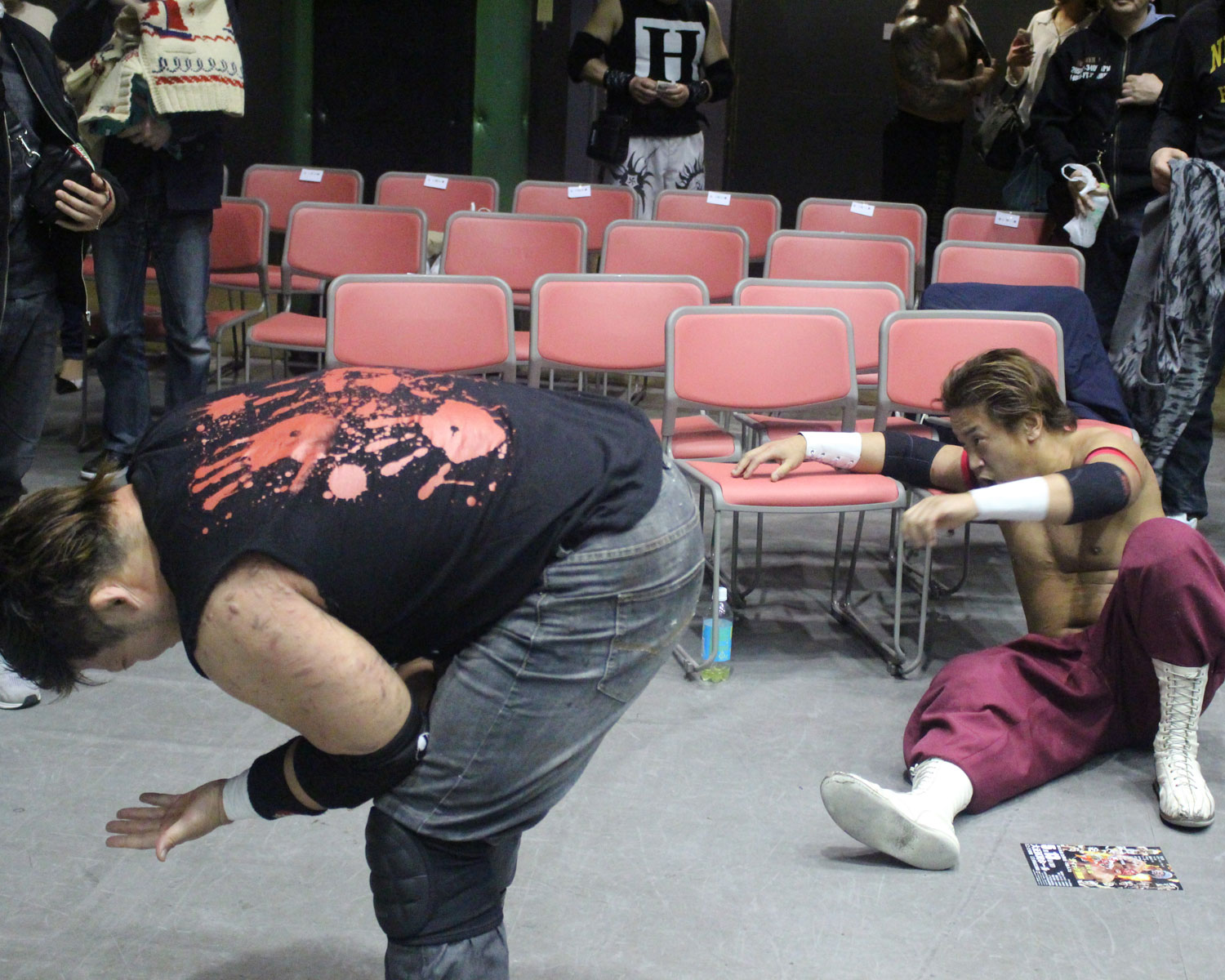 鷹木「でもね、高橋植木。オマエらミスを犯したな。俺が血を流したら動揺すると思ったろ? 俺は血が出たら、よけい燃えてきたよ! メラメラと! まあ裕向、次は俺ら5月のDRAGON GATE山梨大会で組むから」