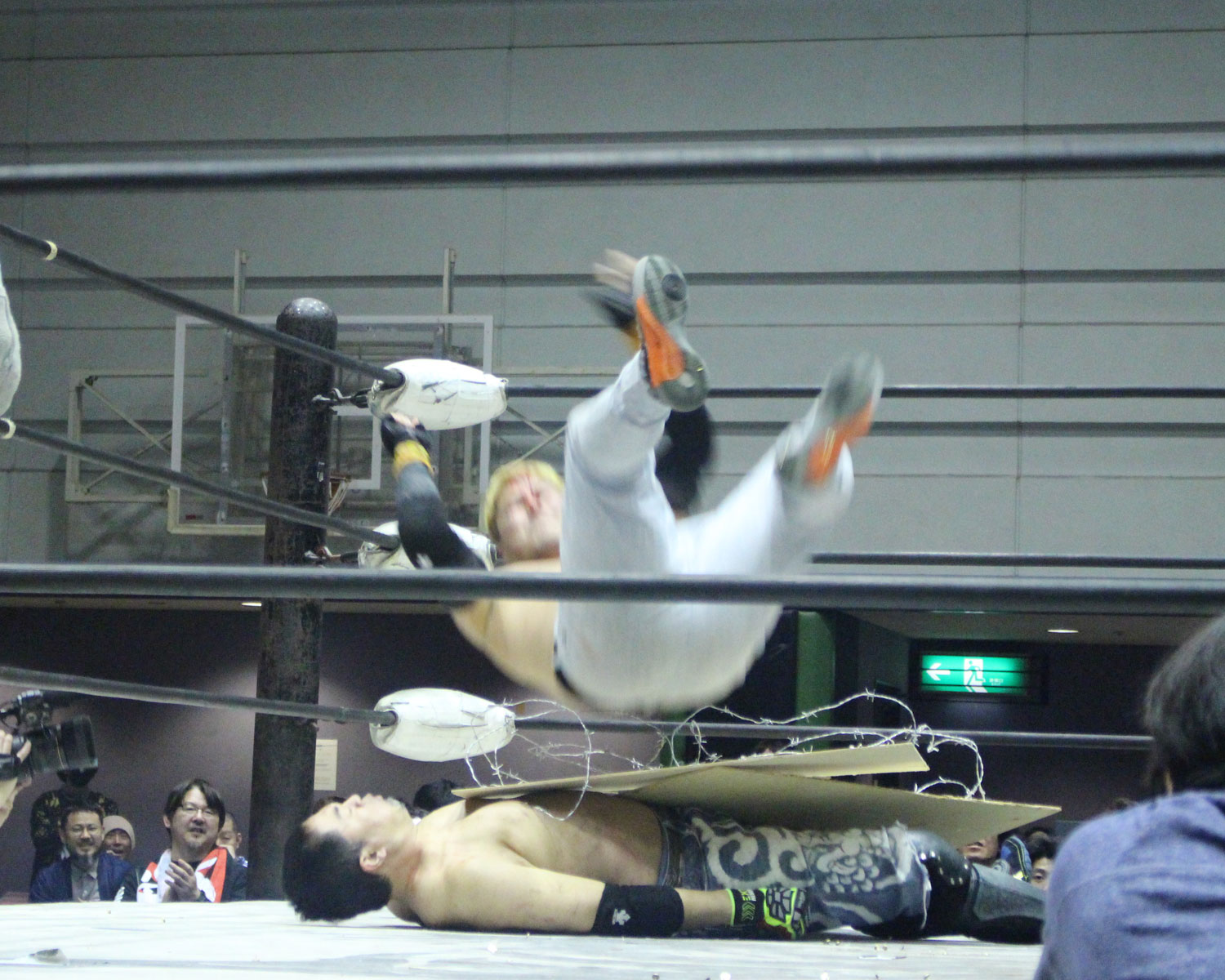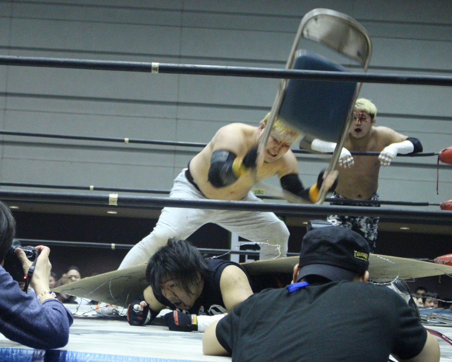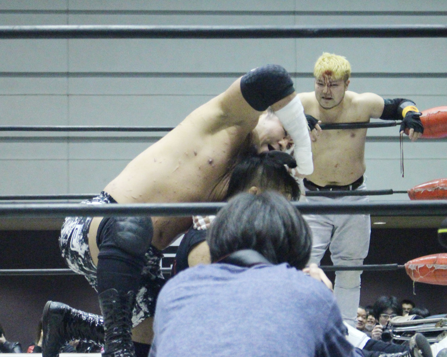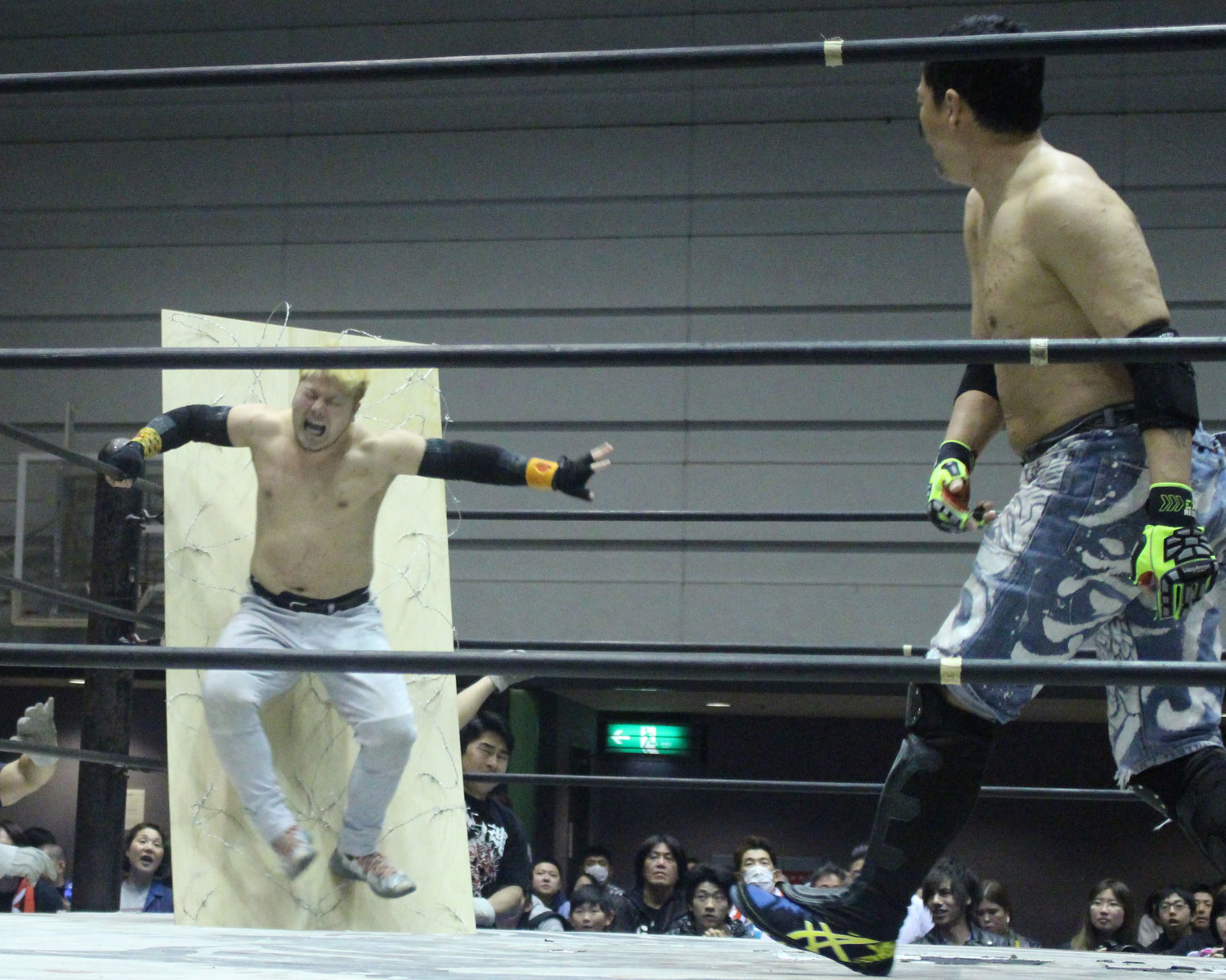 場外戦の後で佐久田が塚本の上に画鋲を巻いてのスワンダイブサマーソルトドロップを投下、イス二脚セットしてから有刺鉄線ボードをセットするも、竹田が入って塚本のトラースキックから竹田のジャーマンと逆に有刺鉄線ボードに被弾してしまい、最後は塚本が画鋲をばら撒いてからのずどんで3カウントを奪い勝利、試合後のバックステージでは3月までメンテナンス休暇で欠場していたアブドーラ・小林が5・5横浜文体で竹田の保持するデスマッチ王座に挑戦することが発表された。