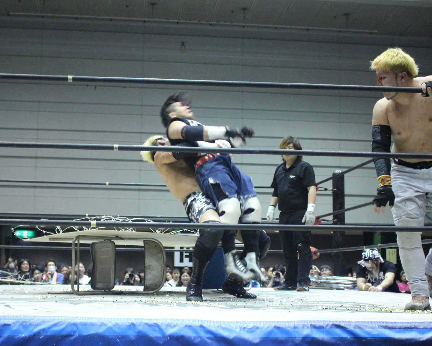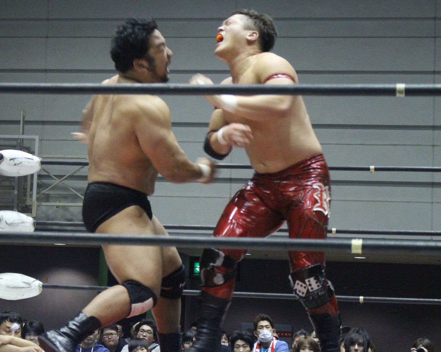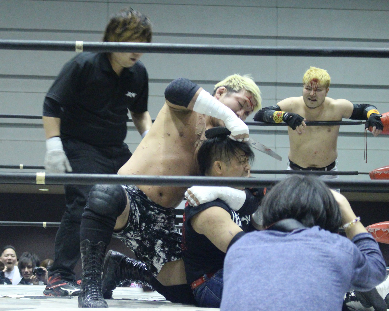 場外戦の後で佐久田が塚本の上に画鋲を巻いてのスワンダイブサマーソルトドロップを投下、イス二脚セットしてから有刺鉄線ボードをセットするも、竹田が入って塚本のトラースキックから竹田のジャーマンと逆に有刺鉄線ボードに被弾してしまい、最後は塚本が画鋲をばら撒いてからのずどんで3カウントを奪い勝利、試合後のバックステージでは3月までメンテナンス休暇で欠場していたアブドーラ・小林が5・5横浜文体で竹田の保持するデスマッチ王座に挑戦することが発表された。
