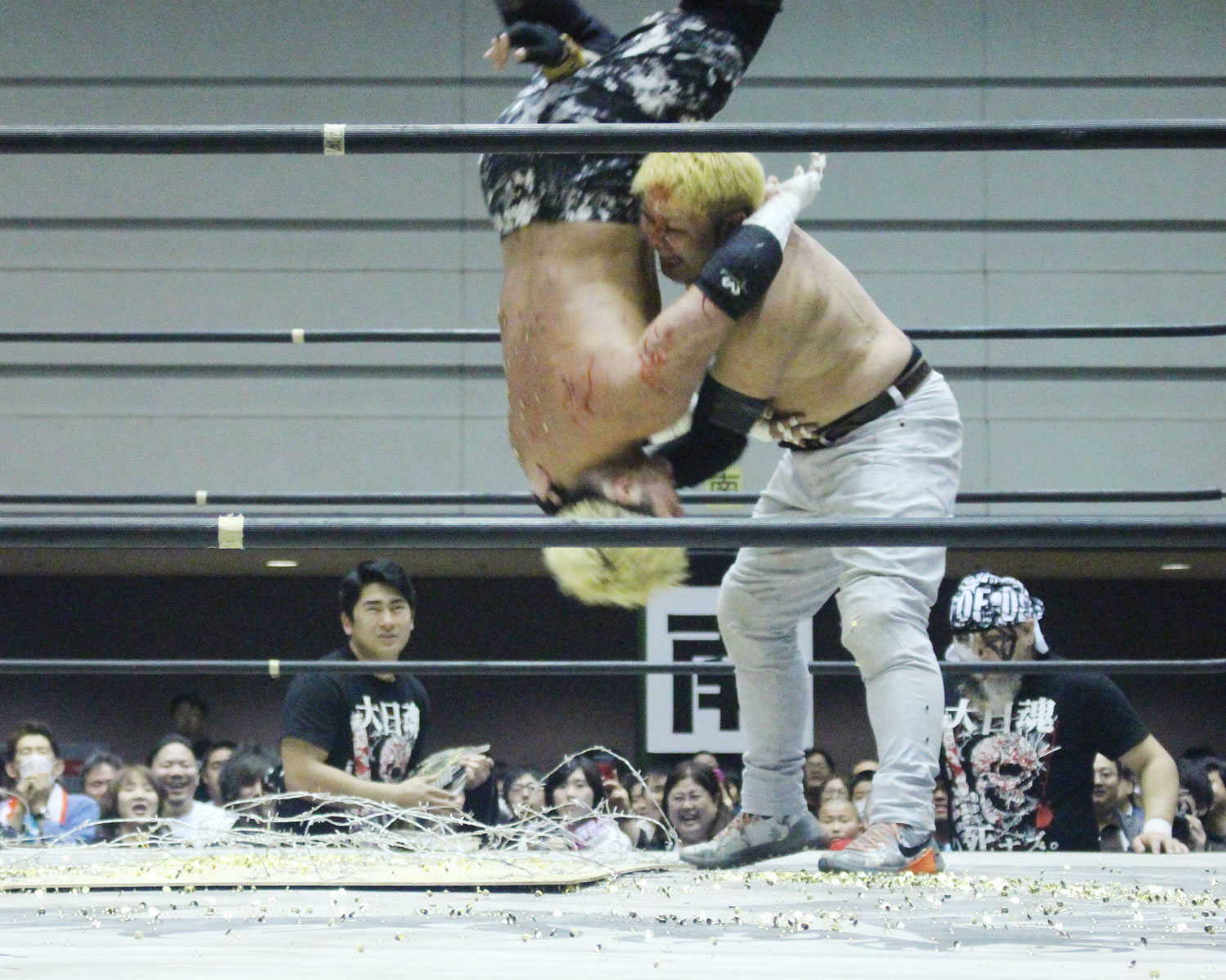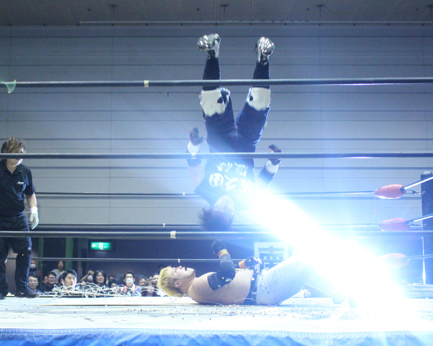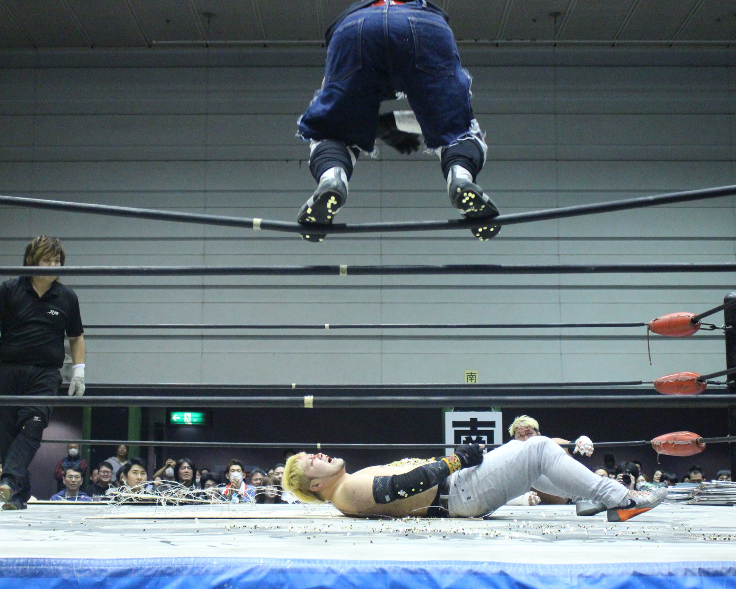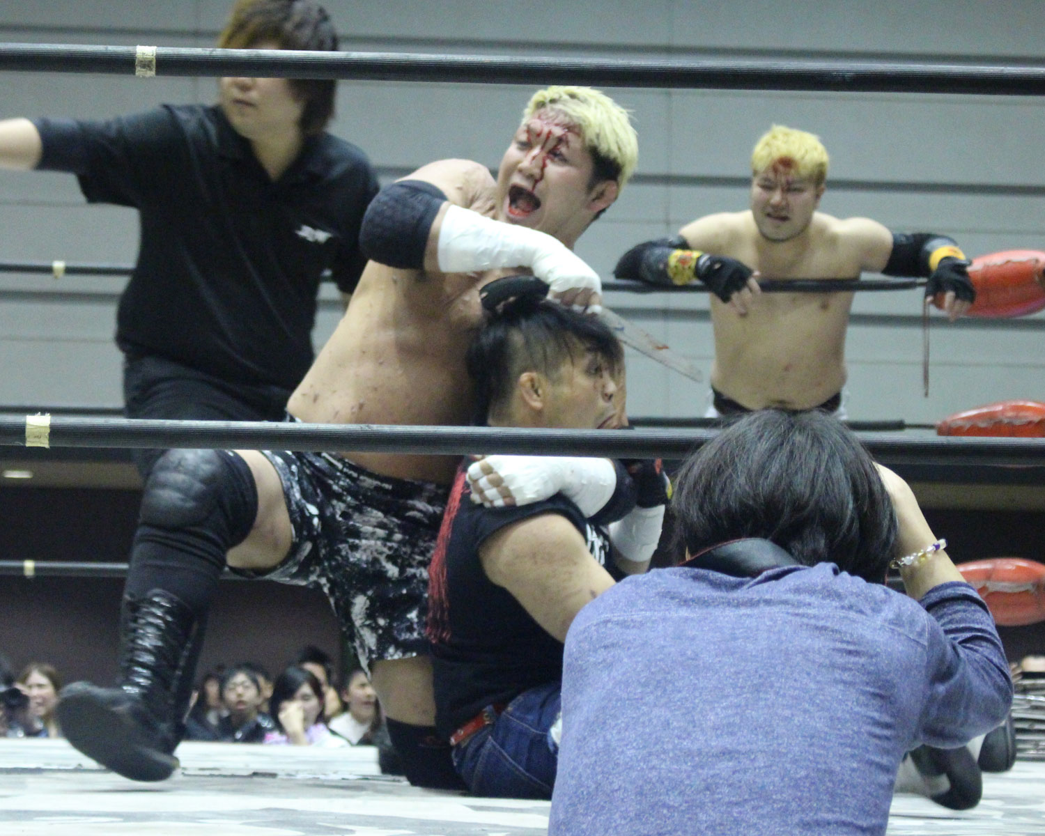 場外戦の後で佐久田が塚本の上に画鋲を巻いてのスワンダイブサマーソルトドロップを投下、イス二脚セットしてから有刺鉄線ボードをセットするも、竹田が入って塚本のトラースキックから竹田のジャーマンと逆に有刺鉄線ボードに被弾してしまい、最後は塚本が画鋲をばら撒いてからのずどんで3カウントを奪い勝利、試合後のバックステージでは3月までメンテナンス休暇で欠場していたアブドーラ・小林が5・5横浜文体で竹田の保持するデスマッチ王座に挑戦することが発表された。