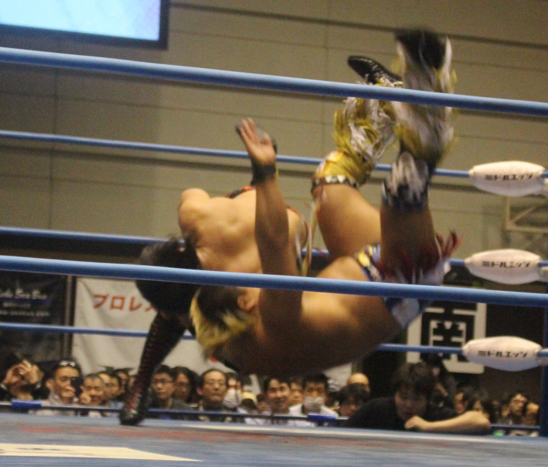 圧倒する近藤はKUBINAGEからランセルセを狙うが、岩本はニーアッパーで迎撃、近藤も左膝攻めで応戦するが、岩本は起死回生の一本背負いからネックスクリュー、エプロンでの大外刈りと猛反撃する。