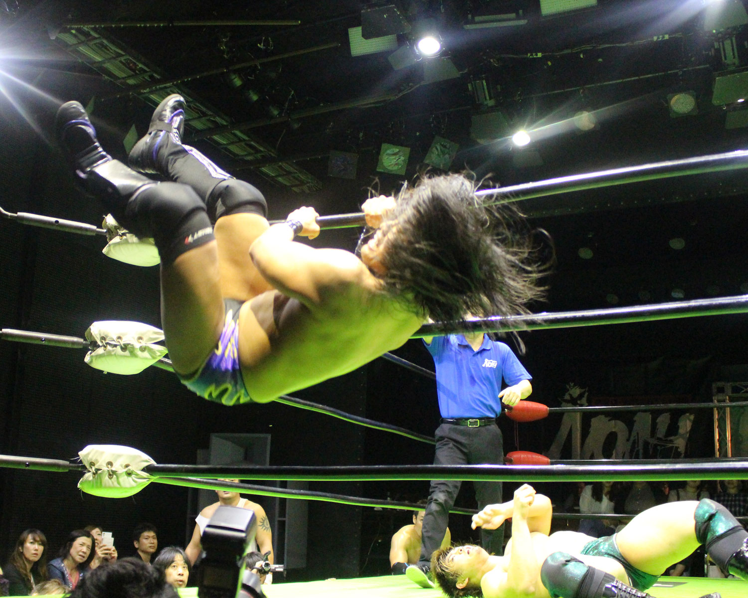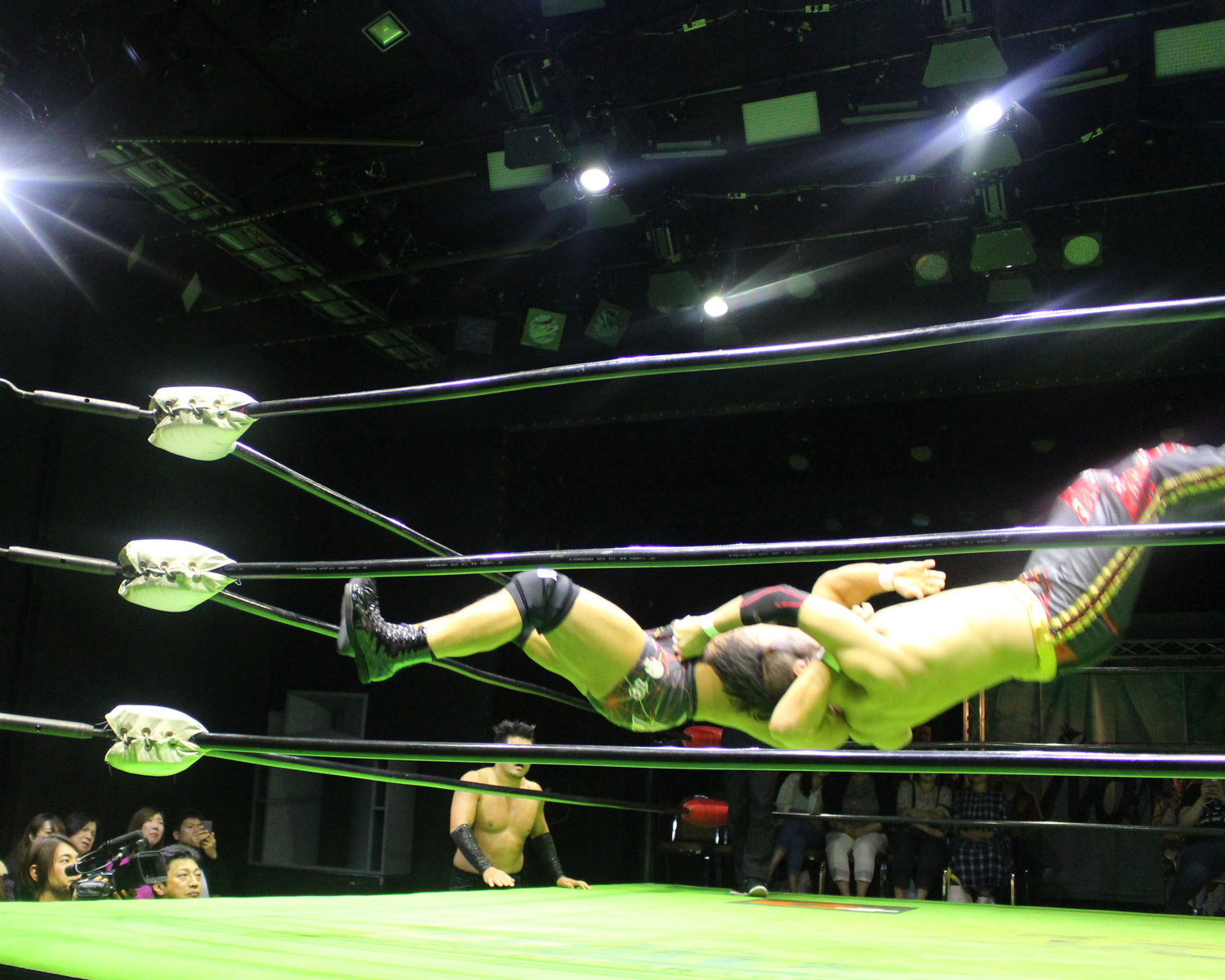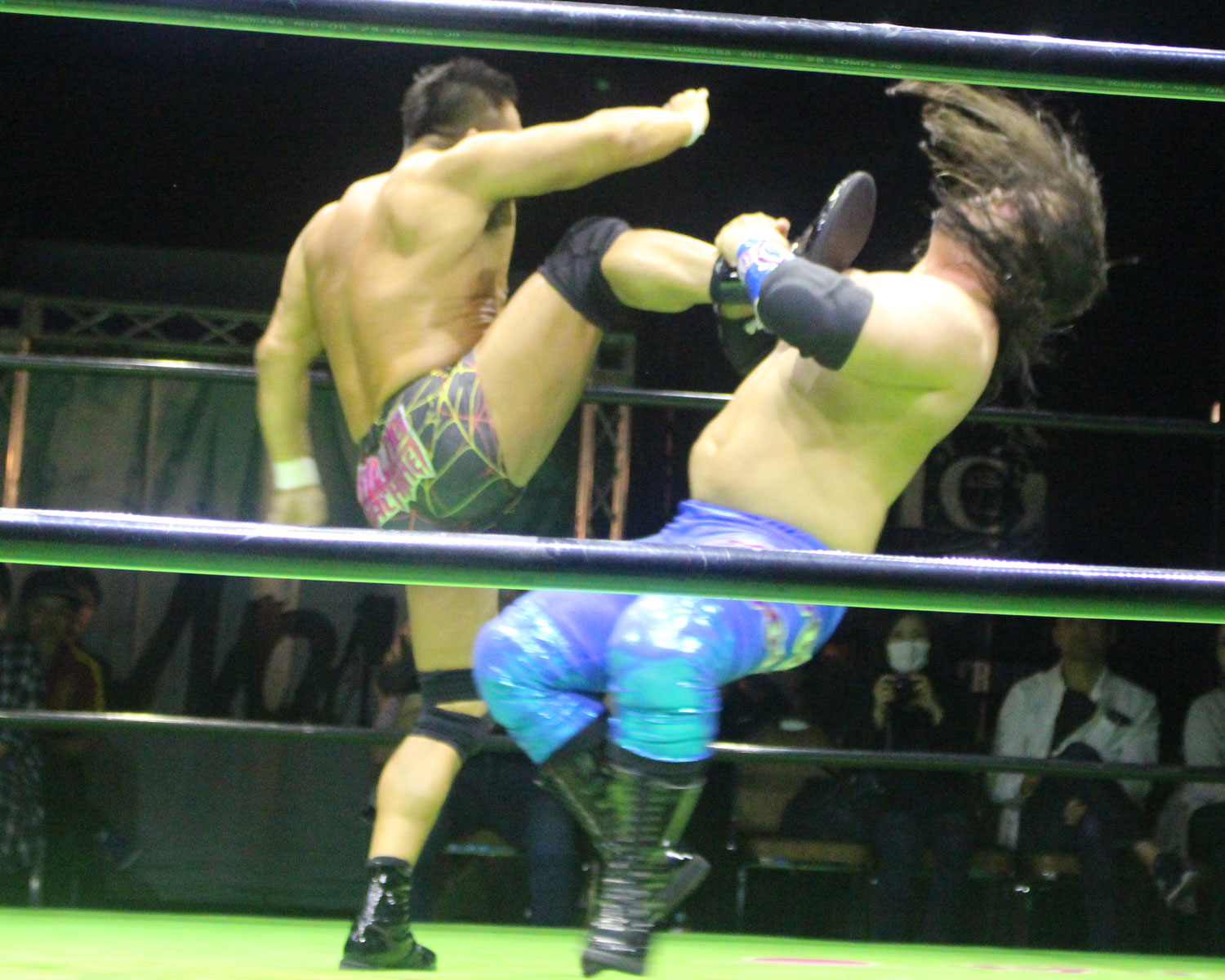 シュンは突進するBen-Kにドロップキックを放ち、場外に落ちたBen-Kに三角飛びプランチャを発射、リングに戻り飛距離のあるスワンダイブボディープレス、Ben-Kの串刺しを迎撃してクロスボディーを発射もmBen-Kがキャッチしてフロントスープレックスで投げる。
