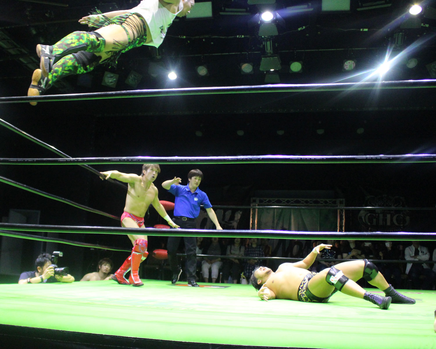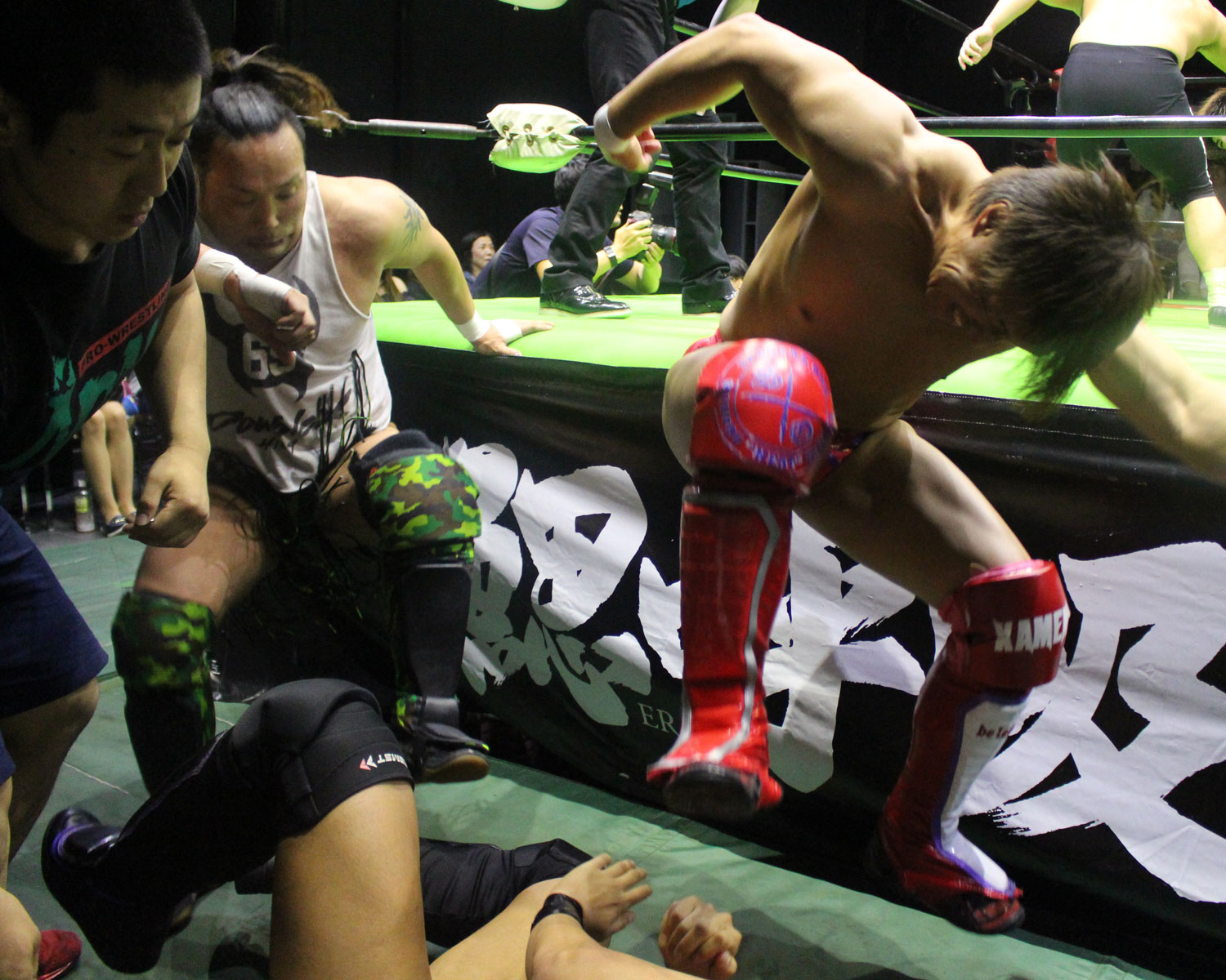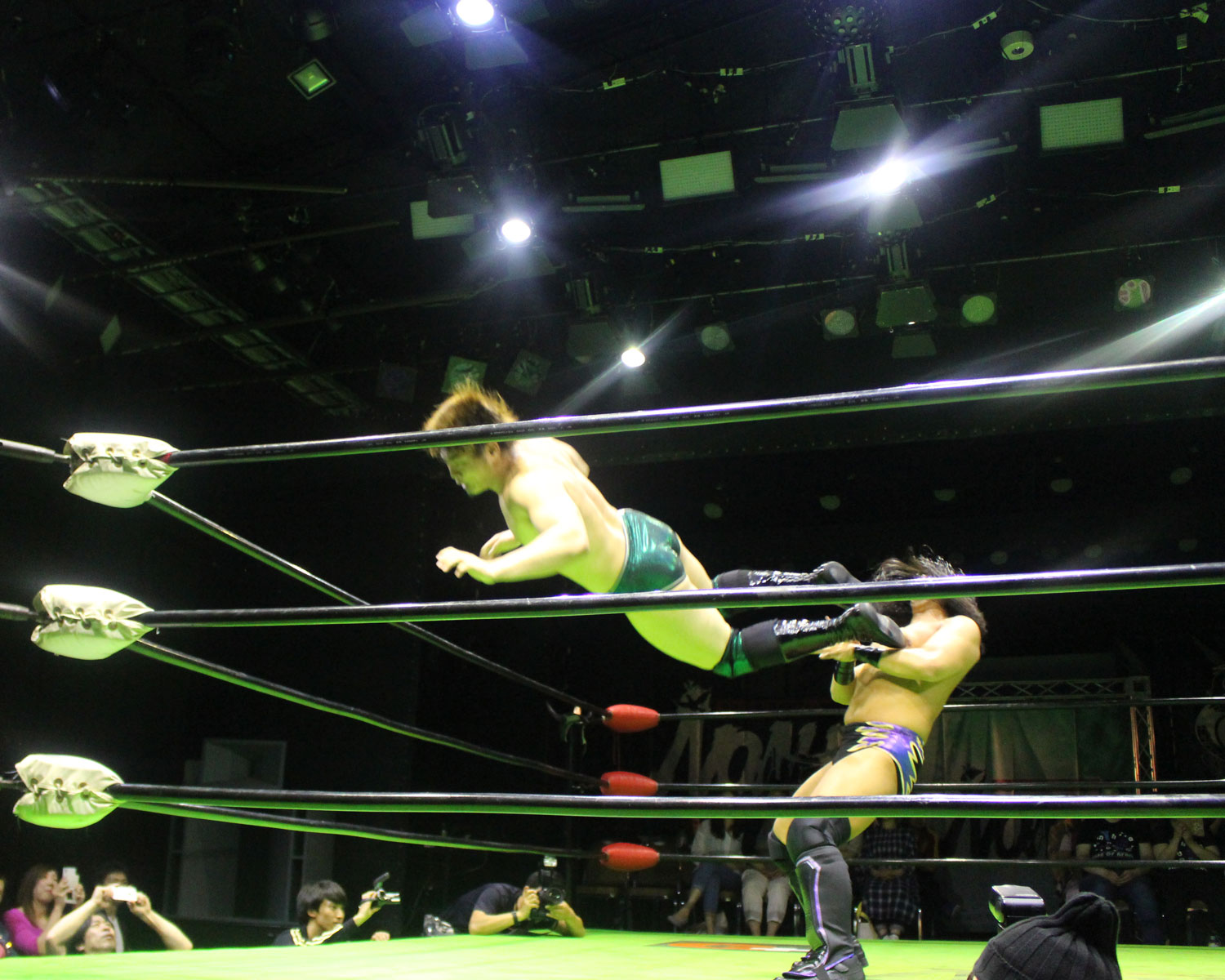 シュンは突進するBen-Kにドロップキックを放ち、場外に落ちたBen-Kに三角飛びプランチャを発射、リングに戻り飛距離のあるスワンダイブボディープレス、Ben-Kの串刺しを迎撃してクロスボディーを発射もmBen-Kがキャッチしてフロントスープレックスで投げる。