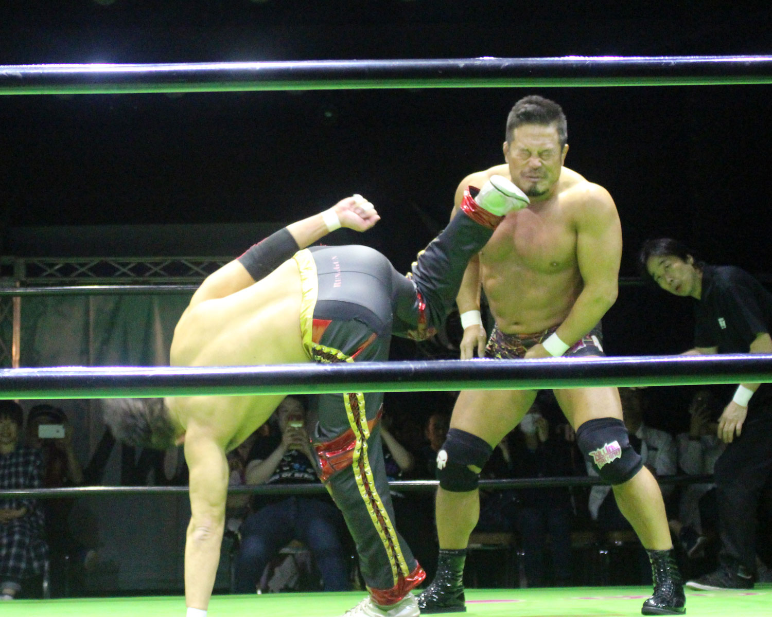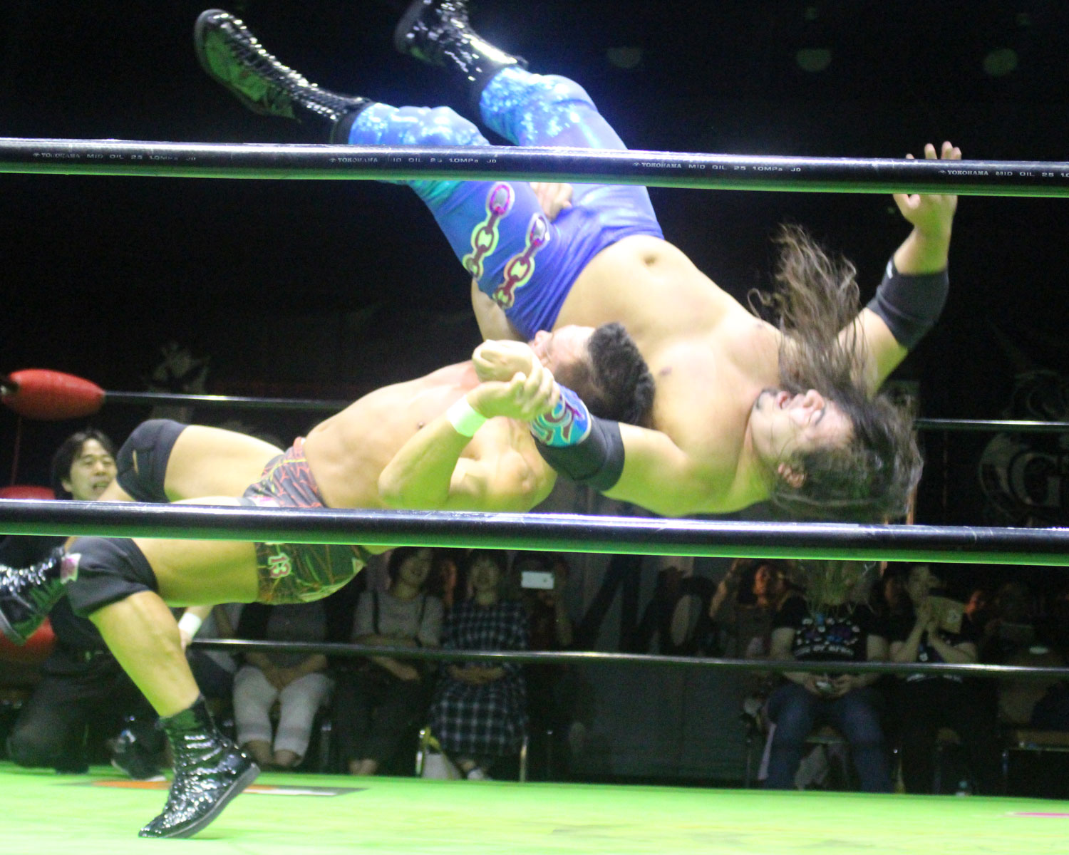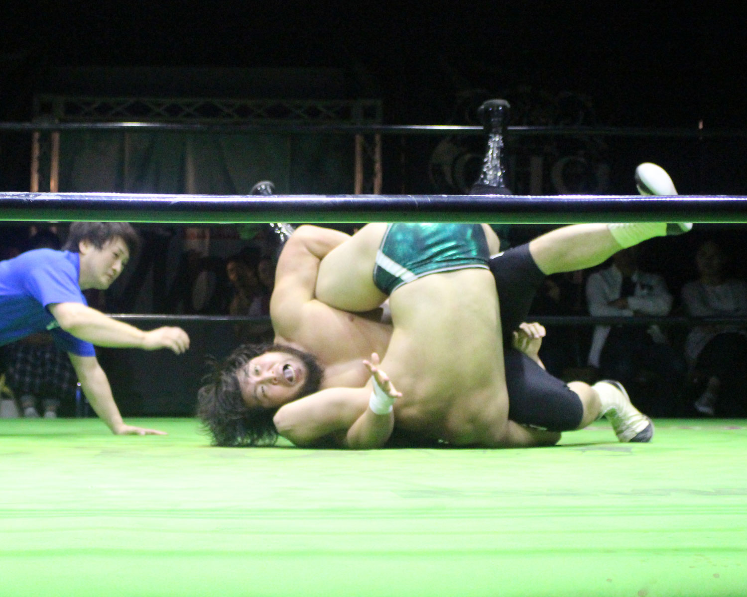 田口はリーを場外へ出すと三角飛びプランチャを発射し、リングに戻ってスワンダイブヒップアタック、もたれるリーにヒップアタックの連打、リーのドロップキックもかわしてヒップアタックと猛反撃するが、ギタったところで、リーが尻めがけてドロップキックを発射、だがリーは抱えると着地した田口がどどん狙いはリーが切り返し、、田口がラ・マヒストラルから丸め込み合戦も、リーがロープ越しのハイキックからのコーナーの攻撃を狙いは、田口は雪崩式狙うと、宙吊りになった田口にパタラス・エネル・ペチョを狙うが、かわした田口がオーマイ&ガーアンクルで捕獲する。
