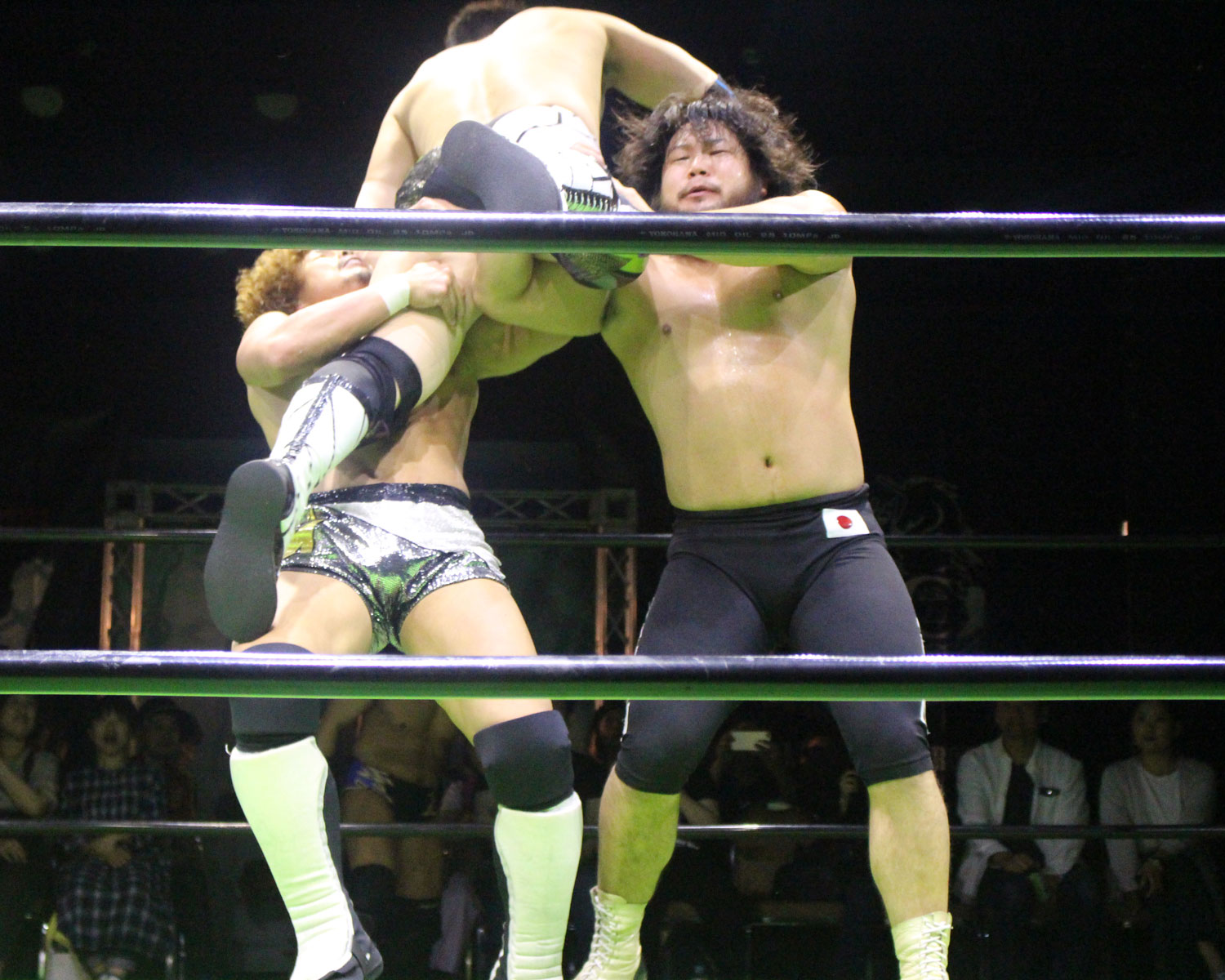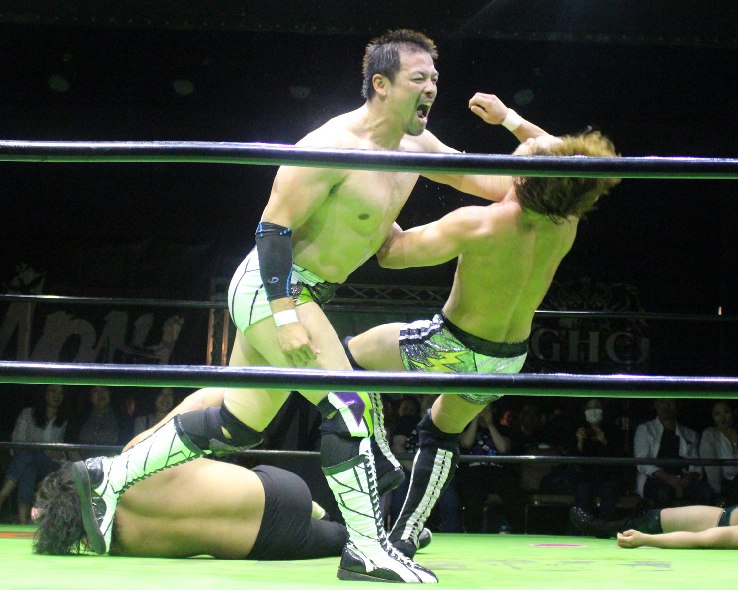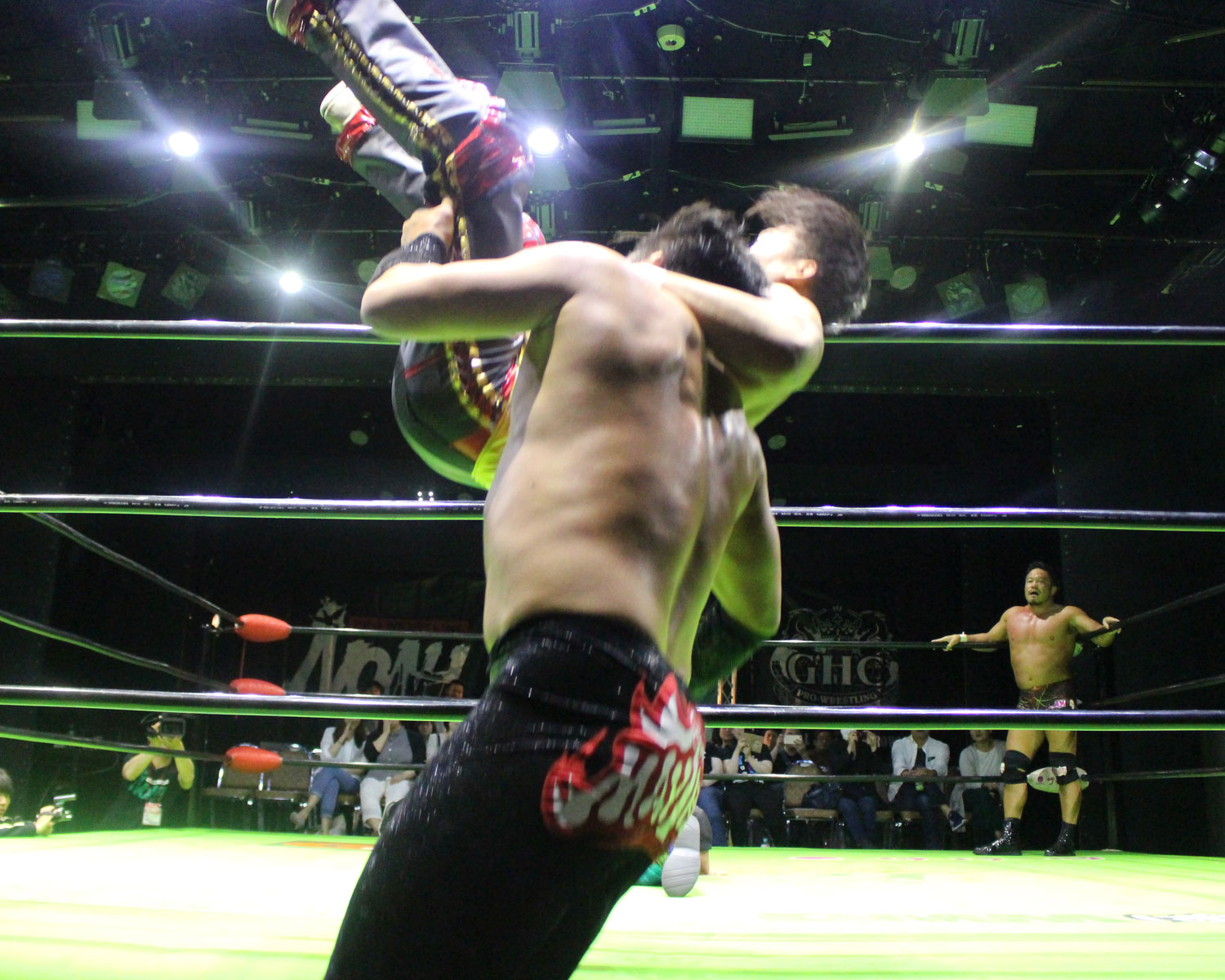 逃れたセイビンはヘッドロック高速DDTで反撃、セイビンはソバット、SHOの回転エビ固めをランニングローキック、場外に逃れたSHOにエプロンダッシュのランニングローキックからトペコンを発射、リングに戻ってミサイルキックと一気に流れを変え、セイビンは串刺しビックブーツからトップコーナーから雪崩式ブレーンバスター、しかしロープに飛び乗ってからのトルネードDDTは、SHOがキャッチしてアバランシュホールドで叩きつける。