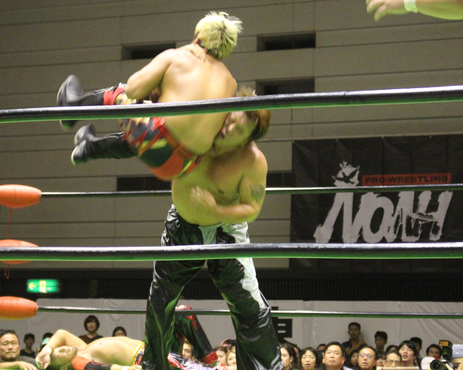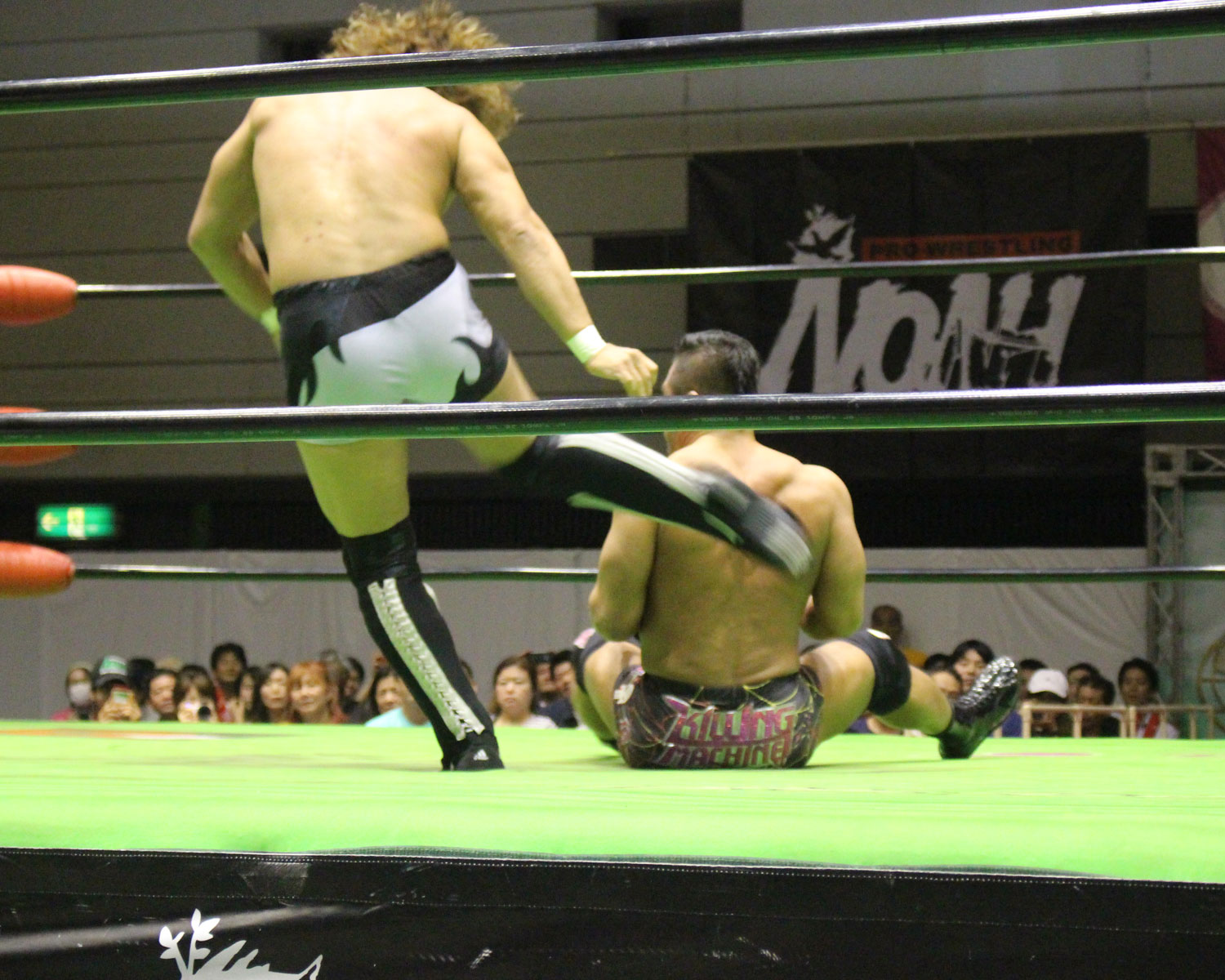 しかし中嶋に顎を蹴り上げらると、場外に逃れた杉浦をフェンスなどで痛めつけ、リング内では北宮がストームを仕留めにかかるが、サイトースープレックスを体を浴びせて潰したストームが低空クロスボディーからウデラリアットで逆転勝利も、中嶋は構わず杉浦を痛めつけて高笑いとなった。大阪大会は英雄伝目当てのファンも多かったが、NOAHの試合でもノリが良く大いに沸いた。両国大会からNOAHも良いムードで来ているだけに、持続させるだけでなく発展させて欲しい。