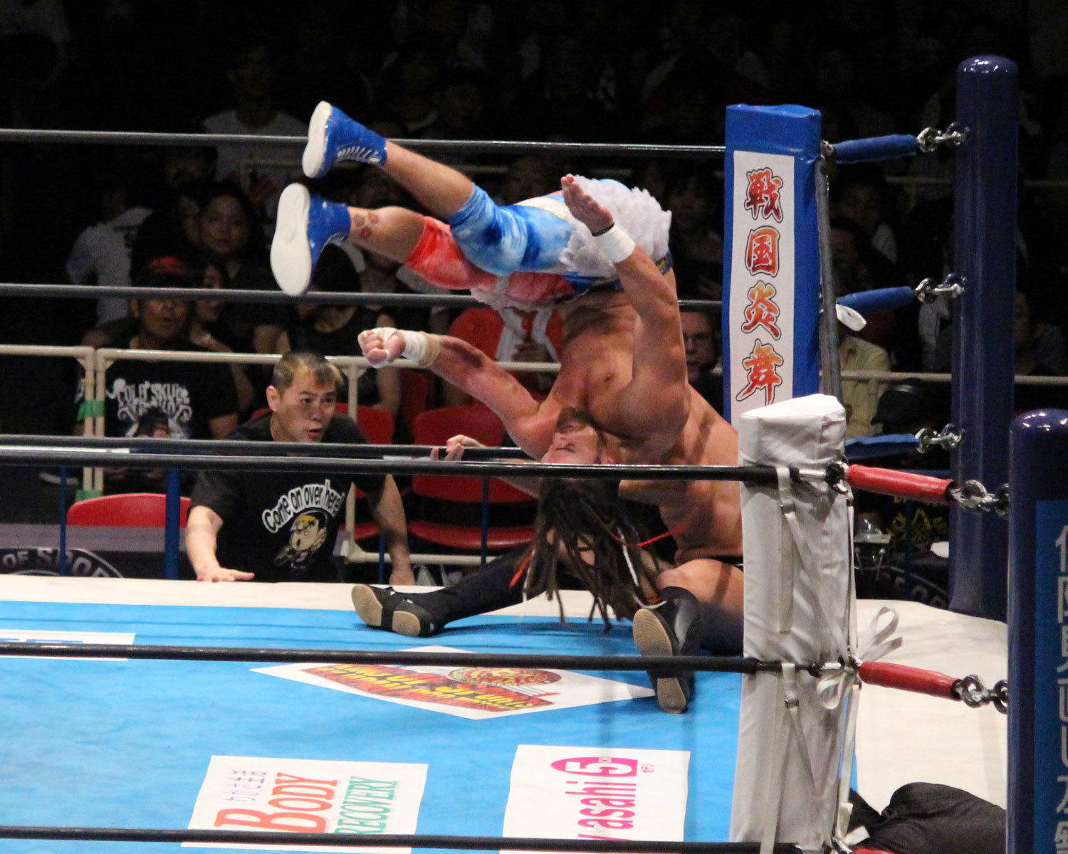 後藤は雪崩式牛殺しを狙うが、脱出した飯伏がコーナーの後藤にオーバーヘッドキックを放ち、今度は飯伏が雪崩式狙うが、後藤が回天を狙うと、着地した飯伏はカウンターのラリアットを炸裂させ、カミゴエを狙うが、後藤がエルボーで逃れるも、手を離さない飯伏はクロスアームスープレックスからカミゴエを狙う。