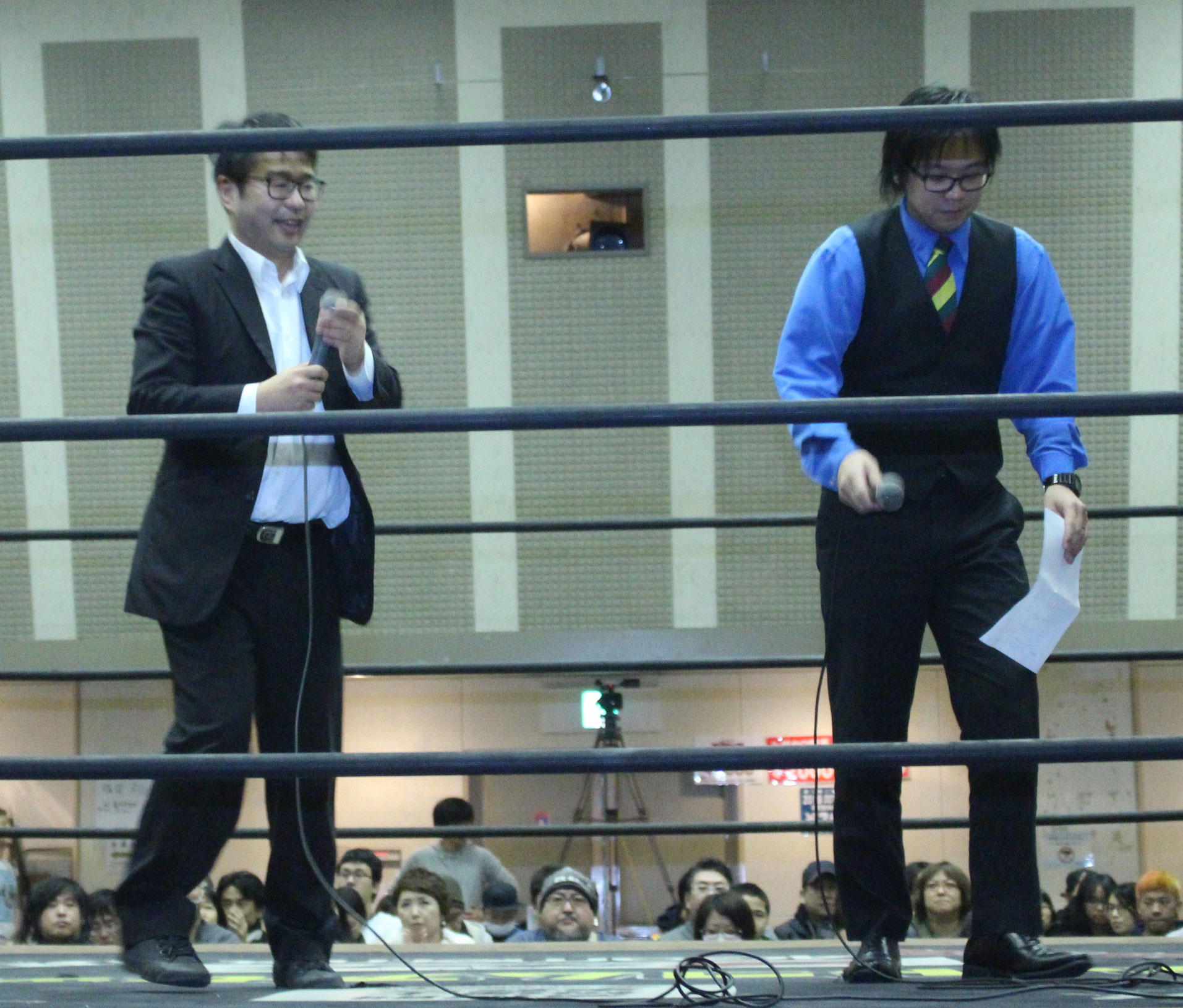 ササダンゴ「3・25両国で闘いたい相手がいる(とイケメンとのシングルマッチを熱望)イケメンさんばかり試合に出てて、ひょうきん枠が完全に移行している」(ササダンゴ)とのこと。さらに自身の保持している「アイアンマンヘビーメタル級王座を懸けて闘いたい」とアピールし、ディーノに蹂躙されまくって息も絶え絶えなイケメンが「両国でシングルマッチできるんですか? よろしくお願いしまーす!」と即答。これにて3・25両国でのササダンゴvsイケメンのアイアンマンヘビーメタル級戦も決定したが、「もっといろんなところで防衛戦をやってほしい。話題になるから」(今林AP)というDDTサイドの意向により、週2回の防衛戦というノルマを達成しなければタイトルマッチにすらならないことがアナウンスされた。)(最後に3・25両国大会でグレート・ムタと6人タッグマッチで対戦するディーノはパートナーについてまず大家を発表。もう一人の怪奇派枠に名乗り上げたのが石井。ディーノとのタッグ戦績を「25勝10敗」となんら考えることなくスラスラ言える程の“怪奇派”な石井をディーノが認めて対ムタのトリオが正式決定したが、その背後から佐々木と遠藤が現れ、2人にミストを噴霧。毒霧かと思われたが「安心しろ。ただのコーラだ」と明かした佐々木は、自宅でハイな状態になっている時にムタと会ったという。「グレート・ムタはDAMNATIONのペットだってことだ。両国、覚悟しとけ!」と吐き捨てて退場した。)