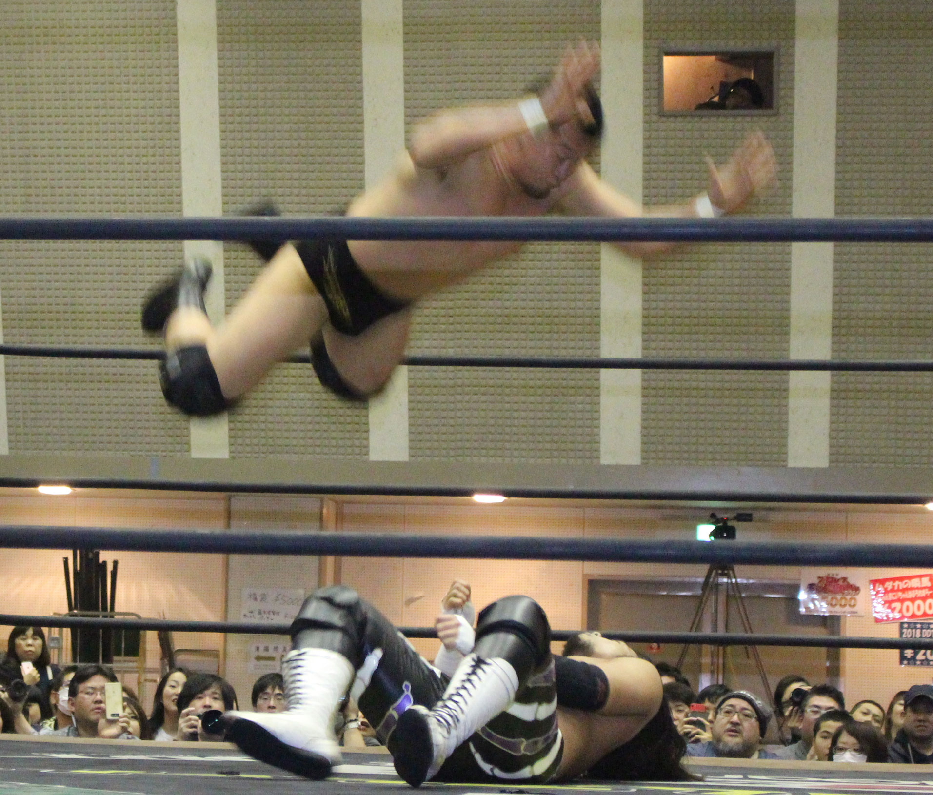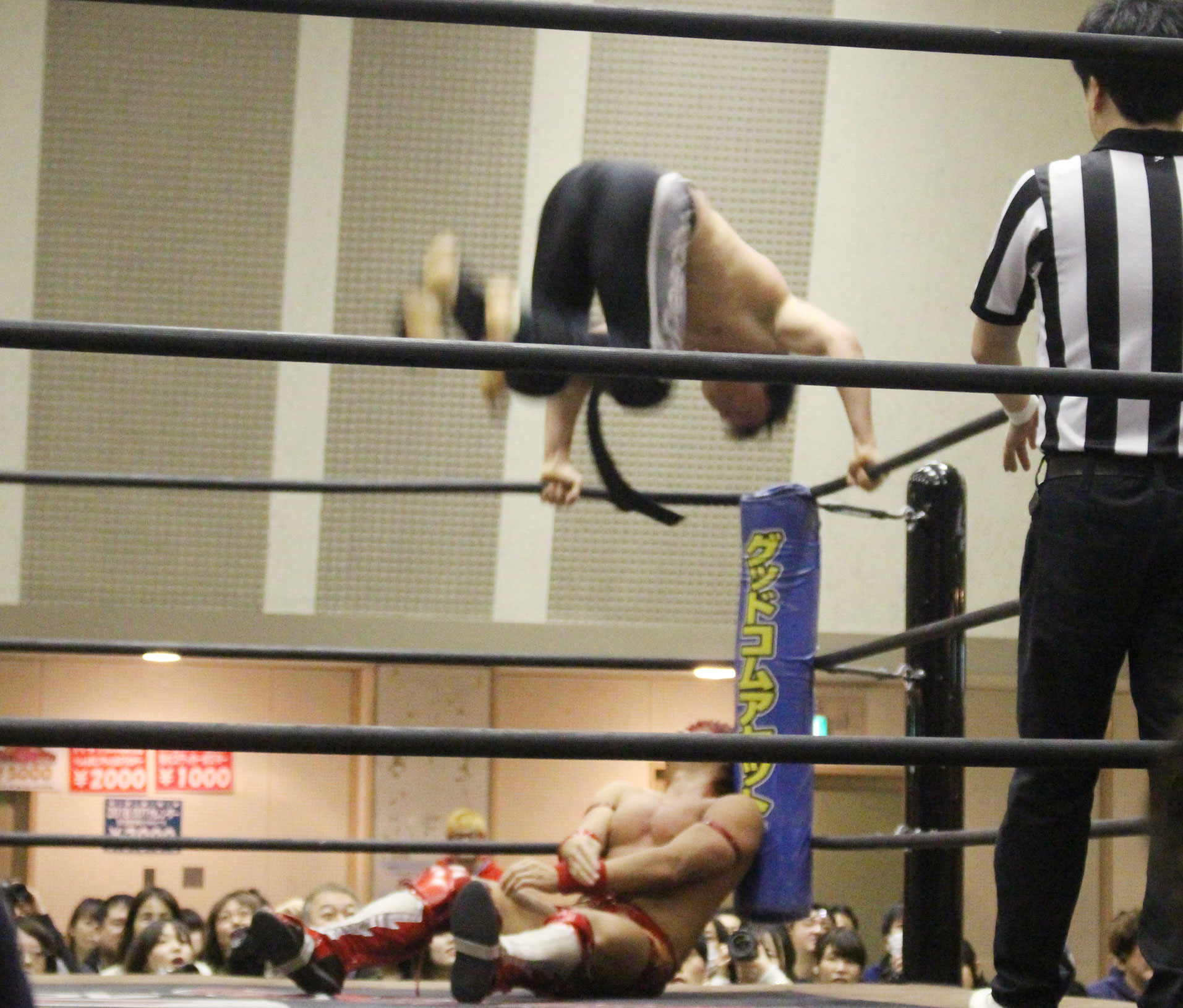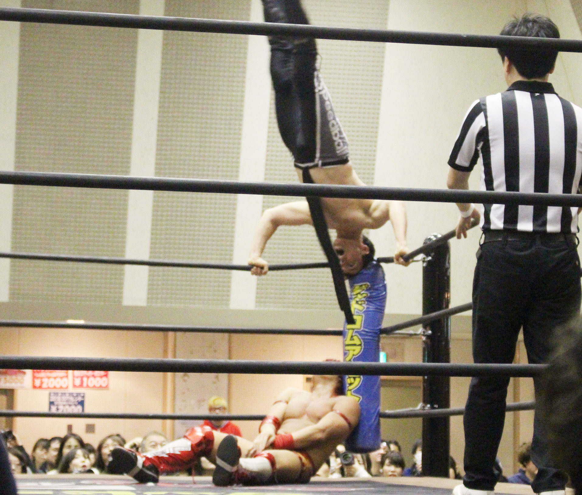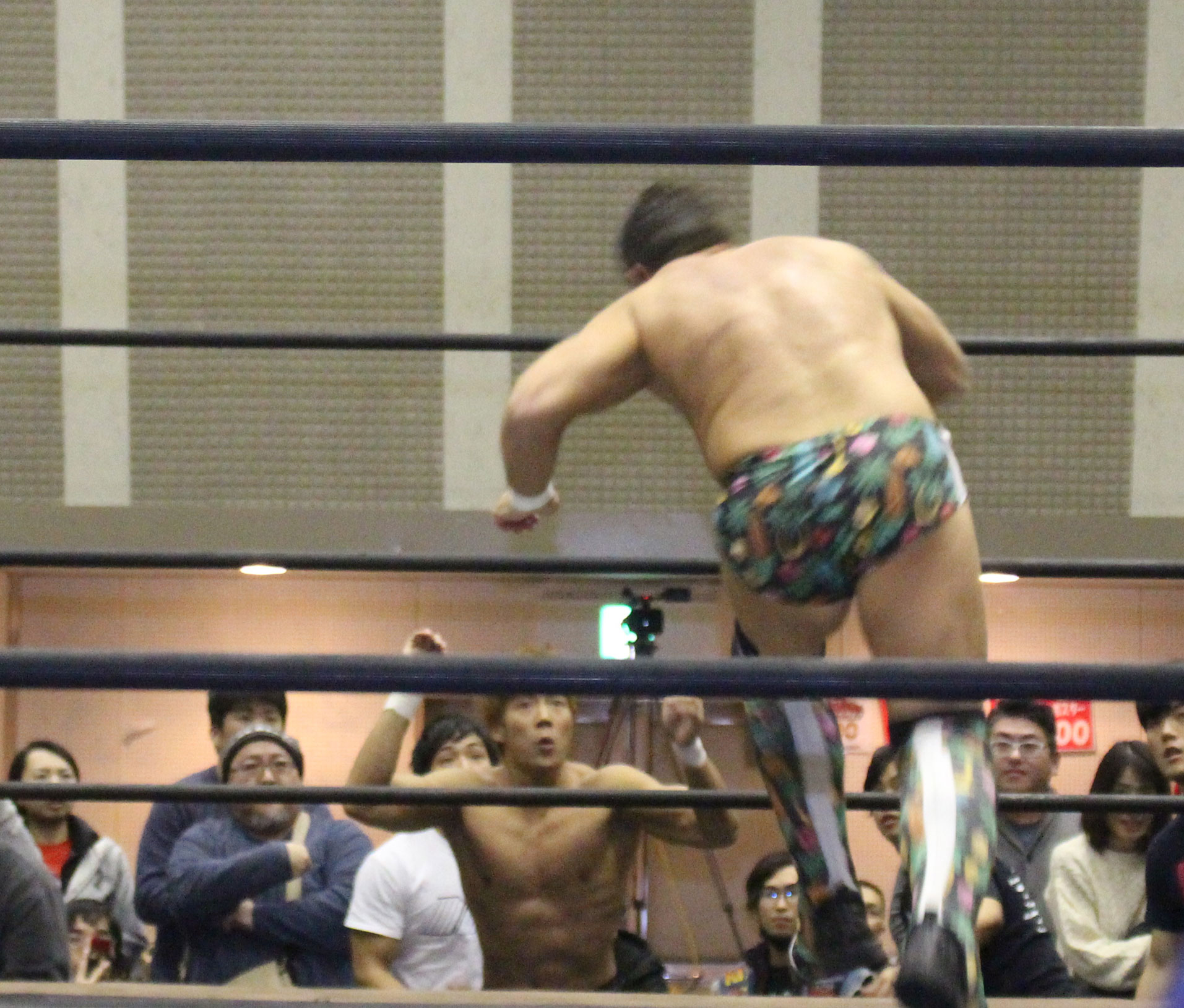 両者はエルボー合戦も、竹下のラリアット狙いは、黒潮がかわしてニークラッシャーを決めると、エプロンに連行してからエプロンめがけてニークラッシャーを敢行、そして足四の字固めで捕獲し、飛び膝蹴り、イケメンサルトの連発からイケメンクラッチで竹下を追い詰める。