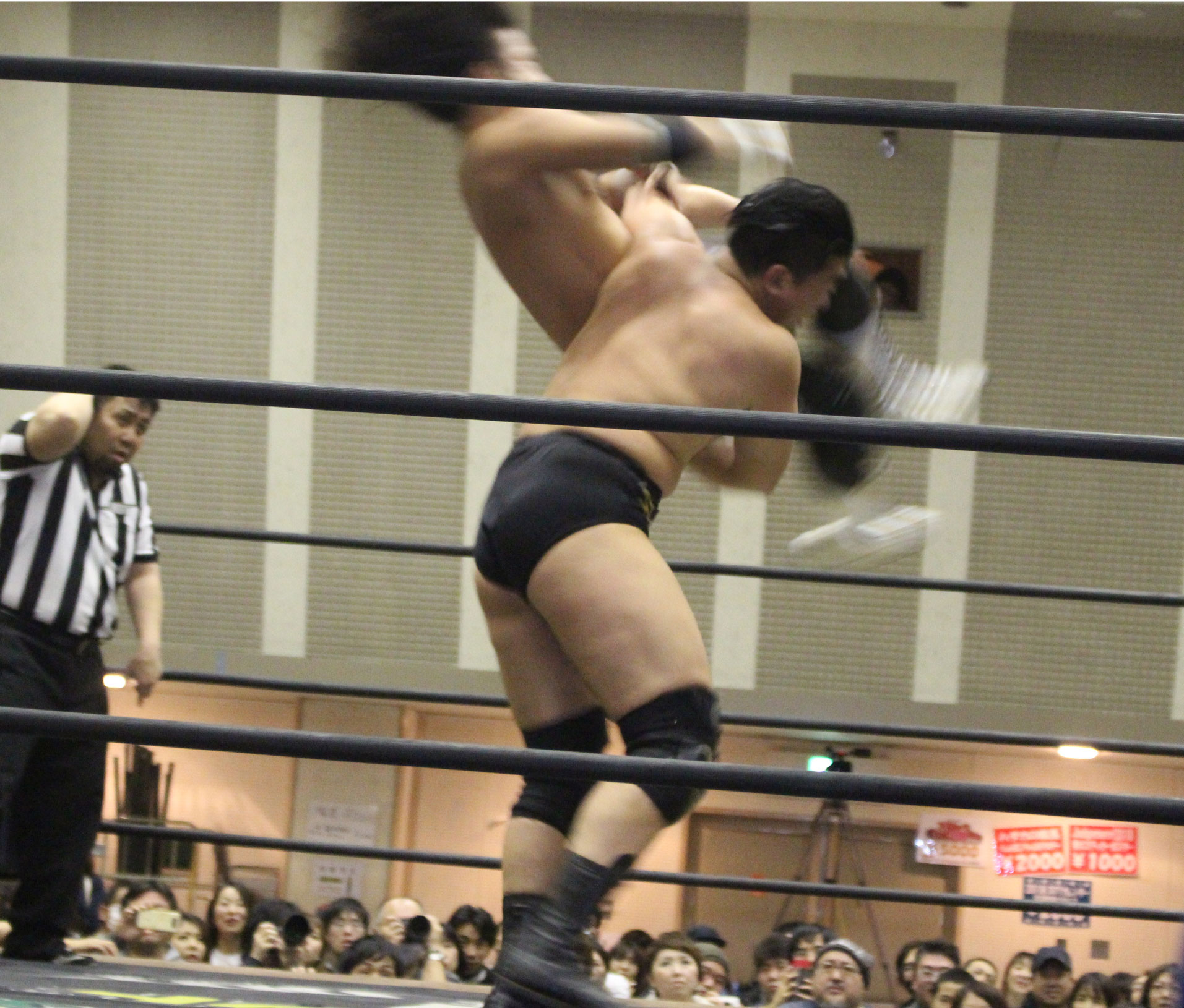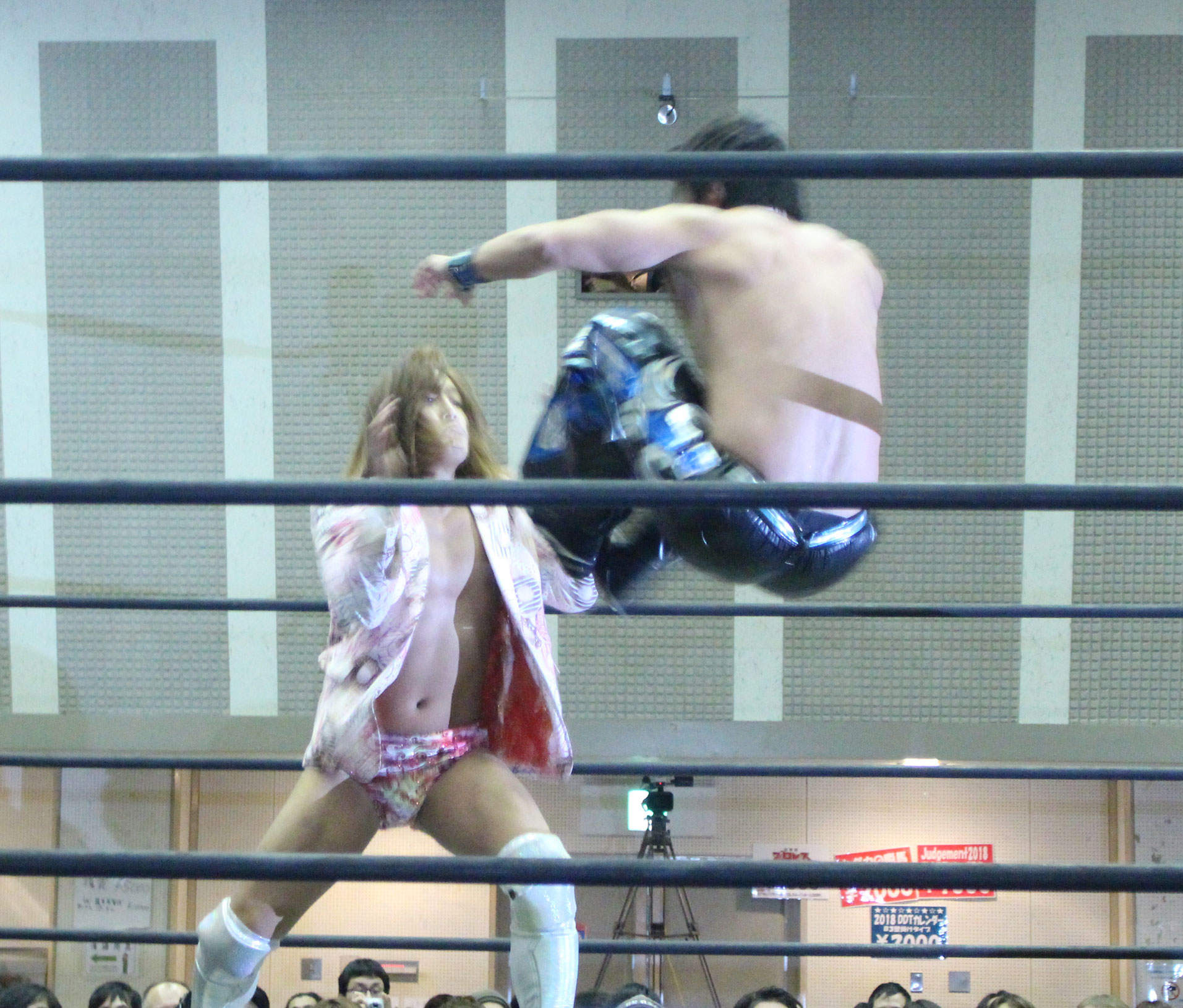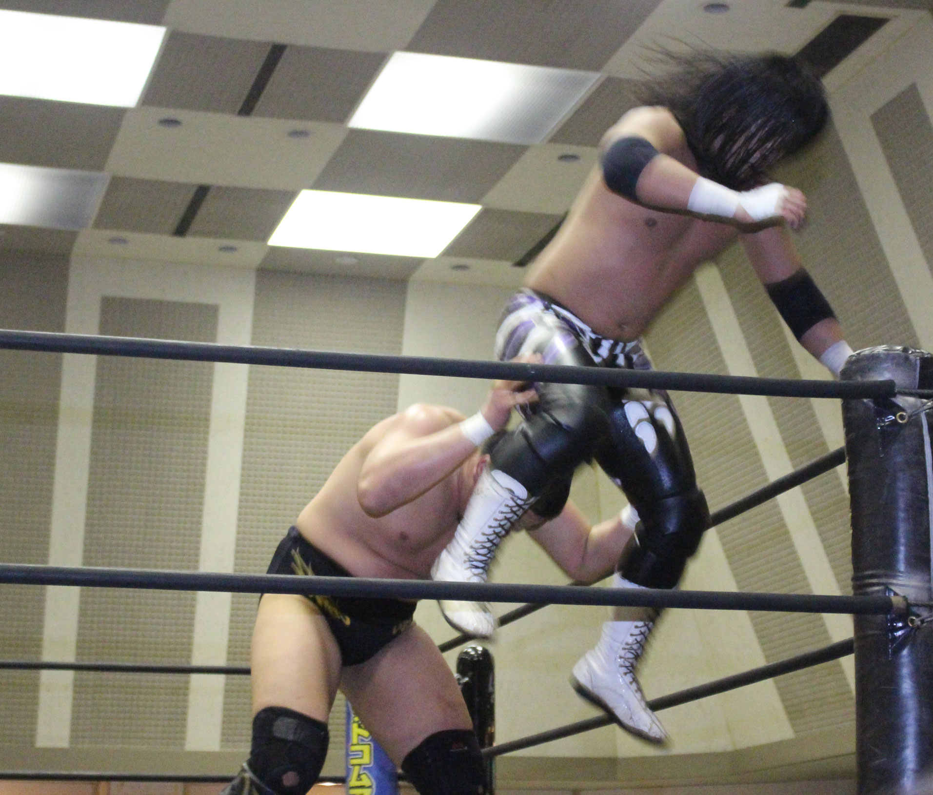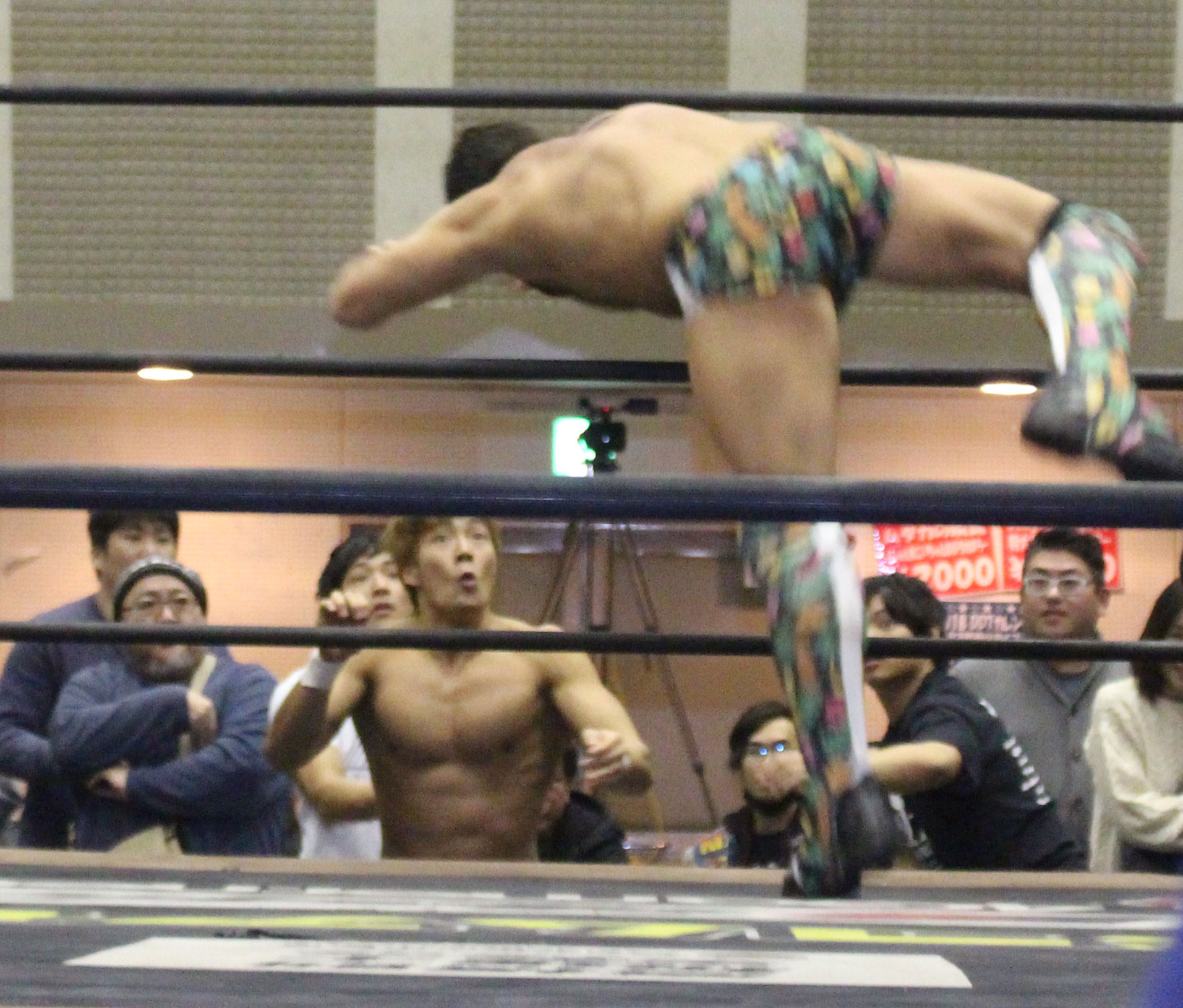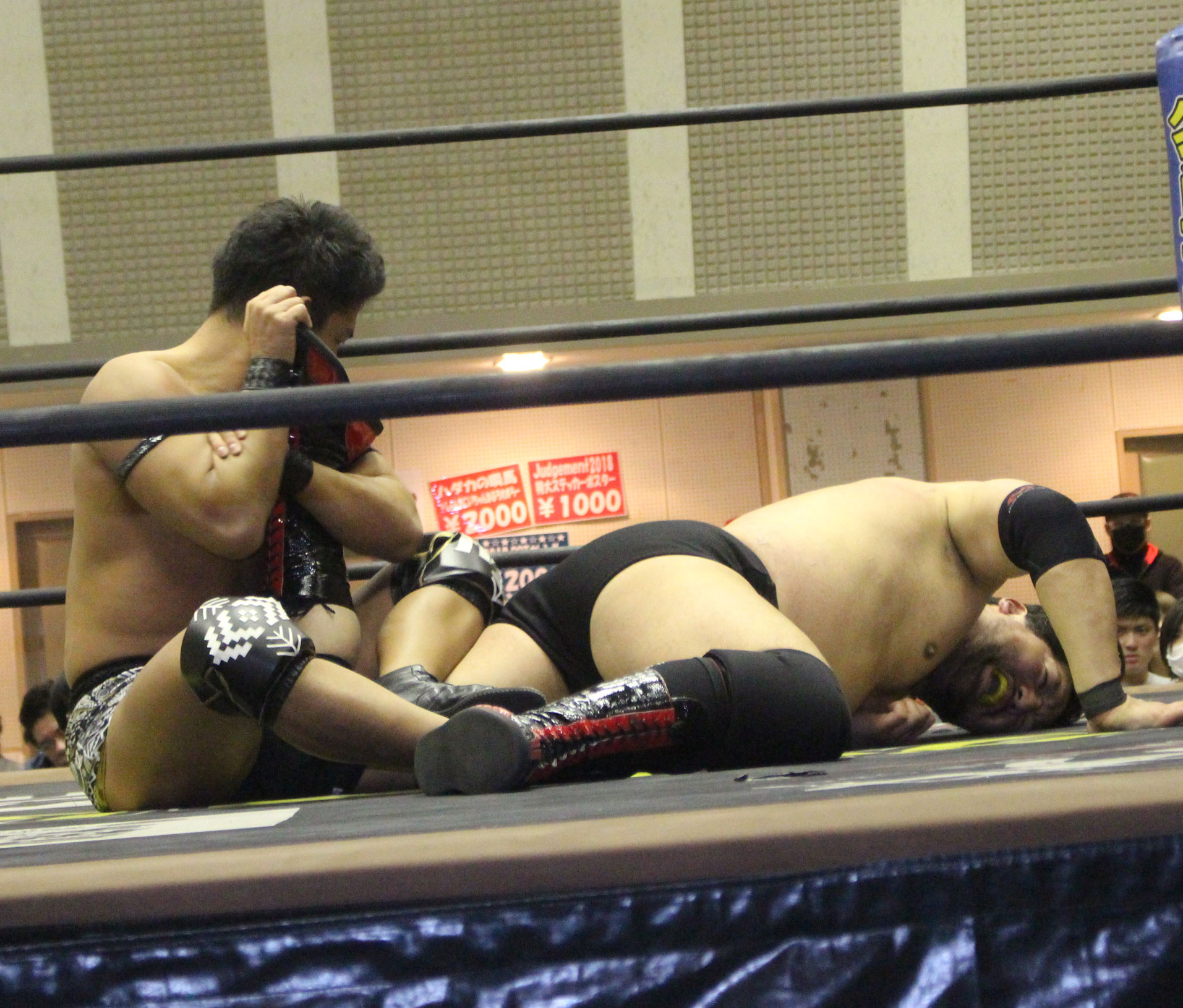 先手を奪われた竹下は逆にヘッドシザースから首攻めを展開するが、黒潮はファイヤーマンズキャリーの体勢からコーナーへぶつけ、ローキックだけでなく、急所への頭突きとラフも織り交ぜ、バスソーキックからスワントーンボムを投下、竹下をコーナーに逆さ吊りにしてfrom to コーナーを放つも、竹下はブルーサンダーで反撃し、黒潮のライオンサルトも剣山で迎撃する。