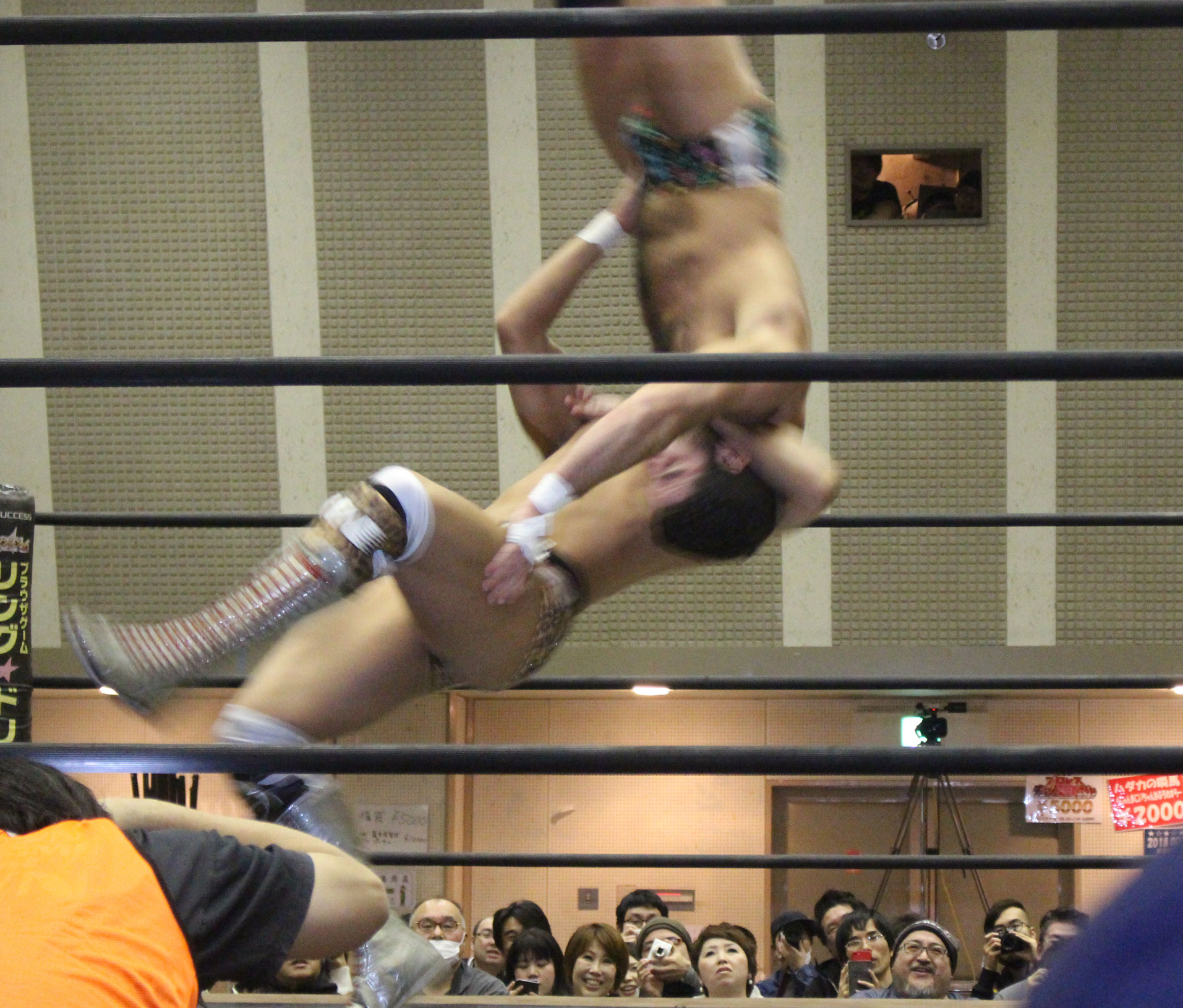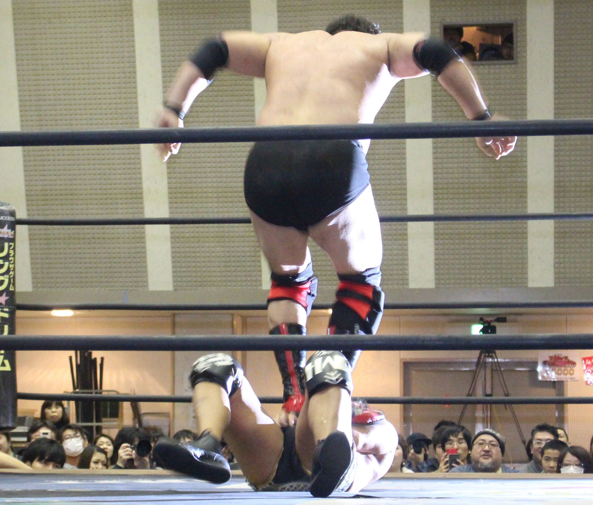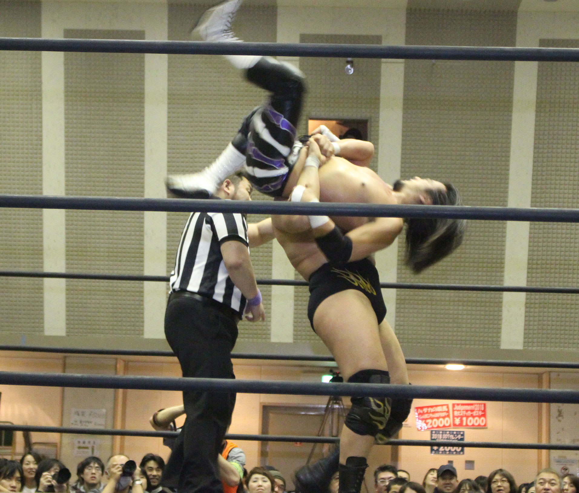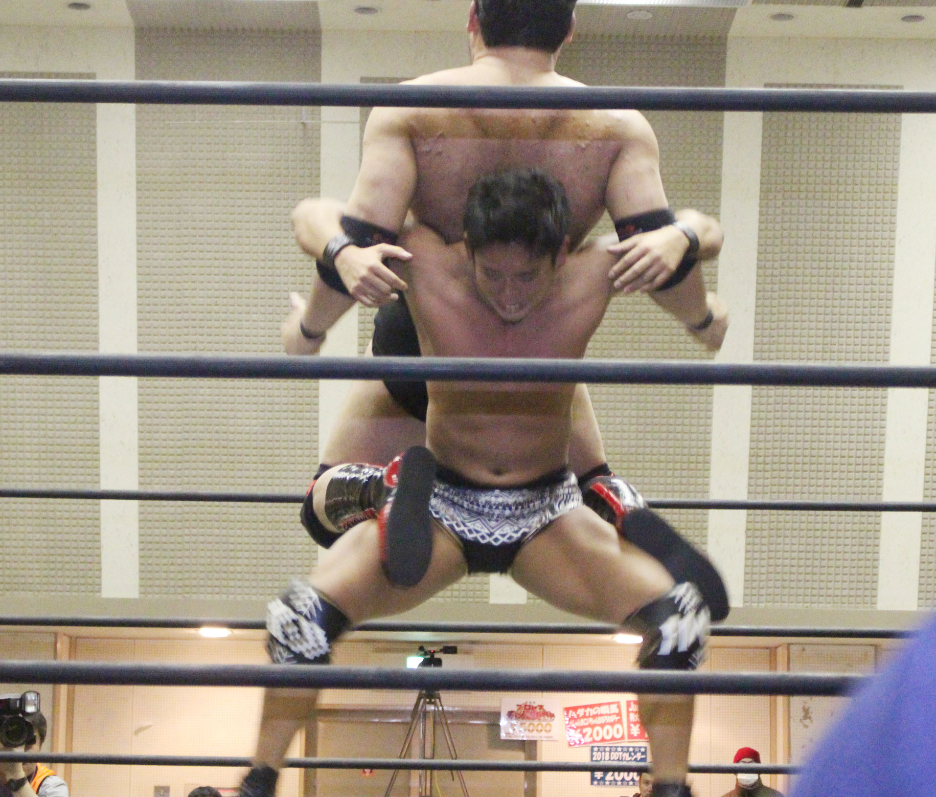 先手を奪われた竹下は逆にヘッドシザースから首攻めを展開するが、黒潮はファイヤーマンズキャリーの体勢からコーナーへぶつけ、ローキックだけでなく、急所への頭突きとラフも織り交ぜ、バスソーキックからスワントーンボムを投下、竹下をコーナーに逆さ吊りにしてfrom to コーナーを放つも、竹下はブルーサンダーで反撃し、黒潮のライオンサルトも剣山で迎撃する。