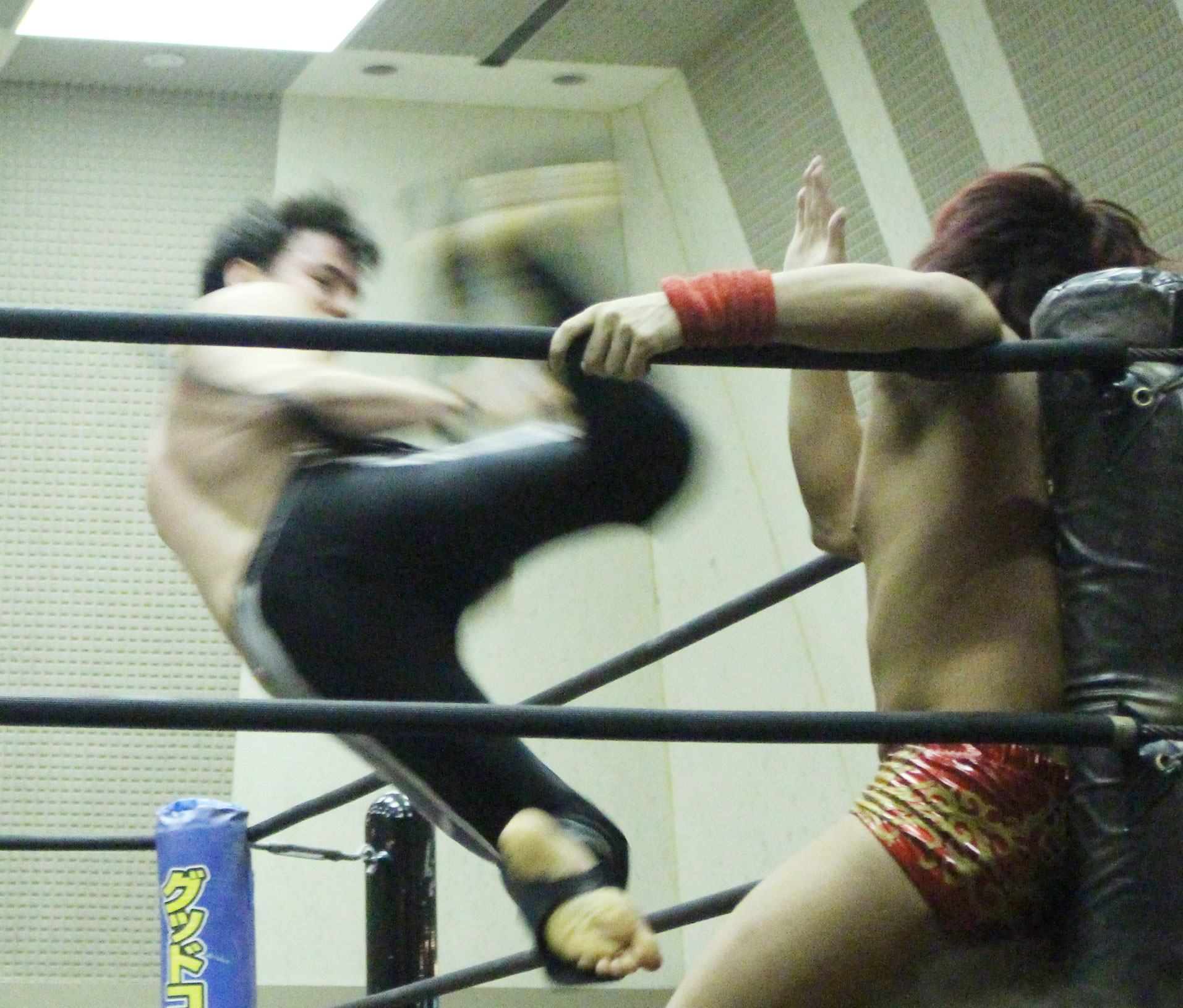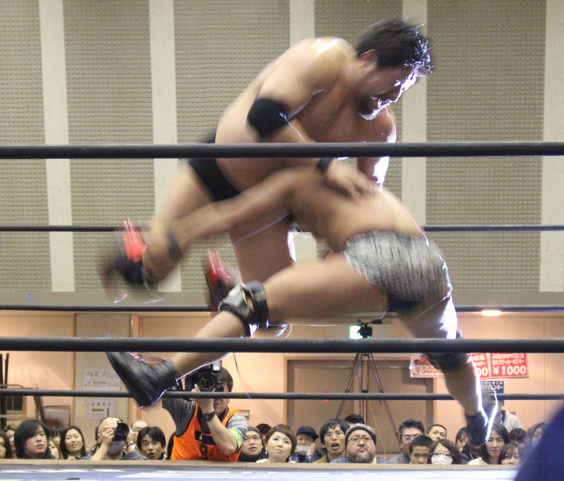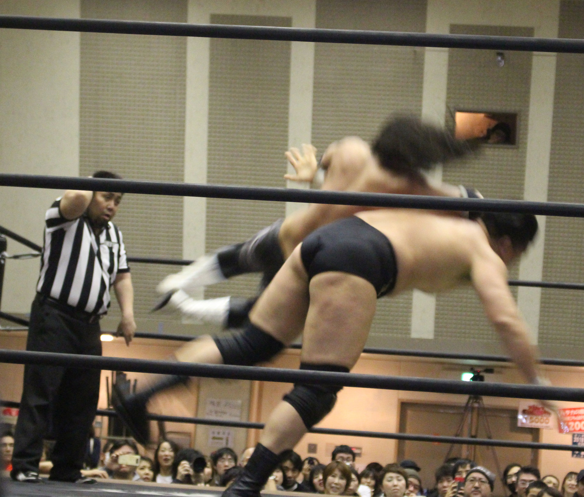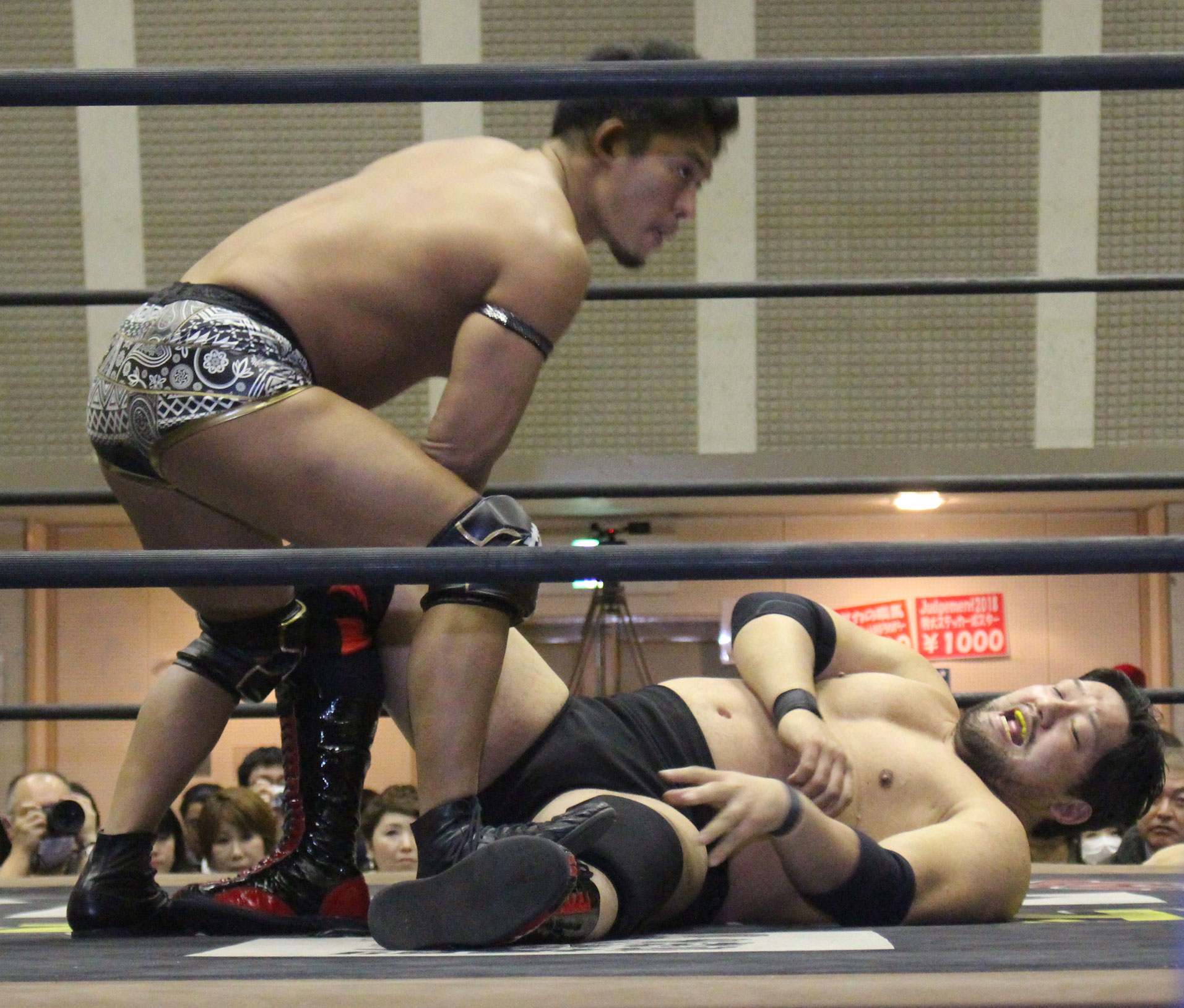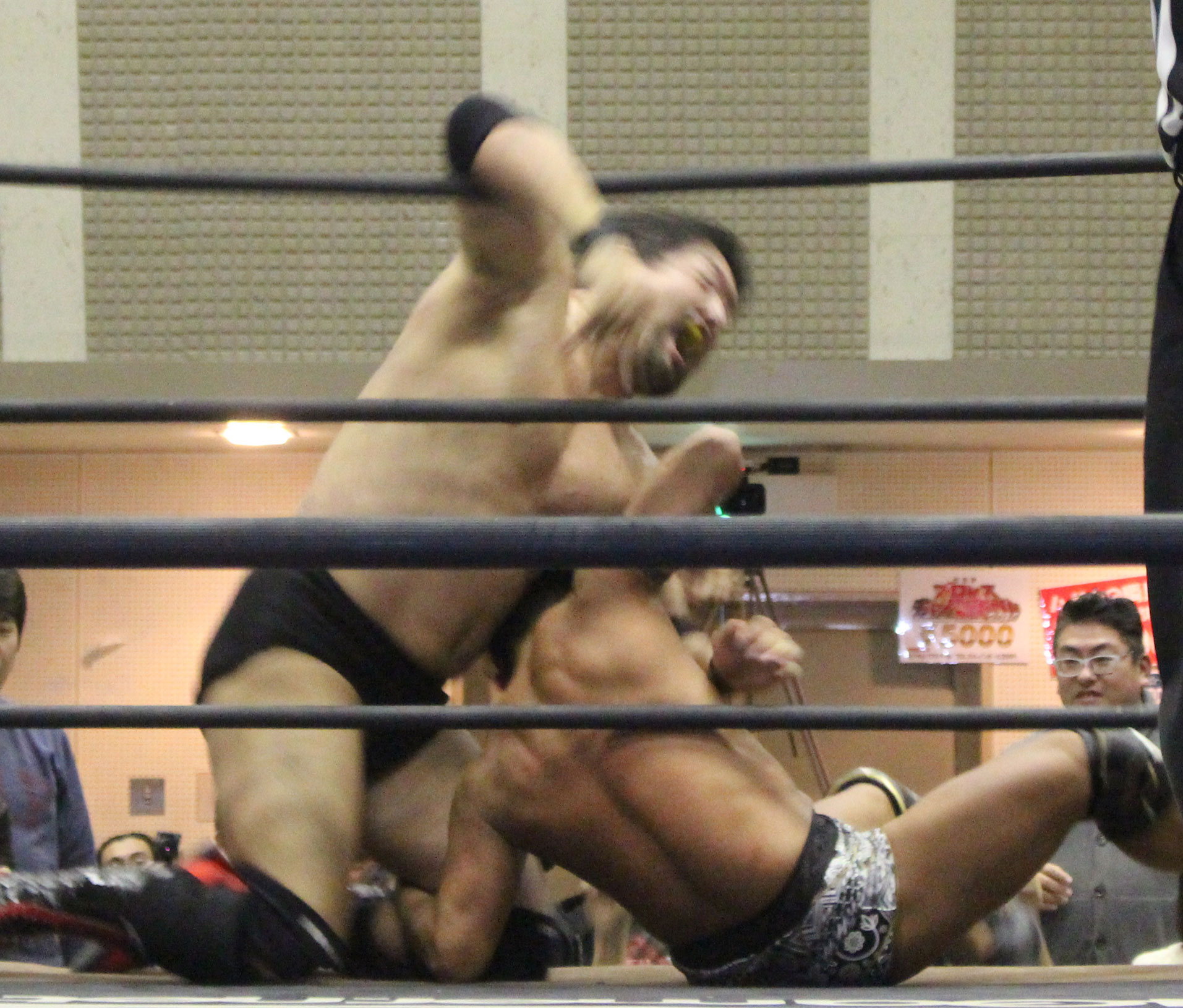 先手を奪われた竹下は逆にヘッドシザースから首攻めを展開するが、黒潮はファイヤーマンズキャリーの体勢からコーナーへぶつけ、ローキックだけでなく、急所への頭突きとラフも織り交ぜ、バスソーキックからスワントーンボムを投下、竹下をコーナーに逆さ吊りにしてfrom to コーナーを放つも、竹下はブルーサンダーで反撃し、黒潮のライオンサルトも剣山で迎撃する。