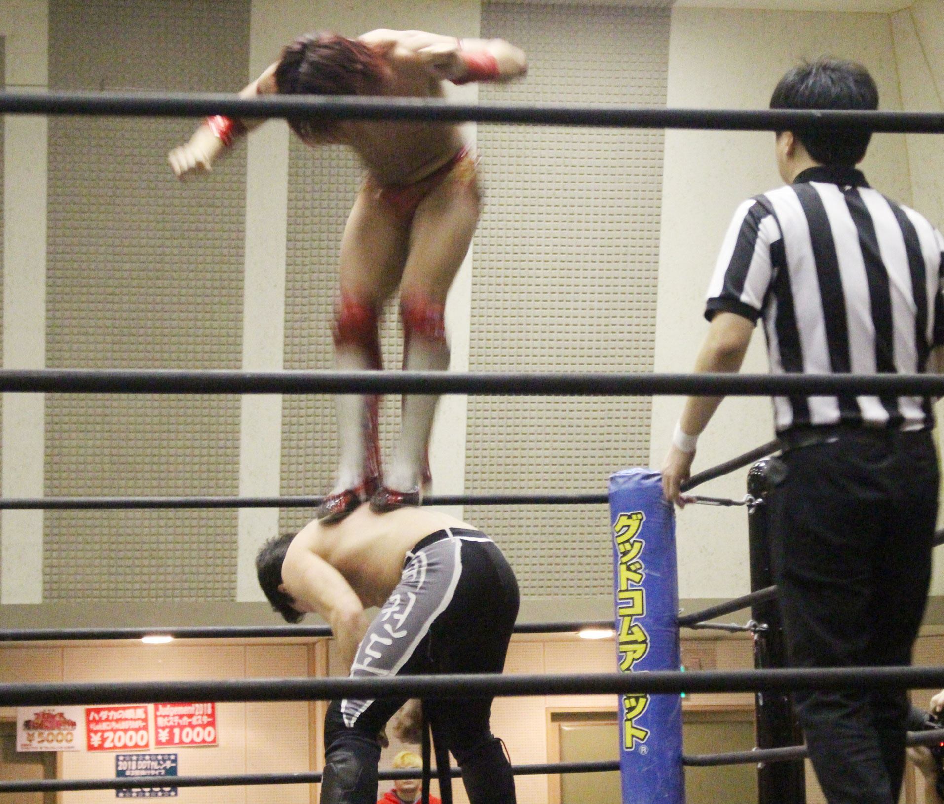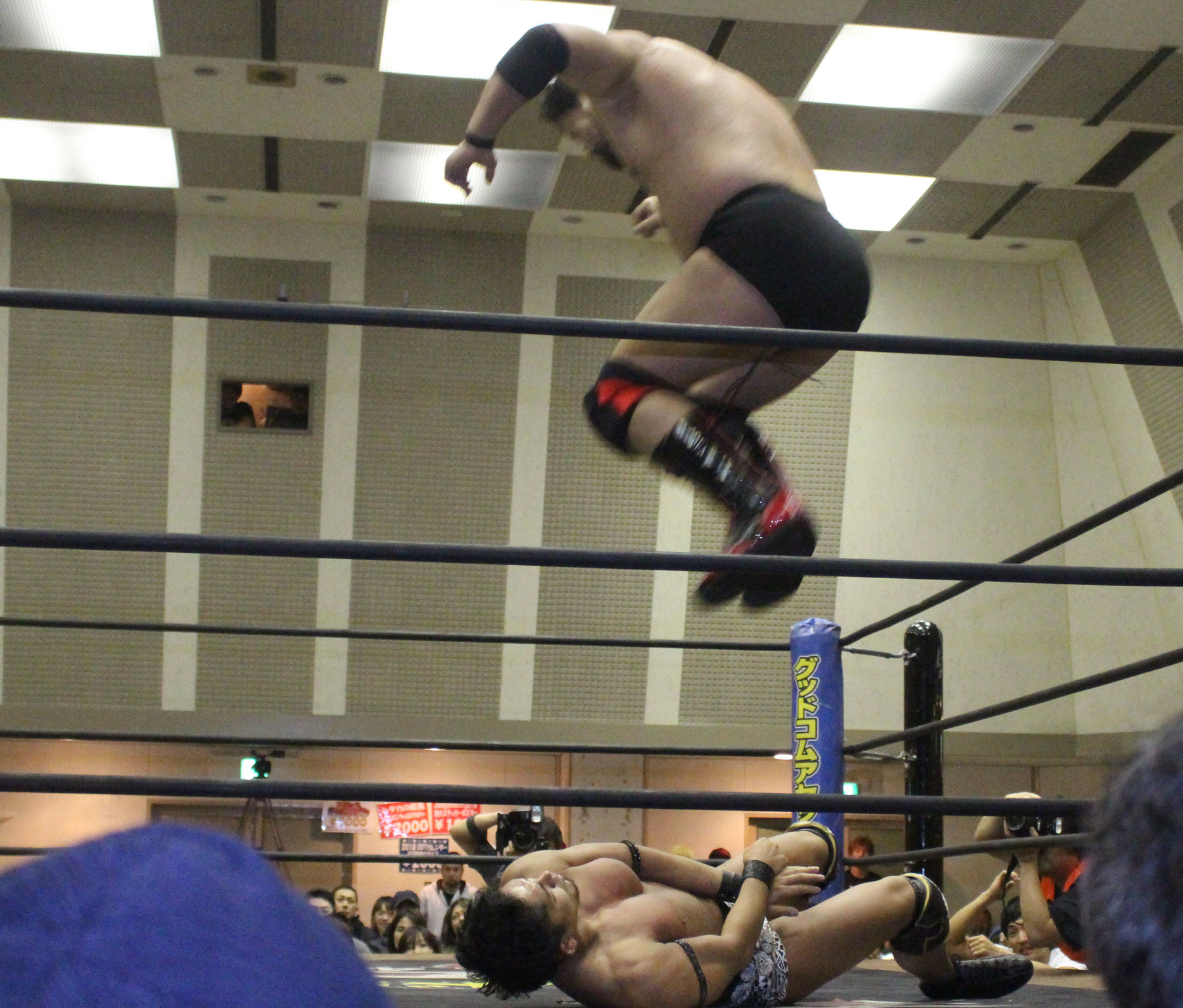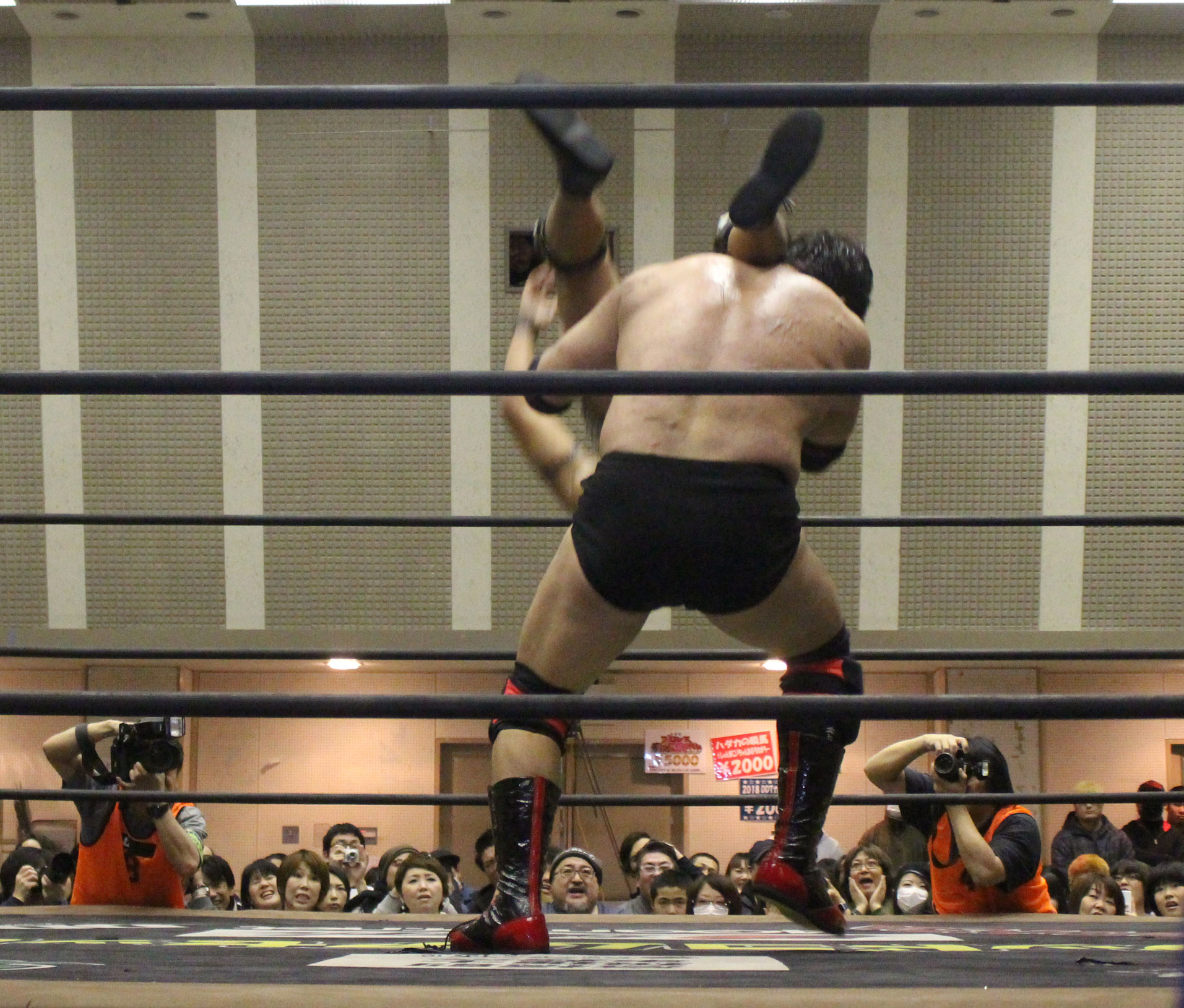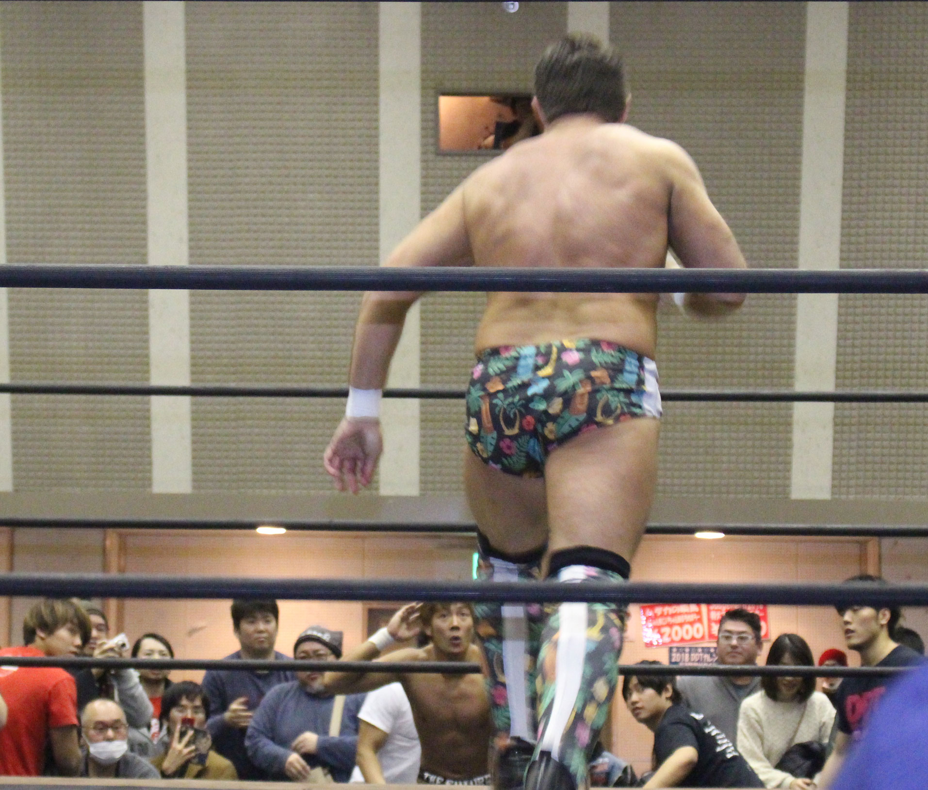 先手を奪われた竹下は逆にヘッドシザースから首攻めを展開するが、黒潮はファイヤーマンズキャリーの体勢からコーナーへぶつけ、ローキックだけでなく、急所への頭突きとラフも織り交ぜ、バスソーキックからスワントーンボムを投下、竹下をコーナーに逆さ吊りにしてfrom to コーナーを放つも、竹下はブルーサンダーで反撃し、黒潮のライオンサルトも剣山で迎撃する。