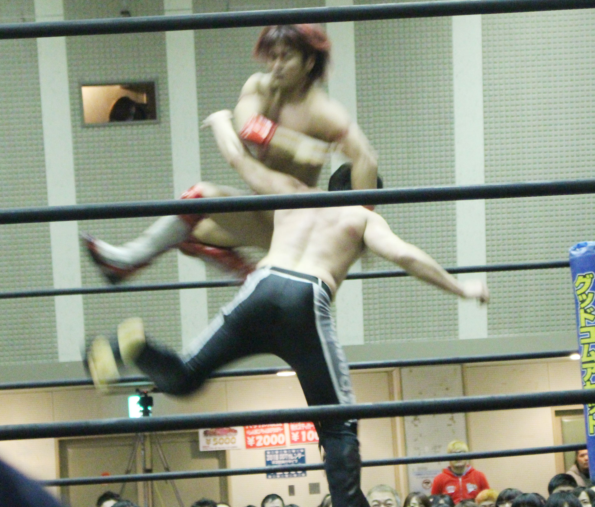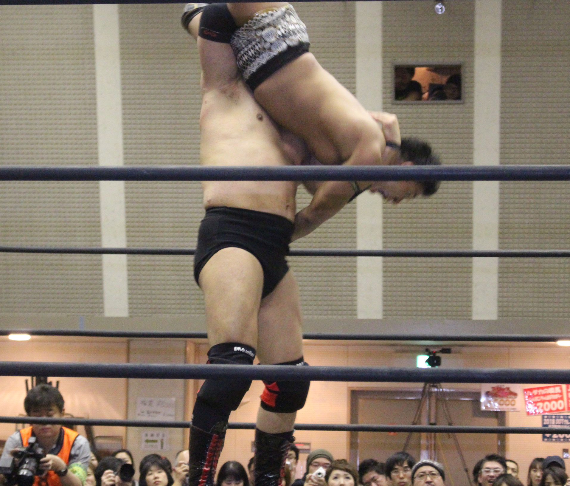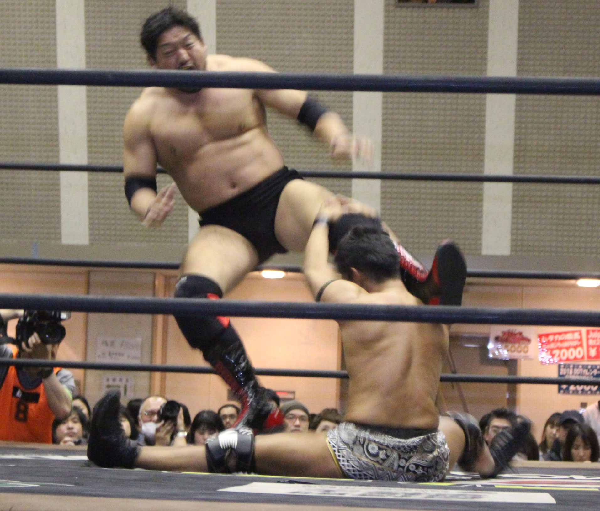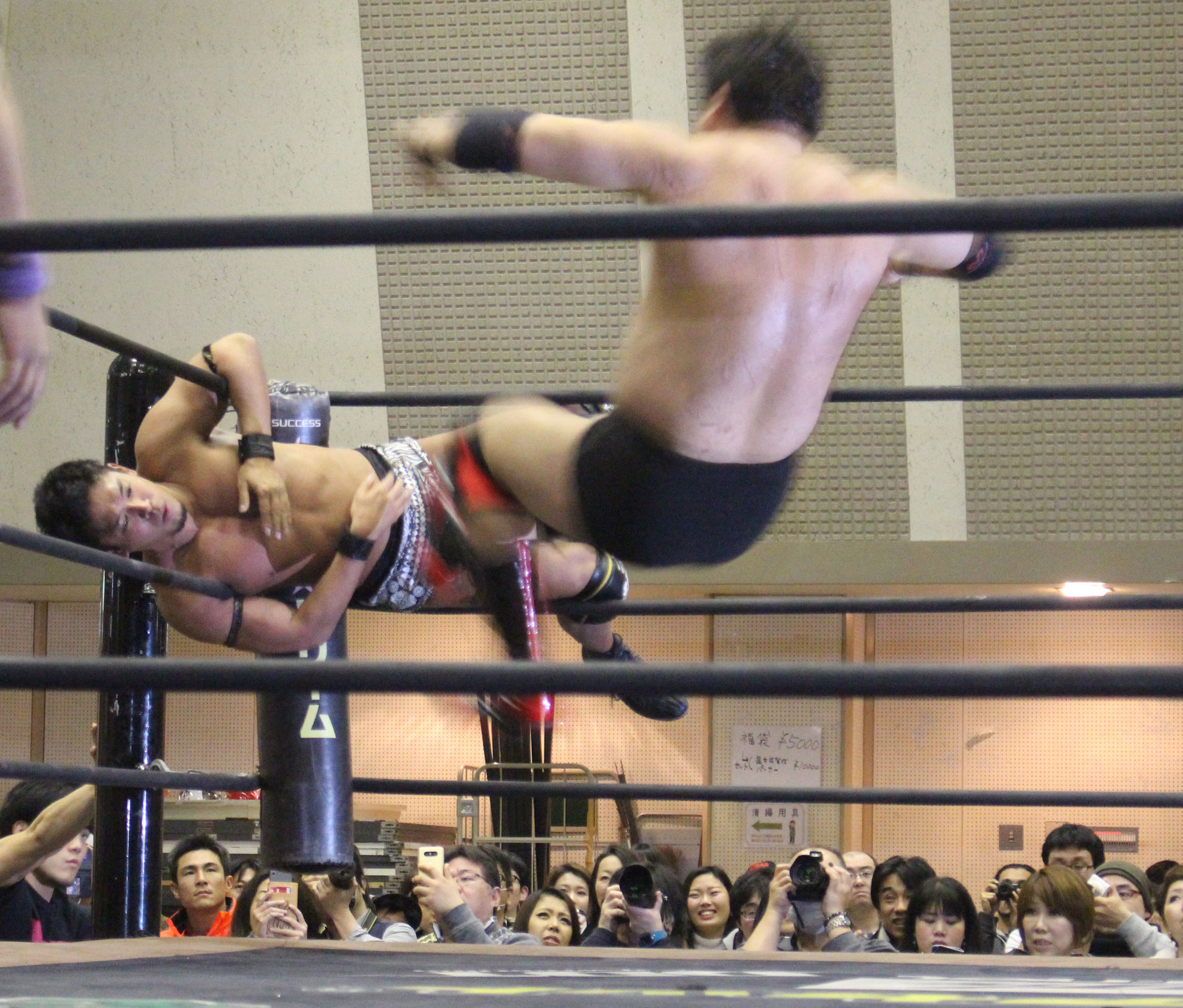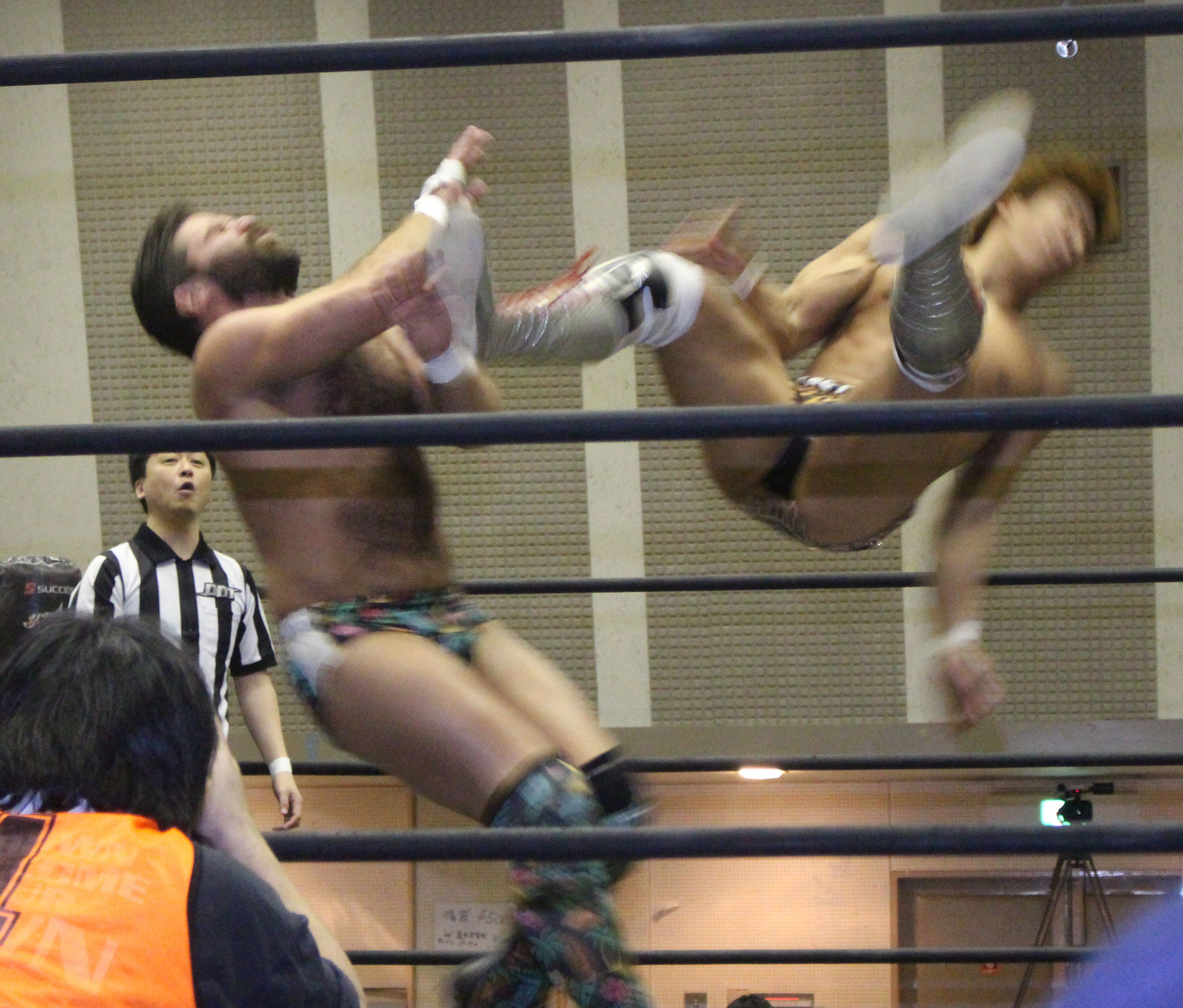 先手を奪われた竹下は逆にヘッドシザースから首攻めを展開するが、黒潮はファイヤーマンズキャリーの体勢からコーナーへぶつけ、ローキックだけでなく、急所への頭突きとラフも織り交ぜ、バスソーキックからスワントーンボムを投下、竹下をコーナーに逆さ吊りにしてfrom to コーナーを放つも、竹下はブルーサンダーで反撃し、黒潮のライオンサルトも剣山で迎撃する。