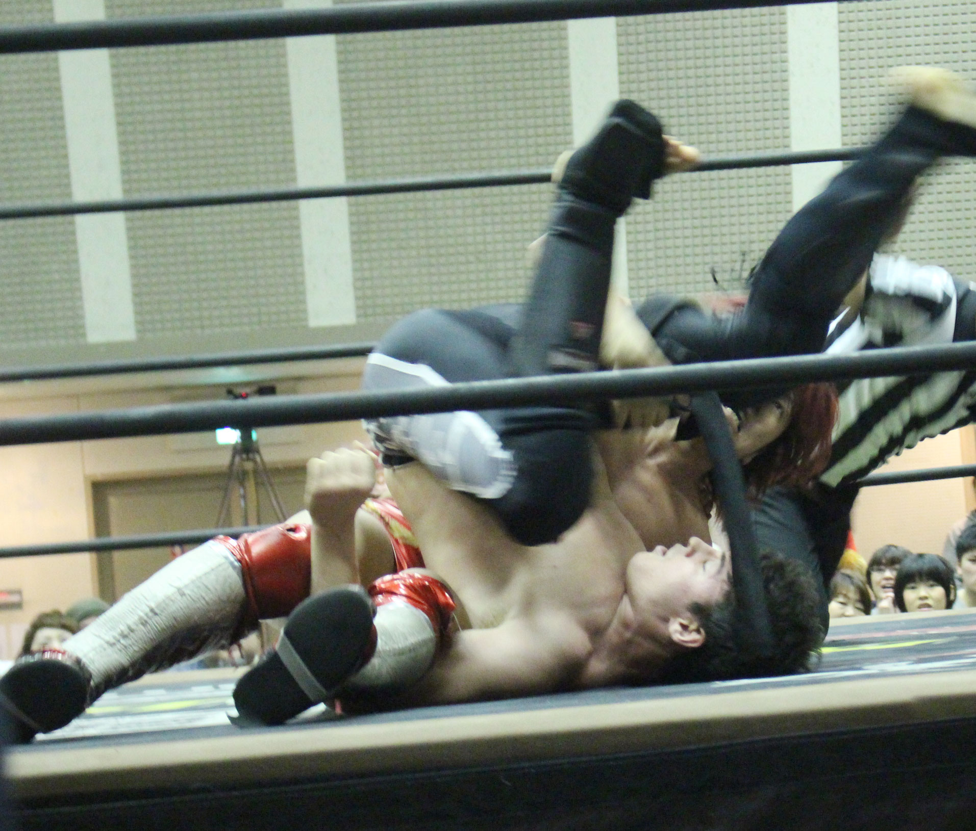 佐々木vs彰人はエクストリーム戦で主導権を握った佐々木はクロスフェースを狙うが、彰人はダブルニークラッシャーからドラゴンスクリュー、足横須賀と足攻めで反撃、アンクルホールドで追い詰める。しかし佐々木はレフェリーと彰人を交錯させてから、彰人をイスで殴打、ダイビングエルボードロップを投下する。