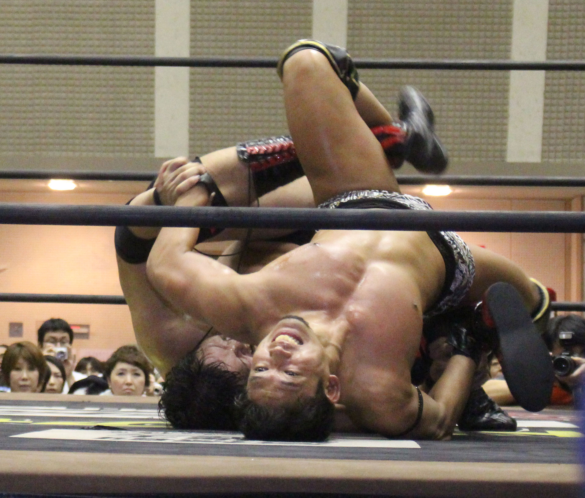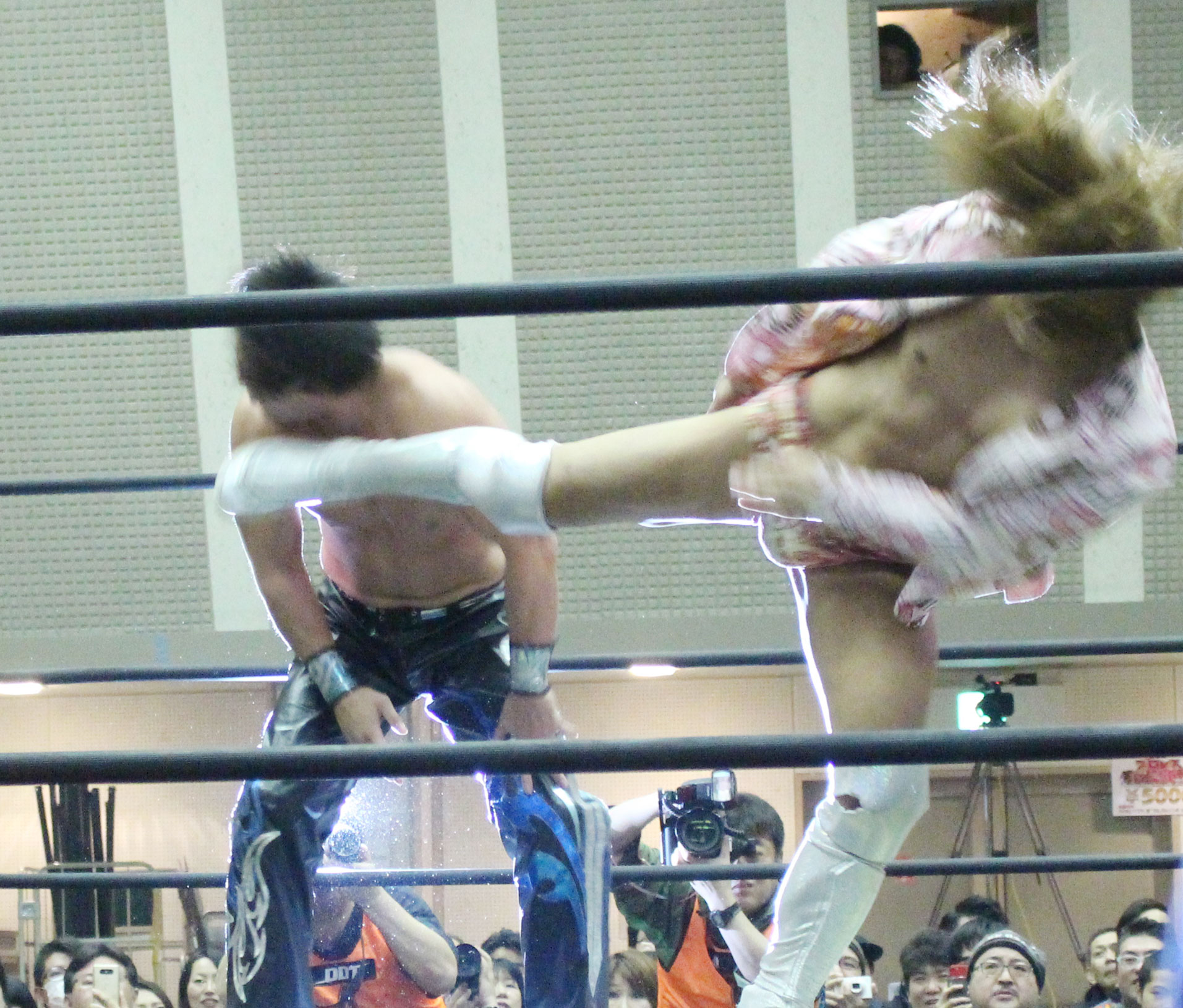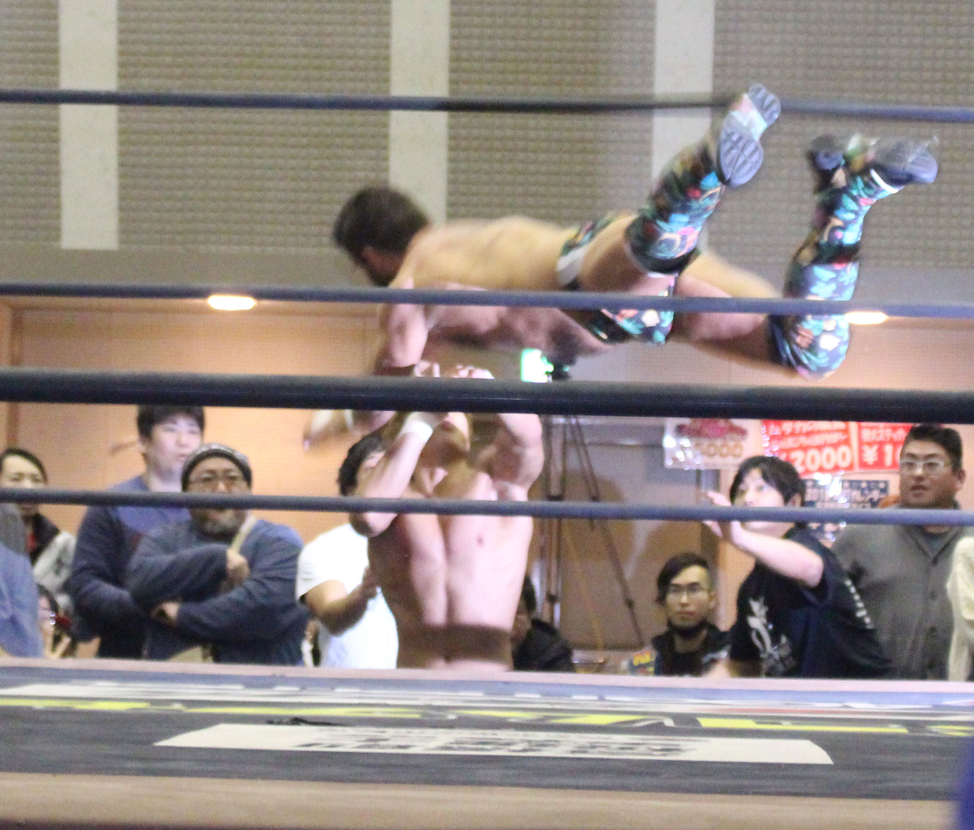 劣勢の彰人をエプロンに出した石川はパイルドライバーを狙うが、堪えた彰人は足めがけての低空ドロップキックから、エプロンでの足横須賀を敢行、これで一気に失速した石川をアンクルホールドで捕獲も、石川も低空ドロップキックを狙う彰人をフットスタンプで潰すと、コブラツイストで捕獲、しかし彰人はレッグロックで切り替えし、足横須賀から完璧足四の字固めを狙うが、決まる前に石川はロープに逃れる。