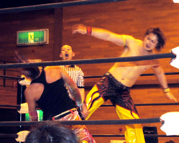 ハルクvs堀口はハルクが今までの迷いを断ち切ったのように生きのいいファイトを展開、カッコよさの中にラフを織り交ぜるなど試合の幅も広がってきている。終盤も堀口がバックスライド・フロム・ヘブンを連発したが、冷静にクリアしたハルクがファーストフラッシュで完勝。ところが第2試合でしゃちほこBOYを降したYAMATOが乱入、ハルクを蹴散らした後で堀口を襲撃、オープン・ザ・ドリームゲート王座への挑戦者として堀口を指名した。YAMATOはKOG1回戦で堀口と対戦したが堀口がバックスライドで逆転勝ちを収めた、YAMATOにしても王者としてだけでなくマッドブランキーのリーダーとしても面目を潰されただけに、KOGの優勝者より先に堀口を叩き潰すということなのか、堀口もKOGは2回戦で脱落となったが思わぬところでチャンスが巡ってきたようだ。