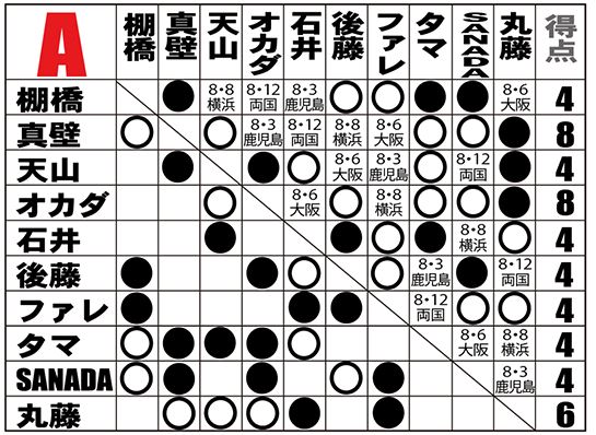 折り返しを迎えたAブロックは真壁が敗れたためオカダと並び1敗でトップ、2敗で丸藤が追いかける展開となった、Aブロックの次の公式戦は8・3鹿児島、棚橋vs石井、天山vsファレ、丸藤vsSANADA、後藤vsトンガ、そしてオカダvs真壁のトップ同士の直接対決が組まれている。オカダvs真壁が事実上の天王山となるのか?