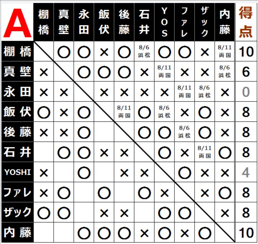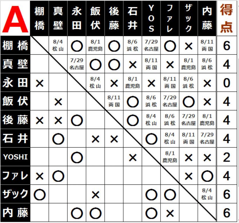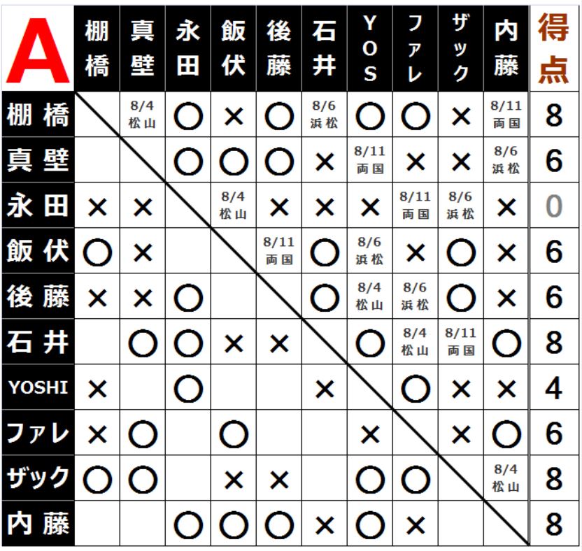 [2勝1敗=4点]○棚橋弘至(14分47秒 片エビ固め)[3敗=0点]×永田裕志