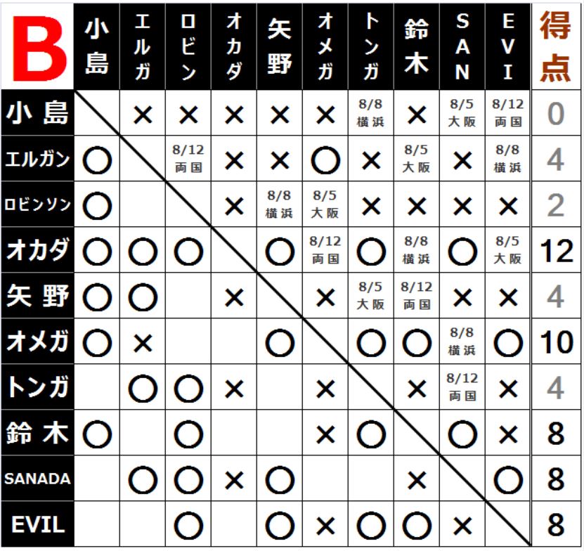 [2勝1敗=4点]○EVIL(10分27秒 片エビ固め)[1勝2敗=2点]×タマ・トンガ