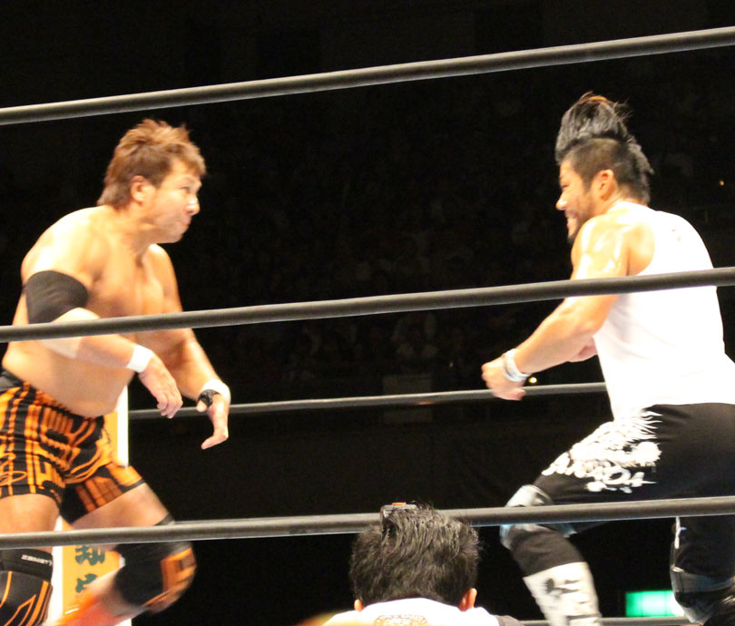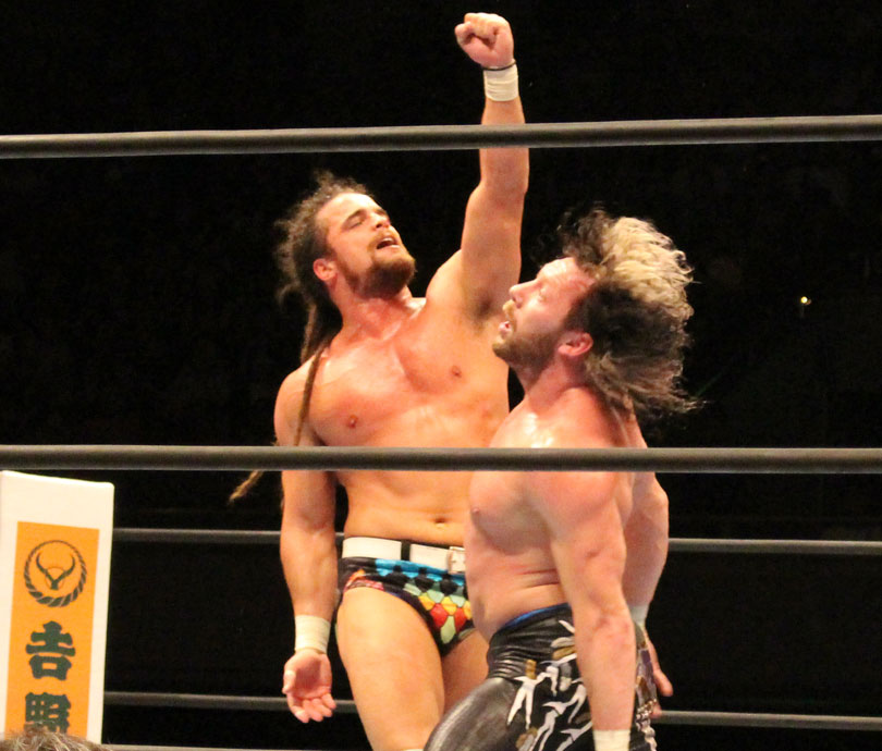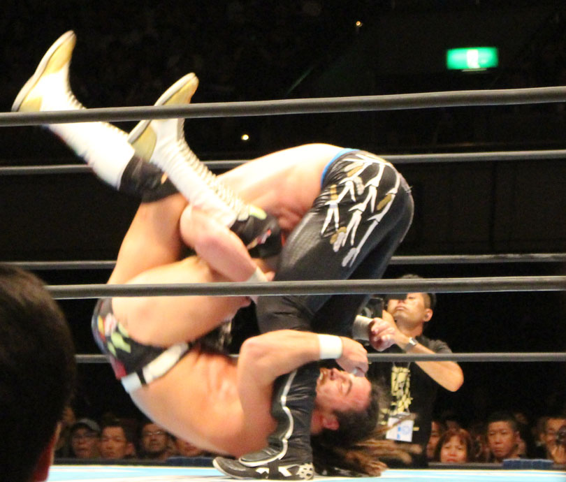 リングに戻ったケニーは内藤の首筋めがけてミサイルキック、高速ドラゴン狙いは内藤が張り手で逃れるも。ケニーは強引にジャーマンで投げてから蒼い衝動、ピストルサインからVトリガーは内藤がかわしてジャーマン、だがケニーが着地してから突進も内藤はトルネードDDTで突き刺す。