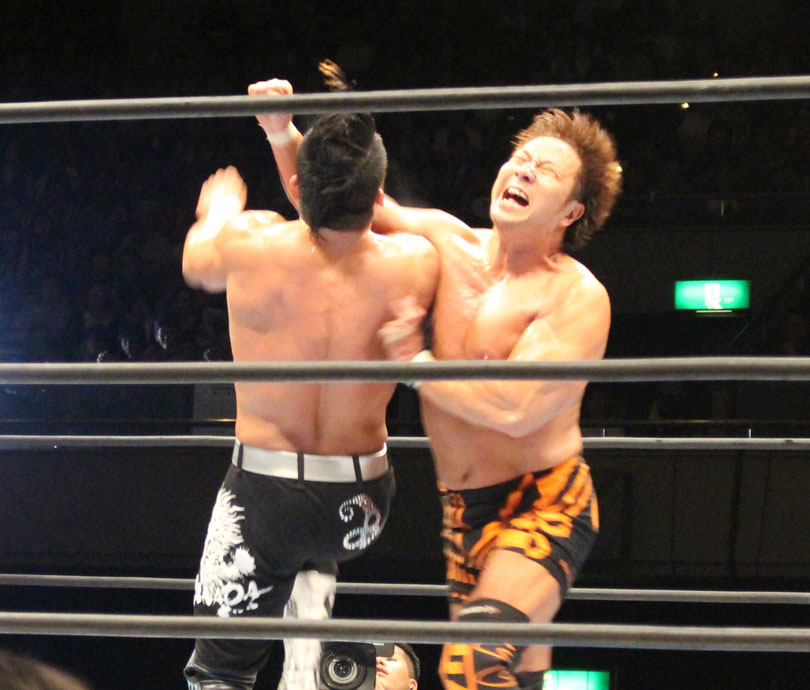 内藤のジャンピングエルボーアタックをキャッチした永田が大中西ジャーマンから豪快なバックドロップで投げ、バックドロップホールドは内藤が阻止も永田は顔面へのニーから突進も、内藤が浴びせ蹴りで迎撃してジャーマンで返し、張り手合戦となって永田が競り勝つも、スロイダー狙いは内藤がジャンピングエルボーアタックからデスティーノで勝負に出るが、だが永田は白目式腕固めで捕獲する。