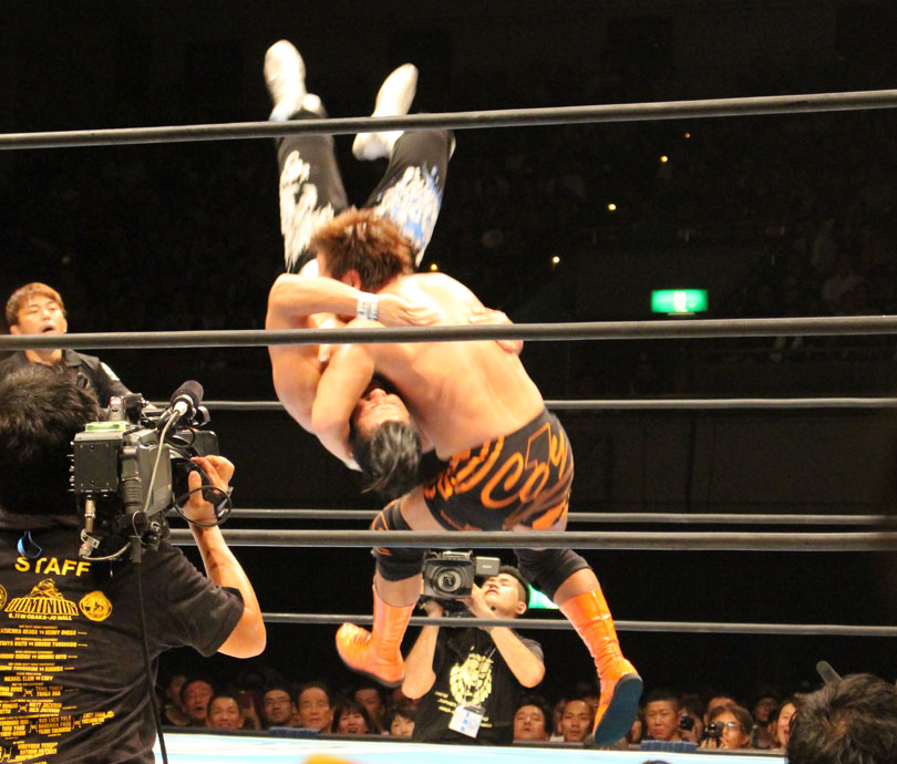 エルガンはラリアットを狙うが、鈴木は脇固めで捕獲して腕十字へと移行、場外へ逃れてもタイチ、デスペラードの攻撃を受け、リングに戻っても鈴木が腕十字から三角絞めで捕らえるなどして追い詰めにかかるが、強引に持ち上げたエルガンはパワーボムで投げ捨てる。