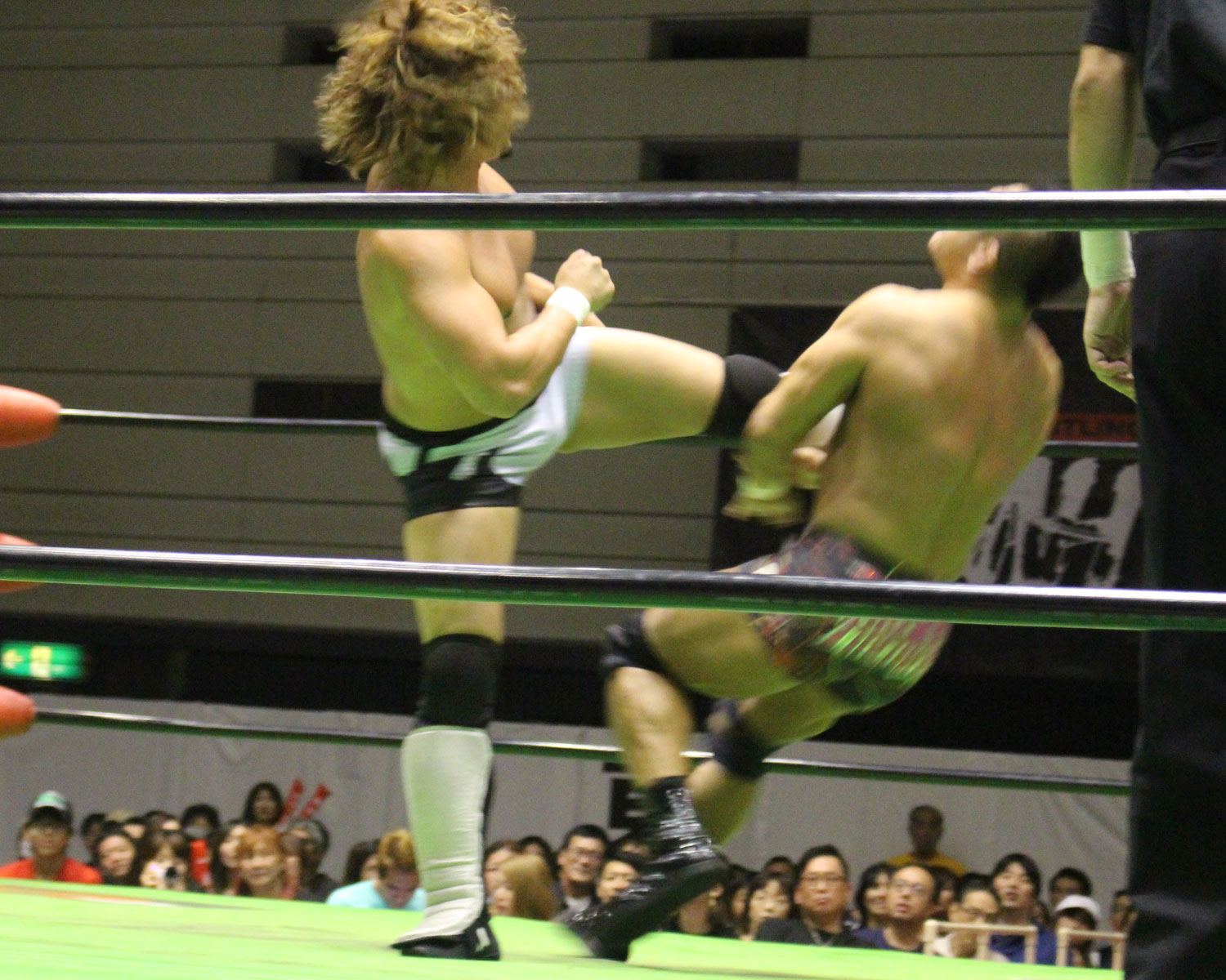今度はYO-HEYが顔面Gからスーパー顔面Gを狙うが、かわされたところでYO-HEYが丸め込みが、HAYATAが崩したのか、双方とも両肩が着いてダブルフォールとなり3カウント、まさかの結末に館内は静まり返る。しばらくして拍手が起きたが、自分的には結末を含めて物足りなさを感じざる得なかった。