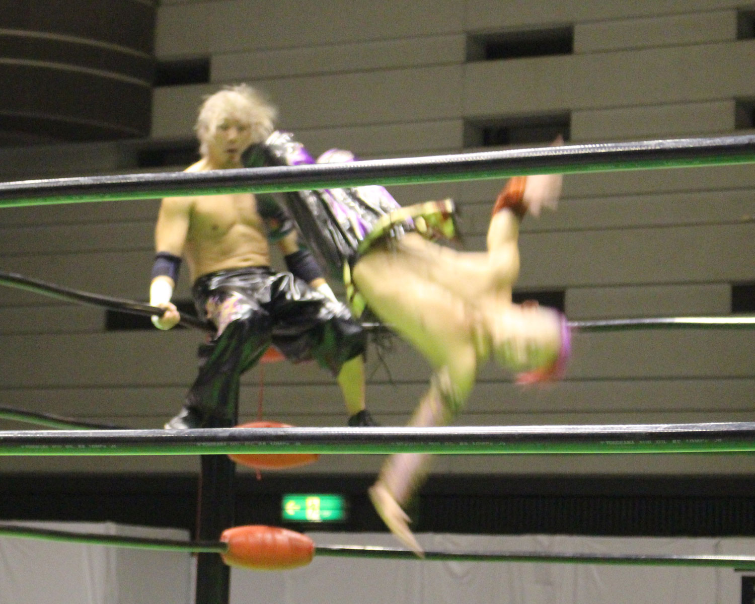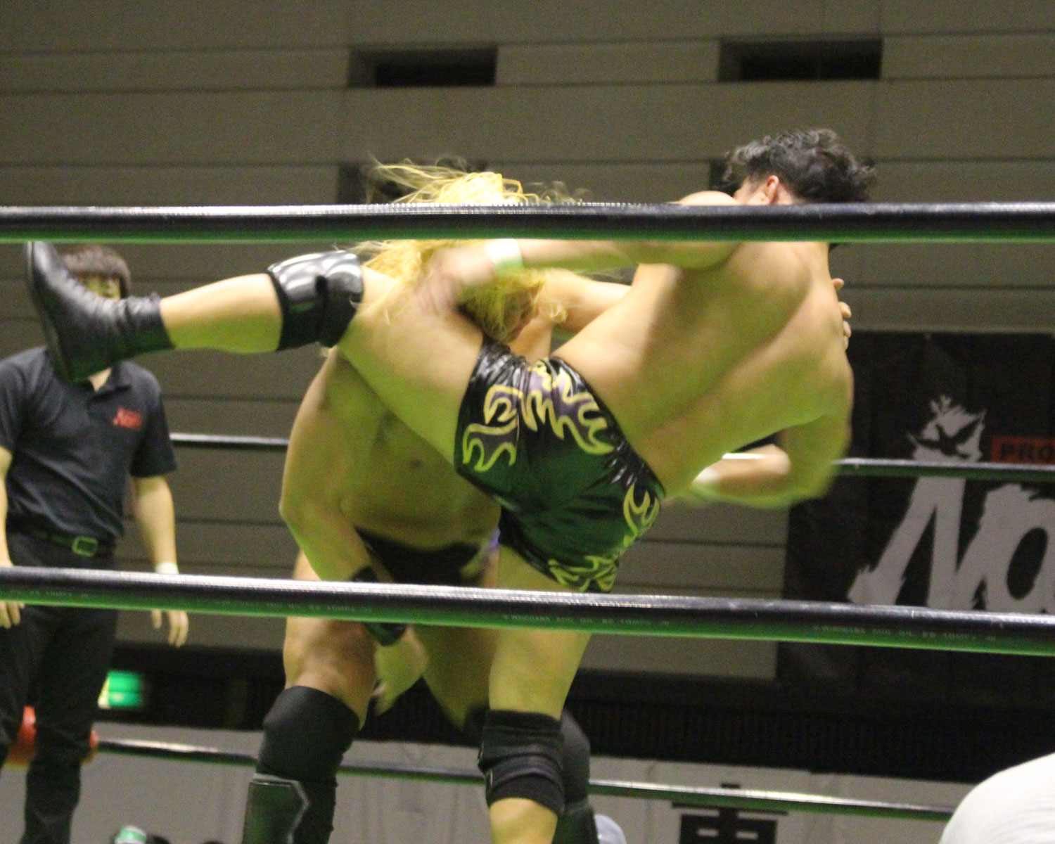 「GLOBAL Jr. LEAGUE 2018」公式戦は、大阪大会ではRATEL'S同士の対戦が組まれ、BブロックではYO-HEYvsHAYATAの金髪夫婦対決が実現。YO-HEYは妙な手つきでからかうような探り合いを見せるが、HAYATAが舐めるなと言わんばかりにスーパーキックを炸裂させ、そのまま場外戦も、HAYATAが客席めがけてパワーボムを狙うと、YO-HEYはフランケンシュタイナーで逆に客席に叩きつけ、HAYATAは府立体育会館の固いイスに直撃となり大ダメージを追う。