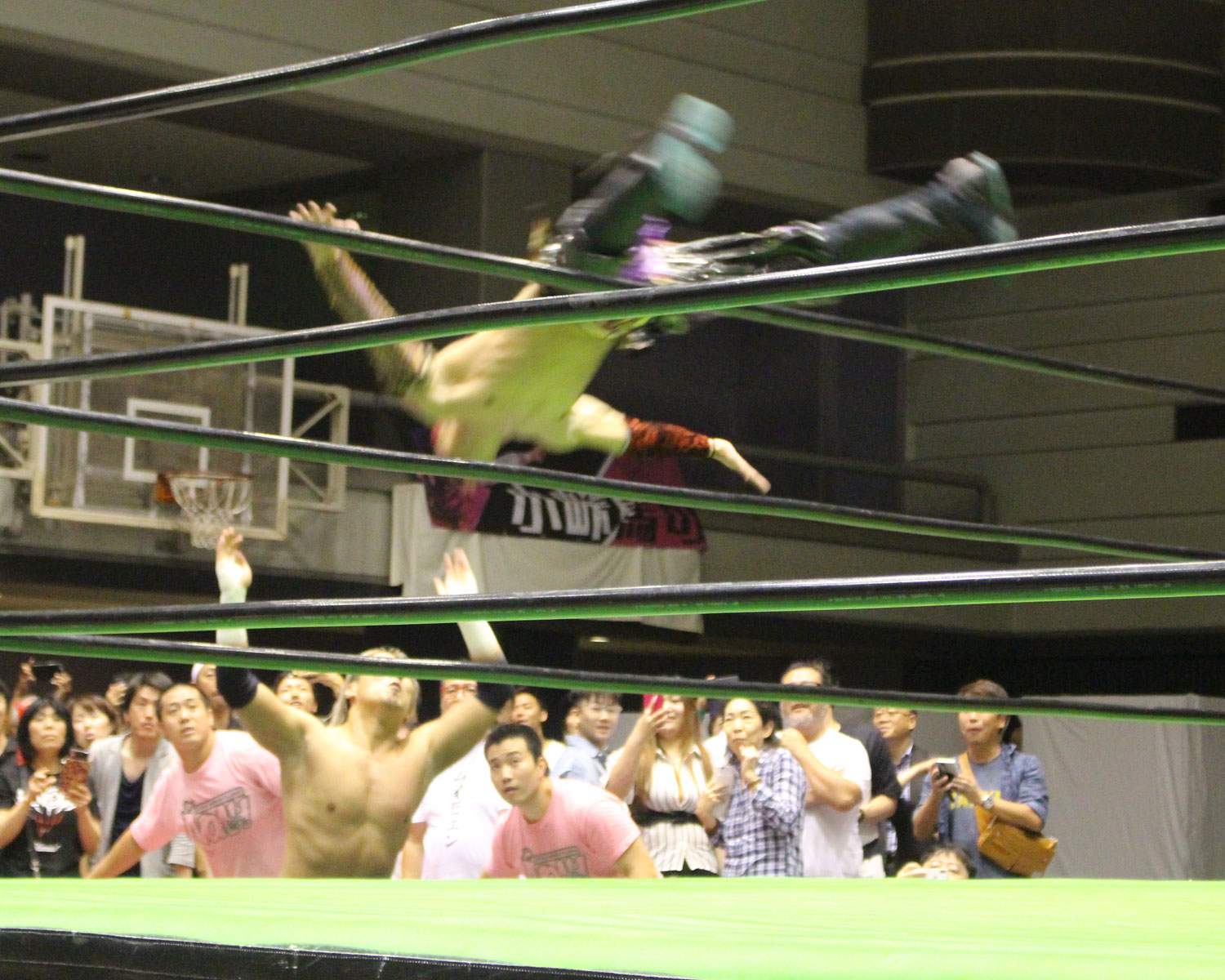 今日はNOAH大阪大会を観戦。日曜日ということで用意されたイスはほとんど埋まり超満員となったが、中には東方英雄伝の選手目当てのファンも少なくなくなかった。そして東方英雄伝の実質上オーナーである湯川剛氏も今日は観戦に訪れていた。そして今シリーズはジュニアリーグということで場外フェンスがなしとなっていた。