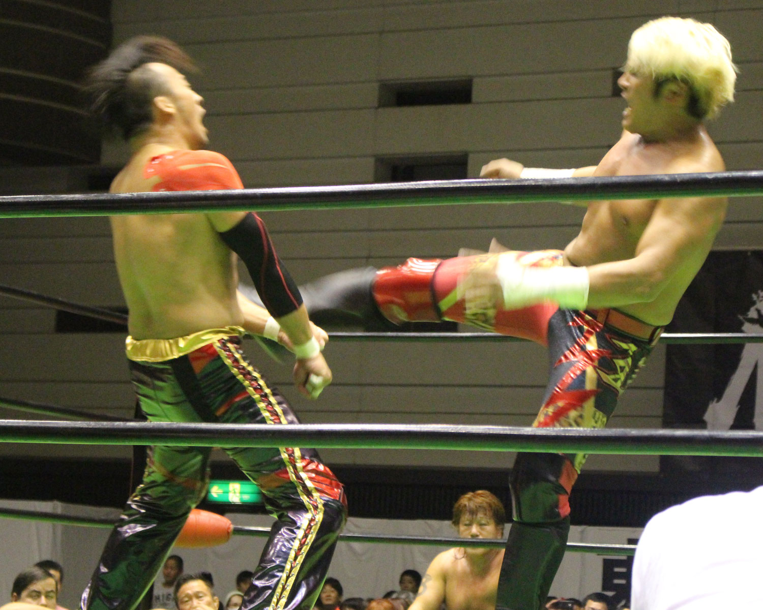 丸藤の側転からのドロップキックに対して、清宮もドロップキックで応戦、ジャーマンで投げるが、タイガースープレックス狙いは丸藤が堪え、清宮の串刺し狙いをかわした丸藤が串刺し虎王を炸裂させて、両者は交代する。
