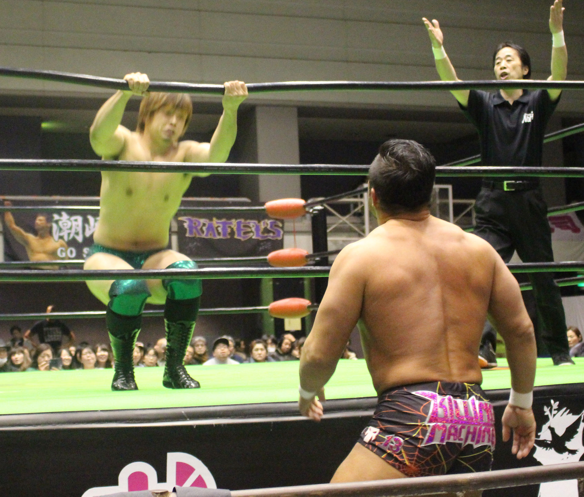 セミのジュニアタッグ選手権は王者のRATEL'Sが連係でHi69を捕らえるも、挑戦者のXXも石森のスワンダイブ式雷電ドロップで反撃してからHAYATAを捕らえて主導権を握る。しかしRATEL'SはYO-HEYに交代すると、YO-HEYがスピードでXXを翻弄、だがHi69に狙ったけてツイストオブフェイトが逃れられると、石森はRATEL'Sをまとめてスタナー&DDT、YO-HEYにリバーススプラッシュ式フットスタンプからハンドスプリングエルボーを狙う。ところがYO-HEYがドロップキックで迎撃すると、HAYATAがローリングセントーンからハンドスプリングエルボー、YO-HEYもミサイルキックで続き、HAYATAが入って石森にトータルレンジャーから合体ツイストオブフェイト、そしてバンブードラゴンフライを投下も、かわされて自爆となってしまう。
