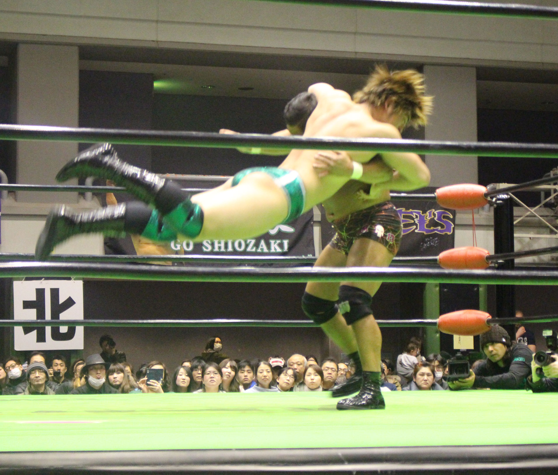 大阪大会はジュニア二大タイトルマッチが組まれ、まずメインはGHCヘビー級王者の原田に大原が挑戦、昨年1月の大阪大会も同一カードが組まれ、この時は大原が王者で原田が挑戦者という図式だったが、今年は立場が入れ替わっての対戦となった。