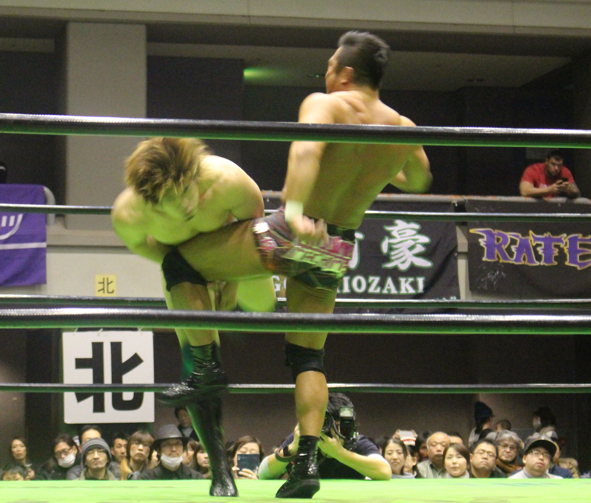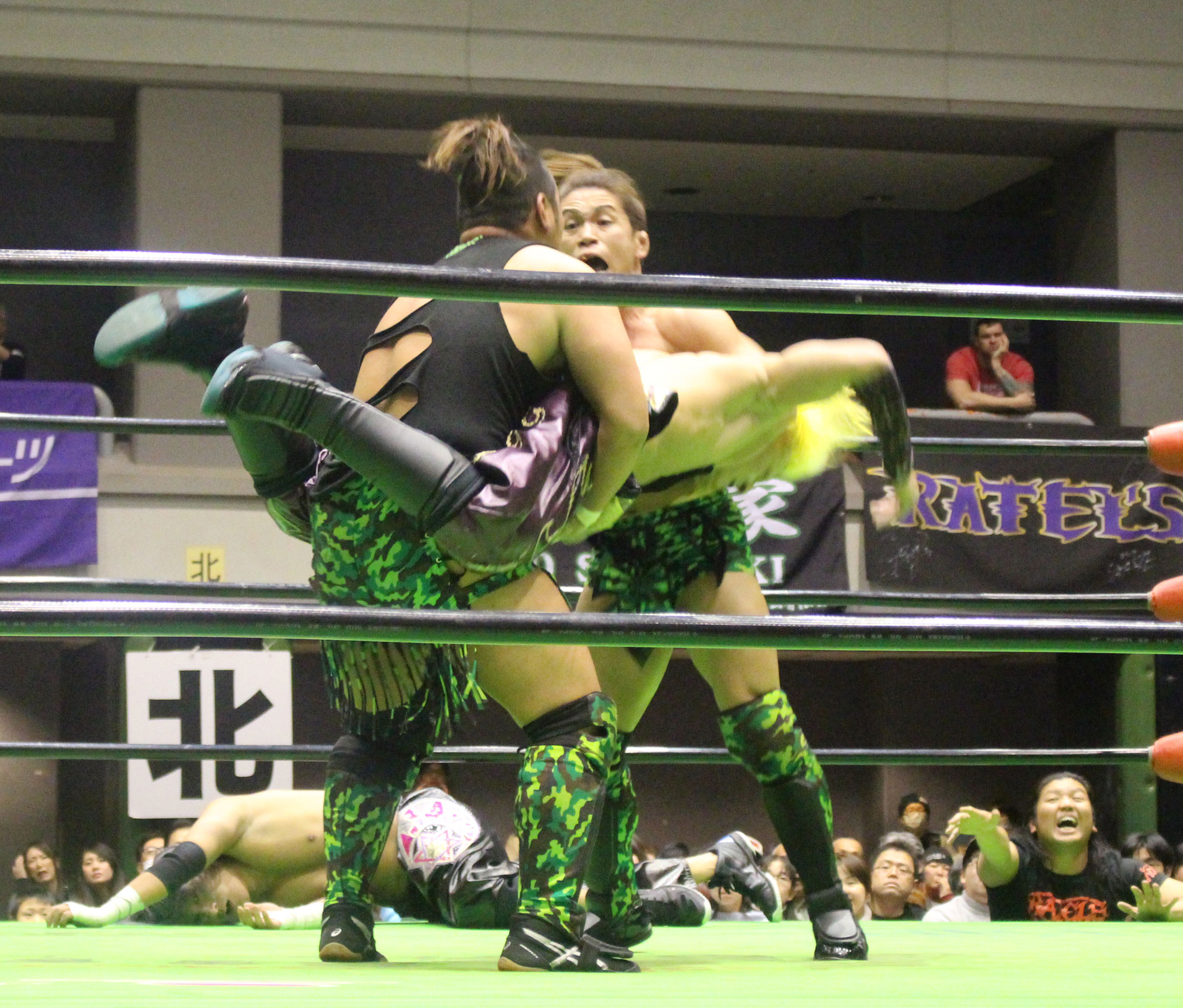 勝負に出た原田はニーアッパーから片山ジャーマンを決めるが、大原はカウント2でキックアウトし、原田が突進すると今度は大原が旋回式エメラルドフロウジョンを決めると、ターンバックルめがけてのバックブリーカーを敢行、肩乗せ式のバックブリーカー、前方旋回式バックブリーカーと腰攻めからムイビエンで捕獲も、脇腹攻めが充分に聴いていたせいか完全には極めきれずロープに逃れられてしまう。