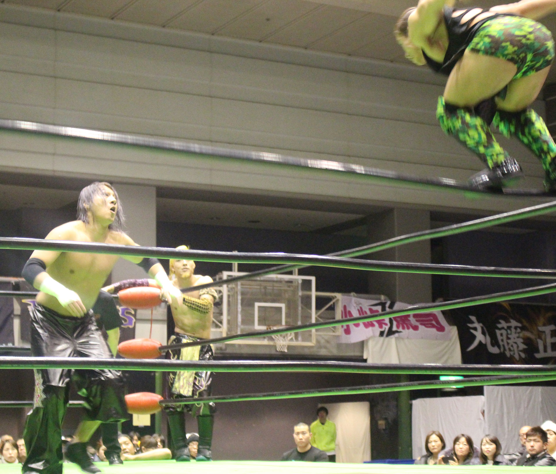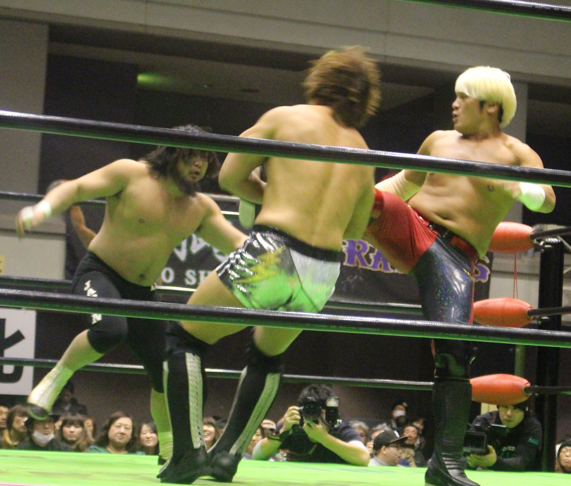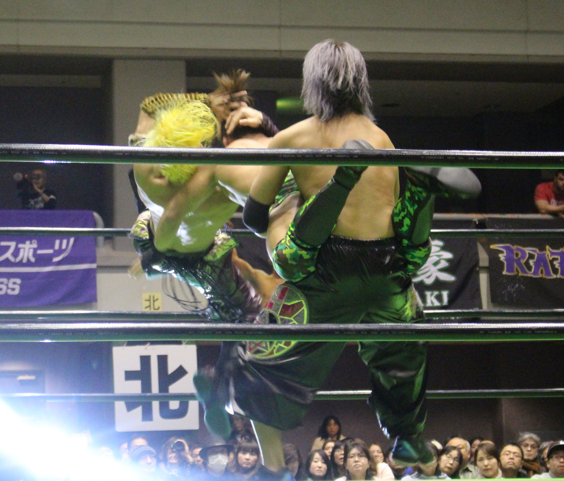 ここで交代を受けたHi69はYO-HEYにトランスレイブからみちのくドライバーで突き刺すと、ストゥーカ・スプラッシュを投下するが、YO-HEYは剣山で迎撃し、ソバットから突進するHi69に顔面Gを炸裂させてから、スーパー顔面Gを投下、だがHi69がかわすと、石森が入ってダブルトランスレイブ、ダブルエキサーII狙いはHAYATAがカットに入るも、石森はYO-HEYをセカンドロープ上にセット。場外めがけてスライディングしながら足をすくって後頭部を叩きつけ、石森の450°スプラッシュで勝負に出るが、かわされて不時着した石森にHAYATAがみちのくドライバーで突き刺す。