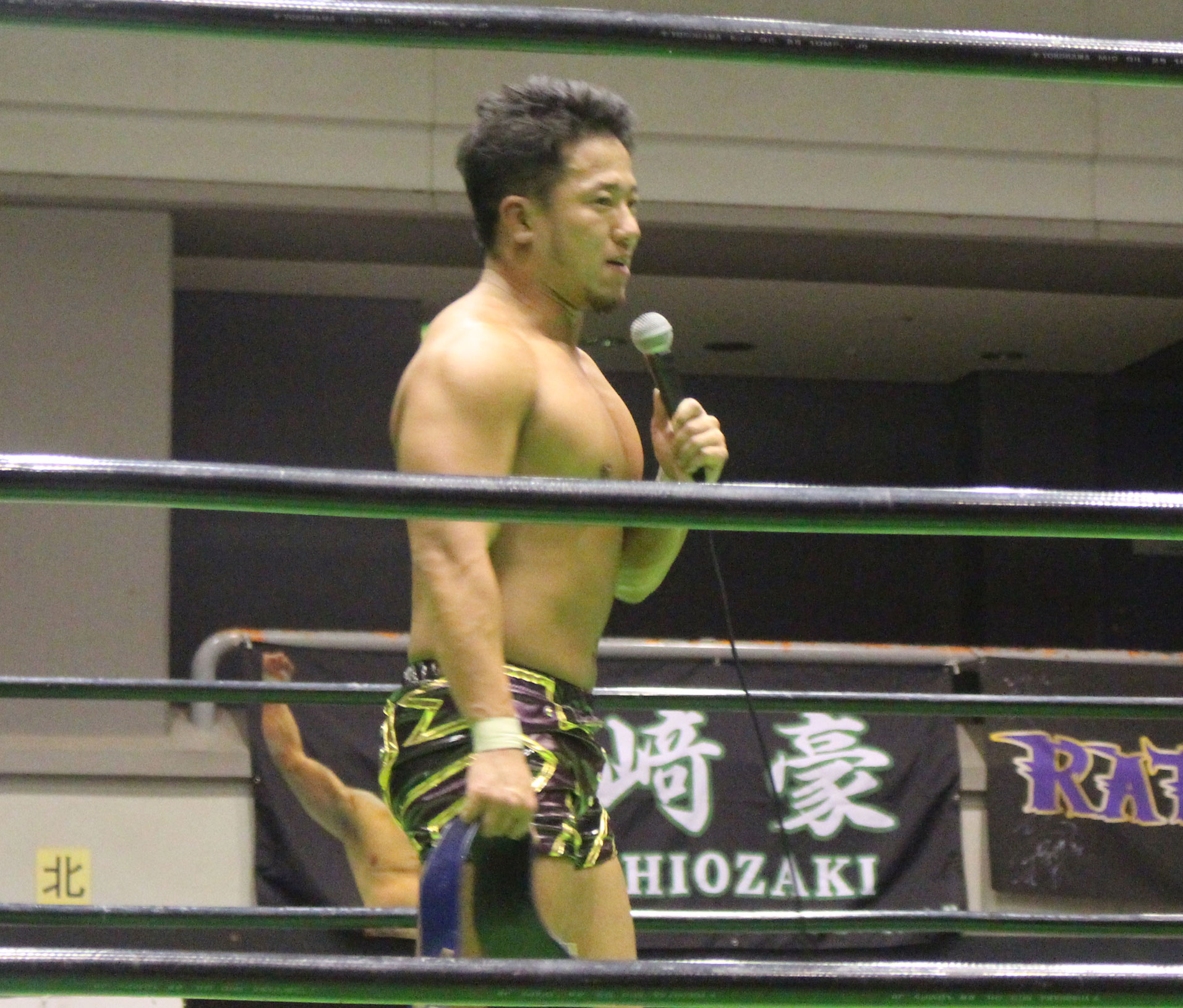 (試合終了後、HAYATAは無言のまま原田のベルトを指差して挑戦を表明。すると大原の介抱から戻ってきた熊野もリングに駆け上がる)