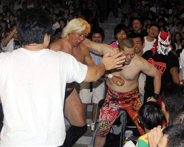 小橋引退試合以外での注目カードは第6試合の丸藤、みのるvsノー・フィアー、共にGHCタッグの歴代王者だが丸藤と大森が対戦するのも久しぶり、三沢光晴の存命時には許されないカードでもあるが、小橋の引退興行とプロレス界の現在の流れを考えると時の流れが許したカードなのかもしれない。