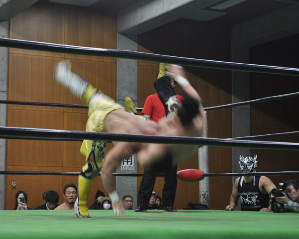 セミのGHCジュニアヘビー級選手権は石森がティヘラで金丸を場外に追いやってからハリケーンラナで先手を狙うが、ハンドスプリング狙いを金丸がキャッチしてバックドロップで叩きつけると、石森が場外に逃れたところでTAKA、デスペラードが襲撃、鉄柵ギロチンで形勢を逆転させ、リングに戻ってからショルダースルーから腰攻めとじっくりとした攻めで主導権を握る。