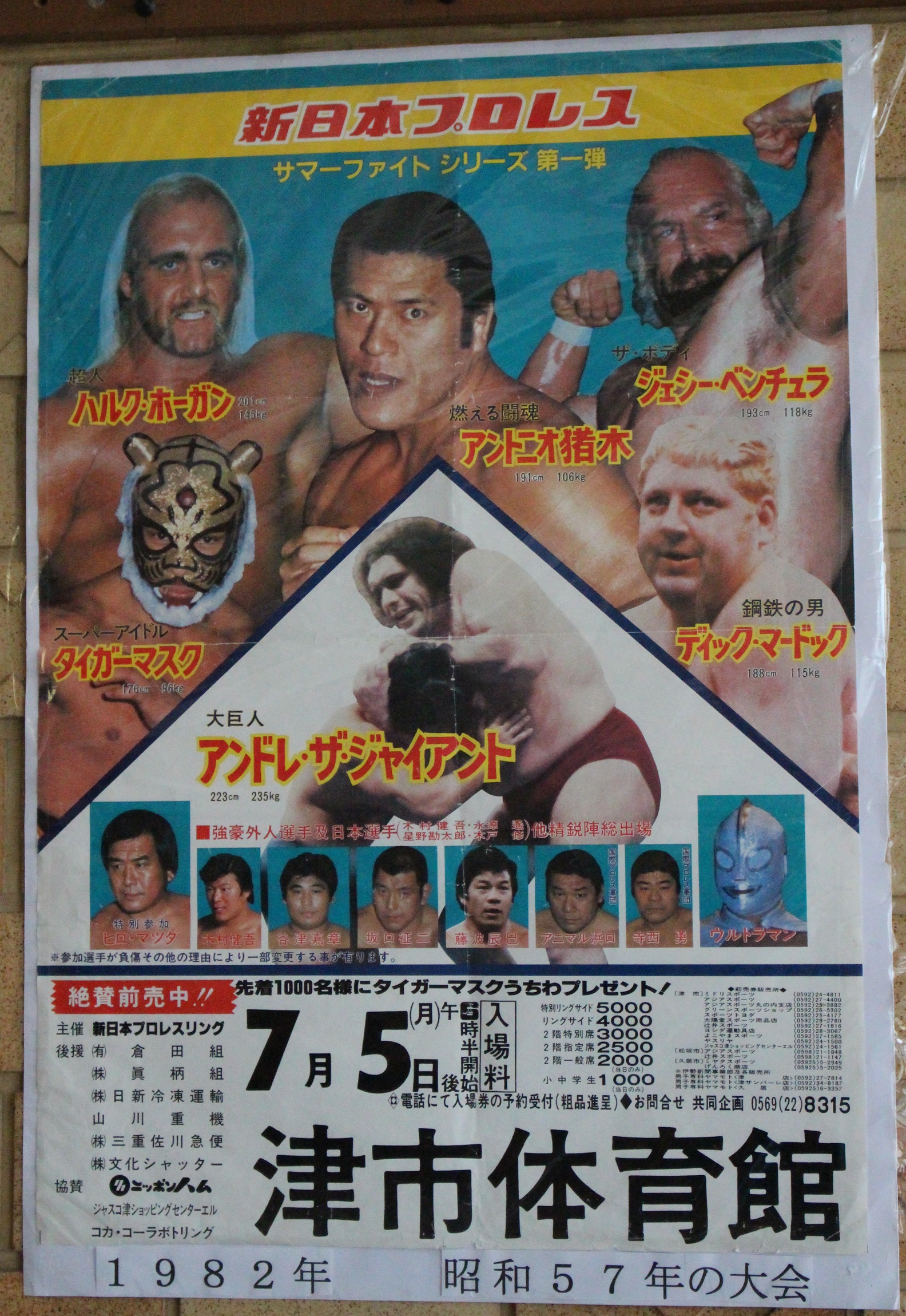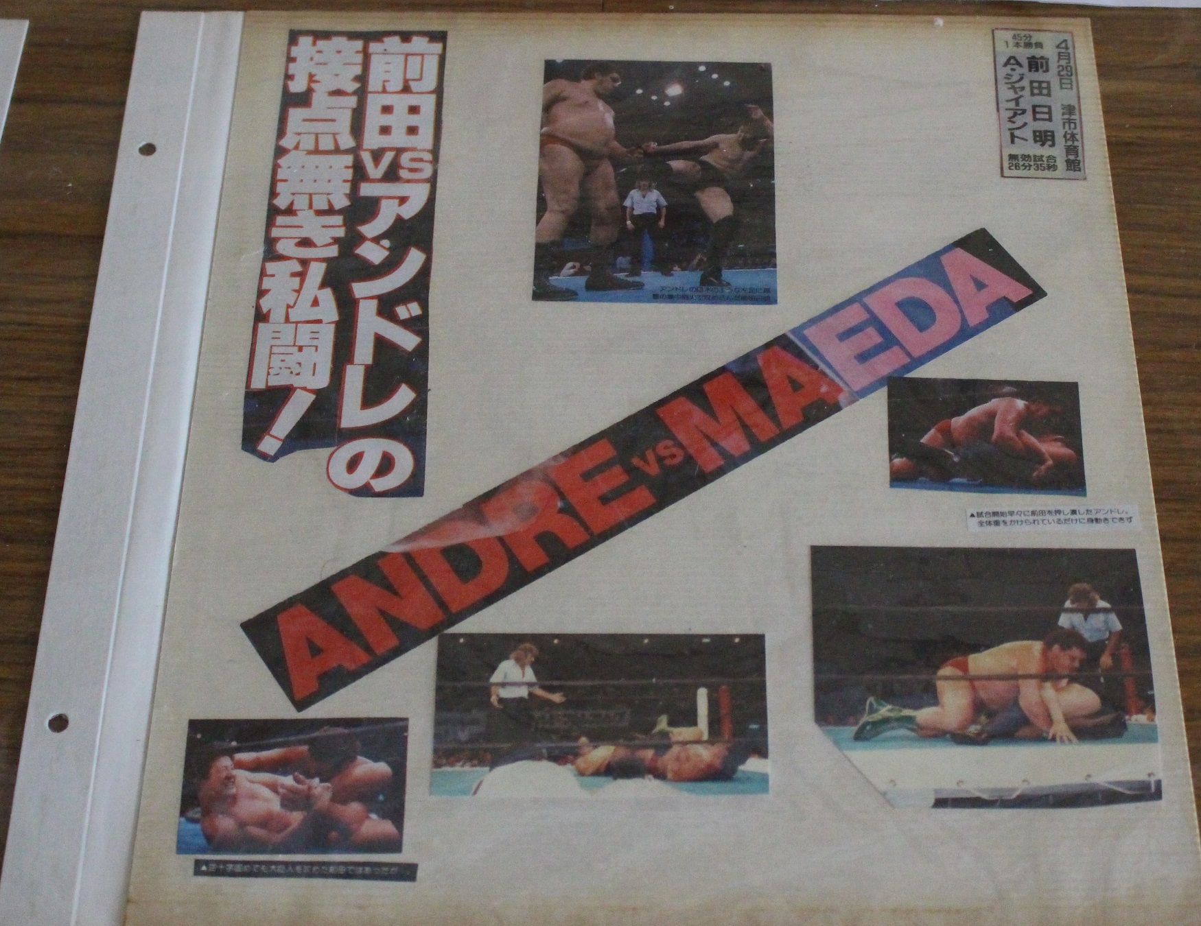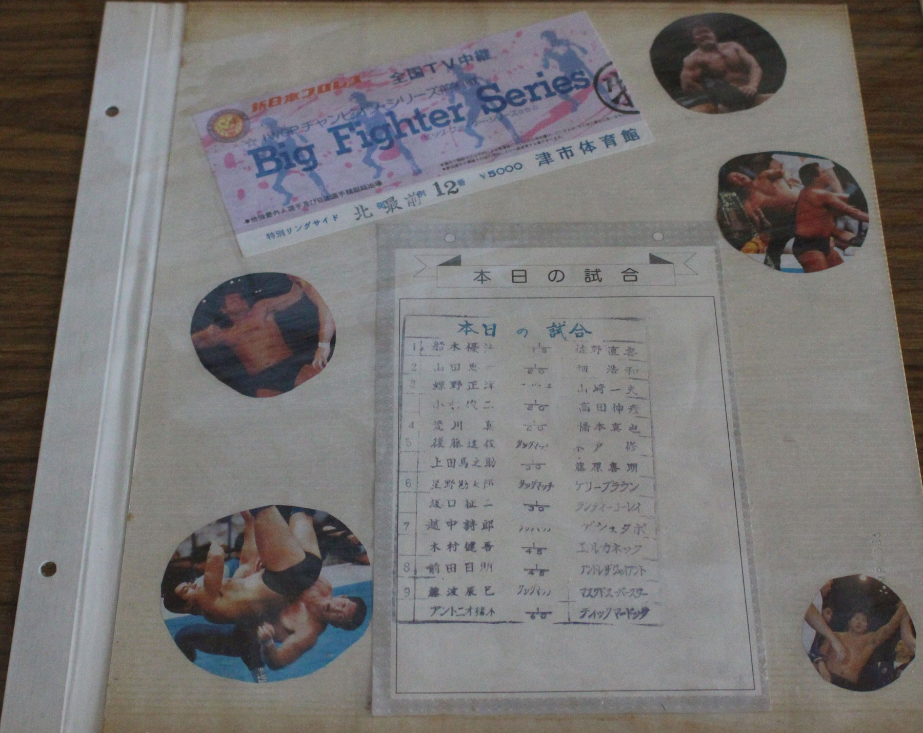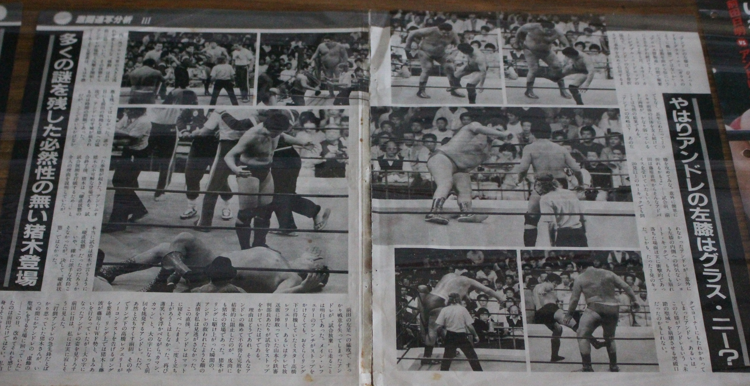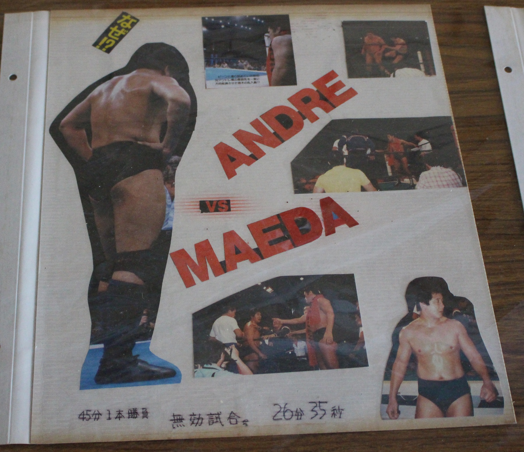 津市体育館で行われた前田日明vsアンドレ・ザ・ジャイアント戦の記事やチケット半券、取り組み表も展示されていた。三重県の常打ち会場と言われながらも名勝負などなかったことを考えると、前田vsアンドレのいかにインパクトが大きかったか、実況の古館伊一郎氏は「凡戦」としていたが、これだけ後になって語り継がれる試合になるとは古館氏や解説を務めていた山本小鉄氏も思ってみなかっただろう。